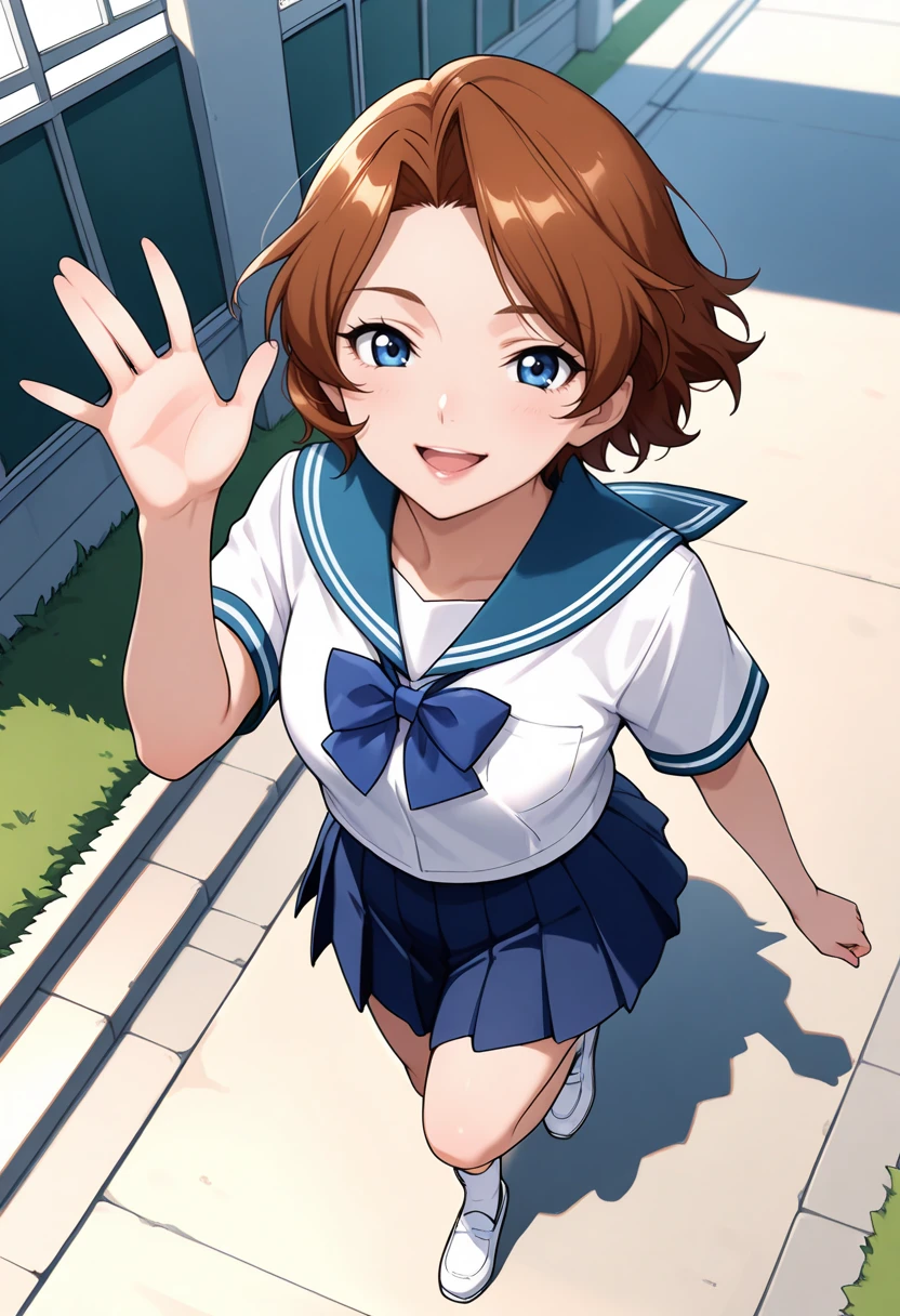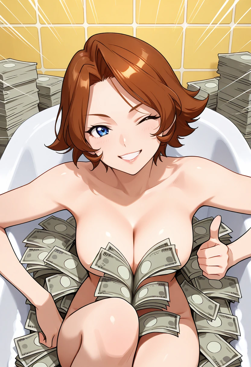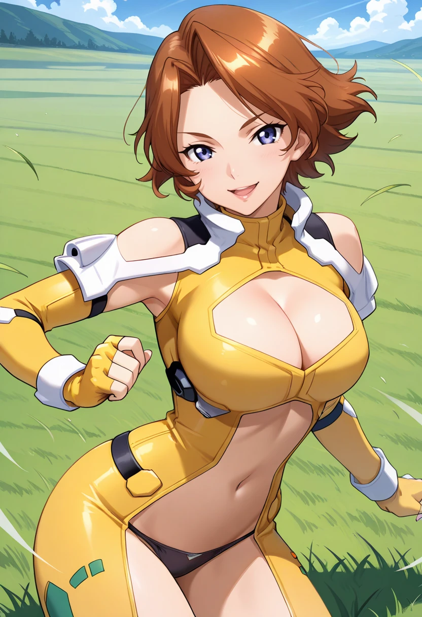 yellow bodysuit, detached sleeves, yellow fingerless gloves, cleavage cutout, navel cutout, black panties, bare thighs, brown hair, short hair, blue eyes, lips