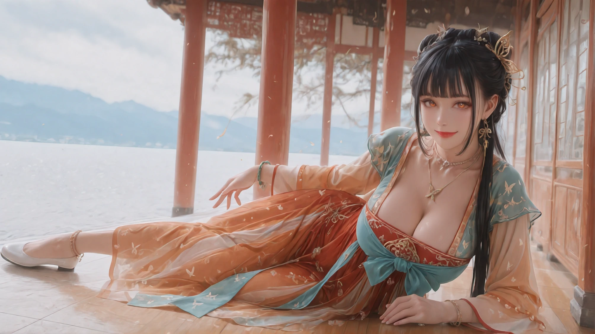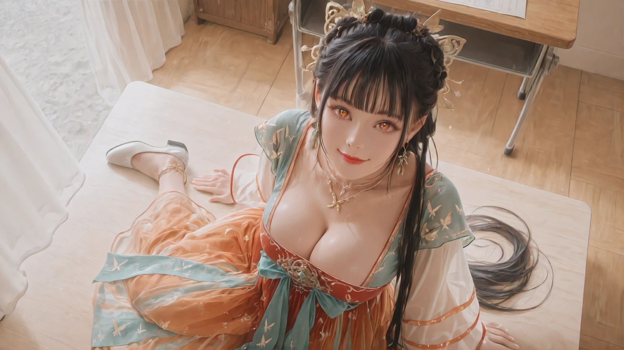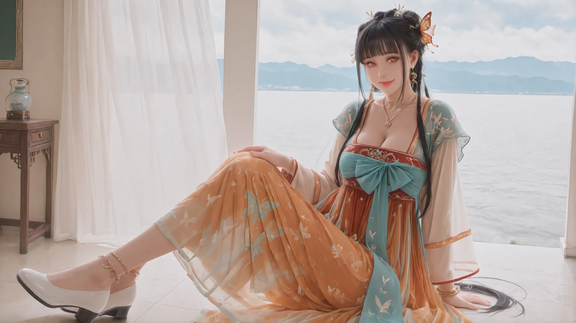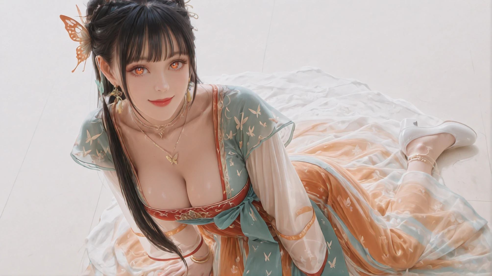 Sylvia's Cervisia: When Mortal Seamstress Weaves Divine Visions,dress,jewelry,chinese clothes,anklet,white footwear,necklace,long sleeves,hanfu,butterfly print,earrings,butterfly hair ornament,bracelet,lipstick