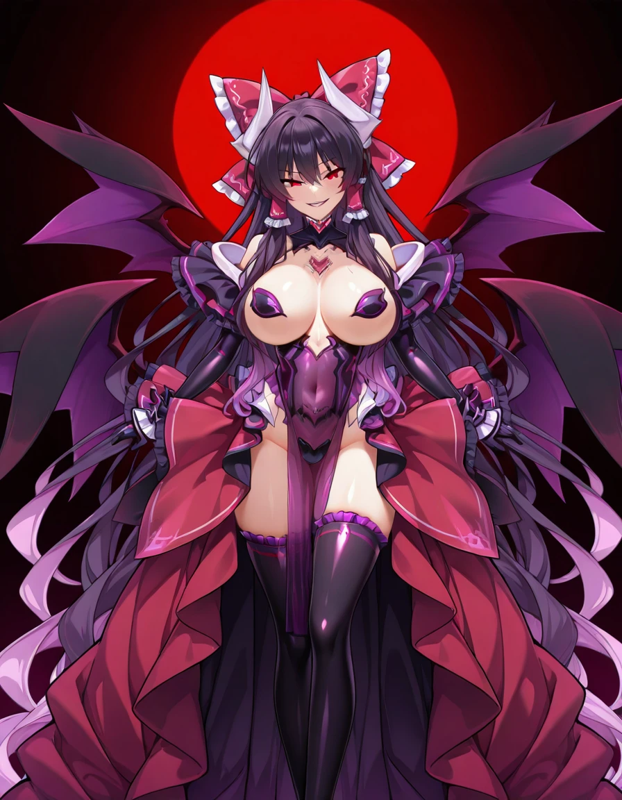 <lora:ルクスリアLuxlia_from_光翼戦姫エクスティアKouyoku_Senki_ExS-Tia-000010:0.8> luxlia_exstia, purple eyes, purple hair, very long hair, wings, horns, cleavage, pointy ears, demon girl, tiara, cleavage tattoo, slit pupils, frills, white demon horns,nipple pasties, revealing clothes, gloves, thighhighs, black thighhighs, demon tail, pelvic_curtain, ????? pasties, covered pubic tattoo, covered_navel