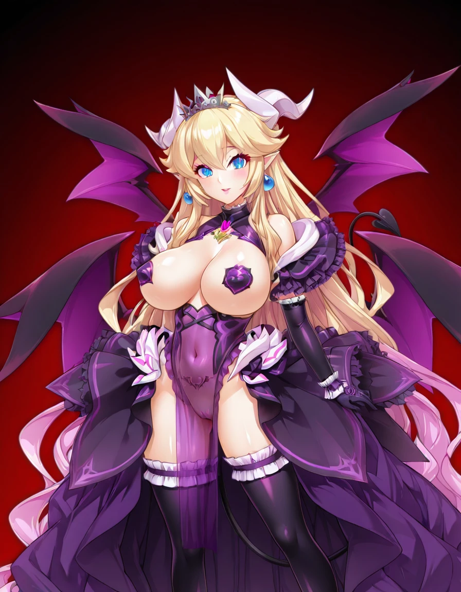 <lora:ルクスリアLuxlia_from_光翼戦姫エクスティアKouyoku_Senki_ExS-Tia-000010:0.8> luxlia_exstia, purple eyes, purple hair, very long hair, wings, horns, cleavage, pointy ears, demon girl, tiara, cleavage tattoo, slit pupils, frills, white demon horns,nipple pasties, revealing clothes, gloves, thighhighs, black thighhighs, demon tail, pelvic_curtain, ????? pasties, covered pubic tattoo, covered_navel,
