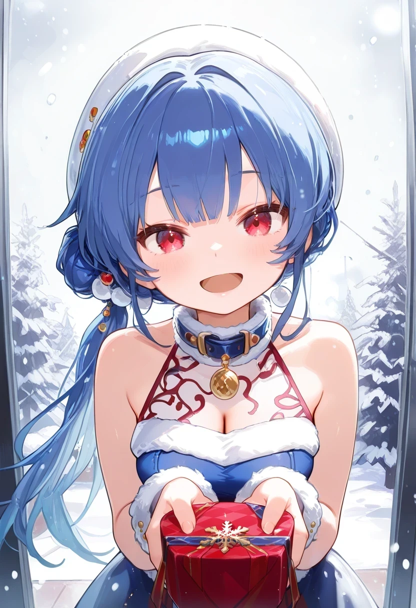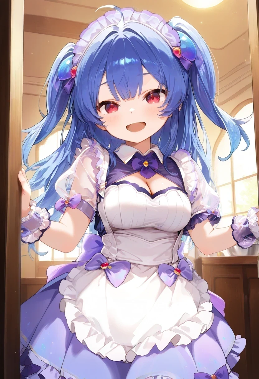 hair ornament,wrist cuffs,frills,two side up,maid headdress,puffy short sleeves,see-through sleeves,cleavage cutout,purple bow,Xmas: