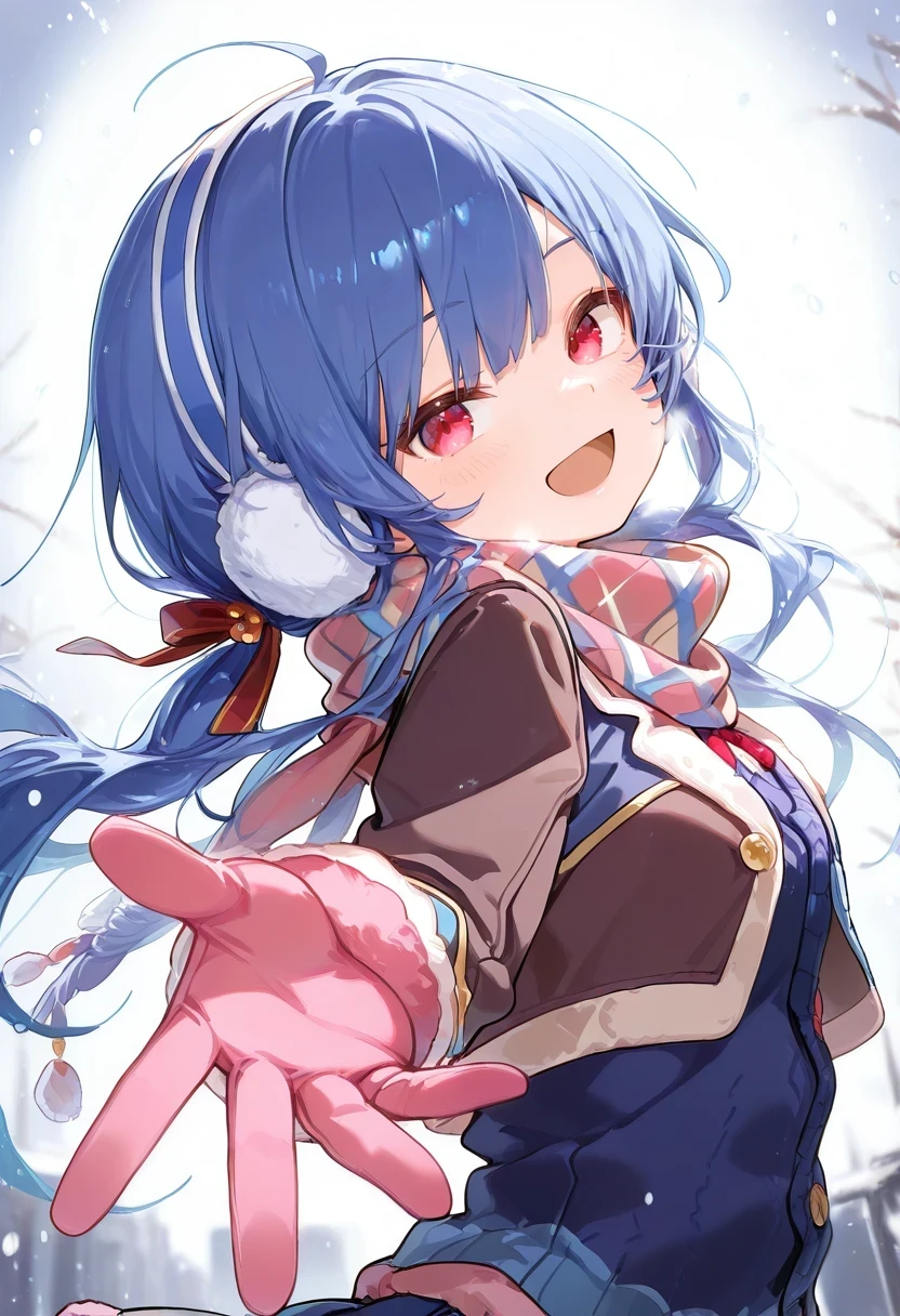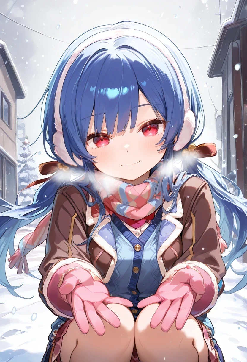 scarf,pink gloves,earmuffs,red ribbon,hair ribbon,low twintails,blue cardigan,brown jacket,cropped jacket,Maid: