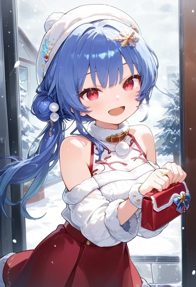 white hat,single hair bun,low side ponytail,bare shoulders,fur trim,collar,red skirt,white shirt,snowflake hair ornament,Summer: