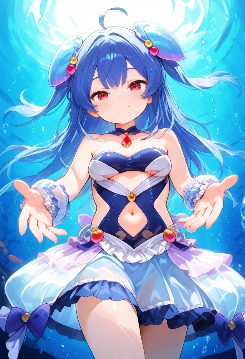 two side up,skirt,overskirt,frills,see-through clothes,bare shoulders,wrist cuffs,navel cutout,strapless,hip vent,hair bobbles,Uniform: