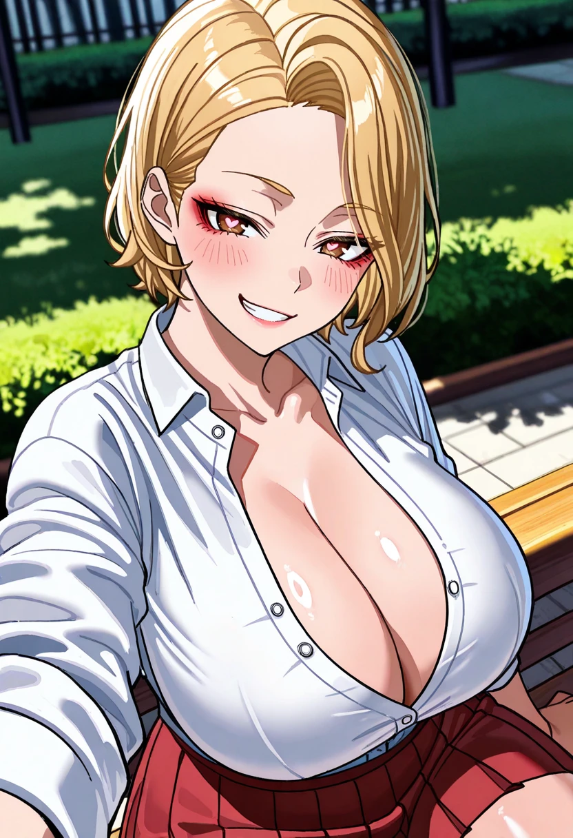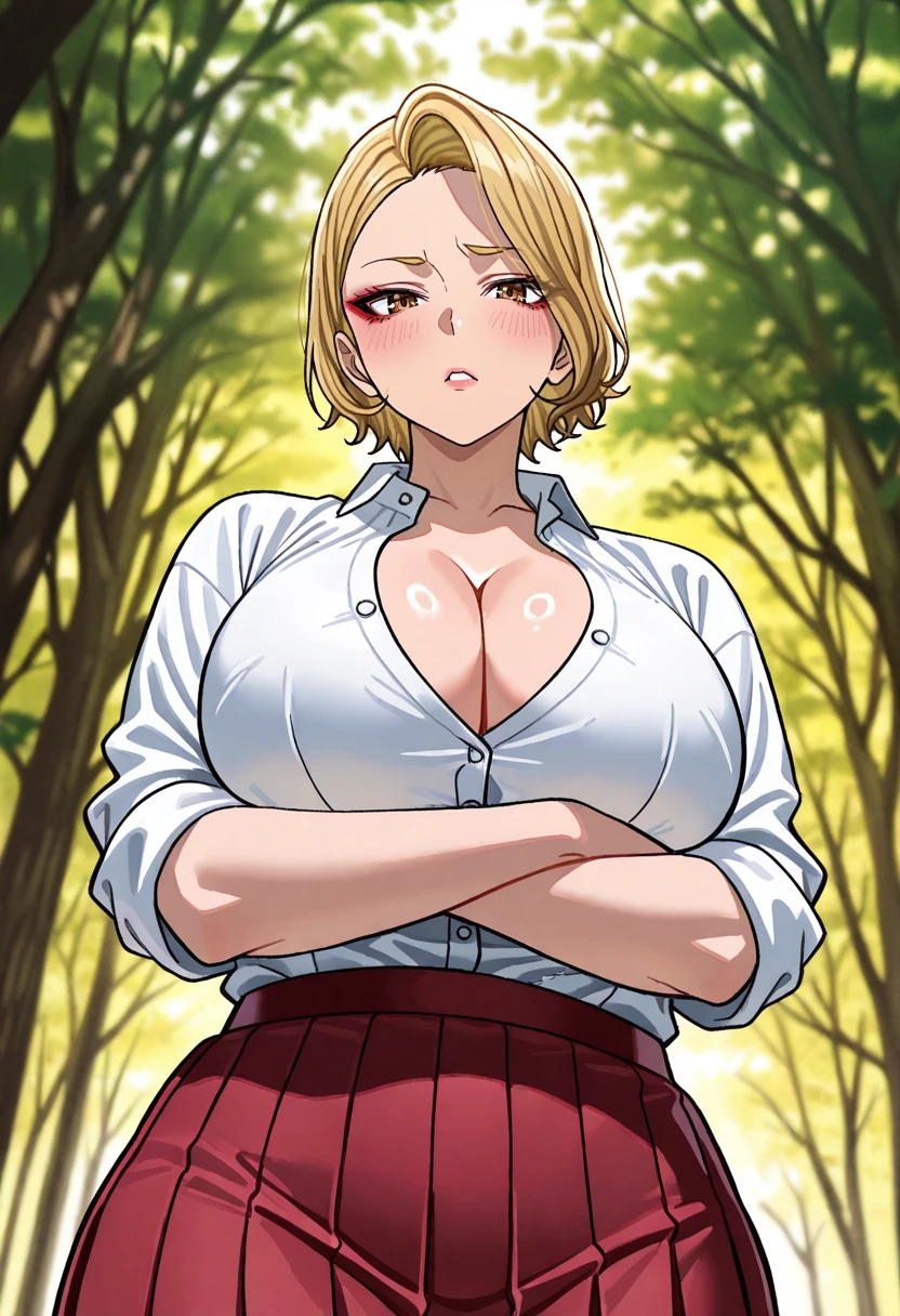 kuinasazanami,blonde hair,brown eyes,curvy,makeup,eyeshadow,short hair,hair behind ear,parted lips,huge breasts.
