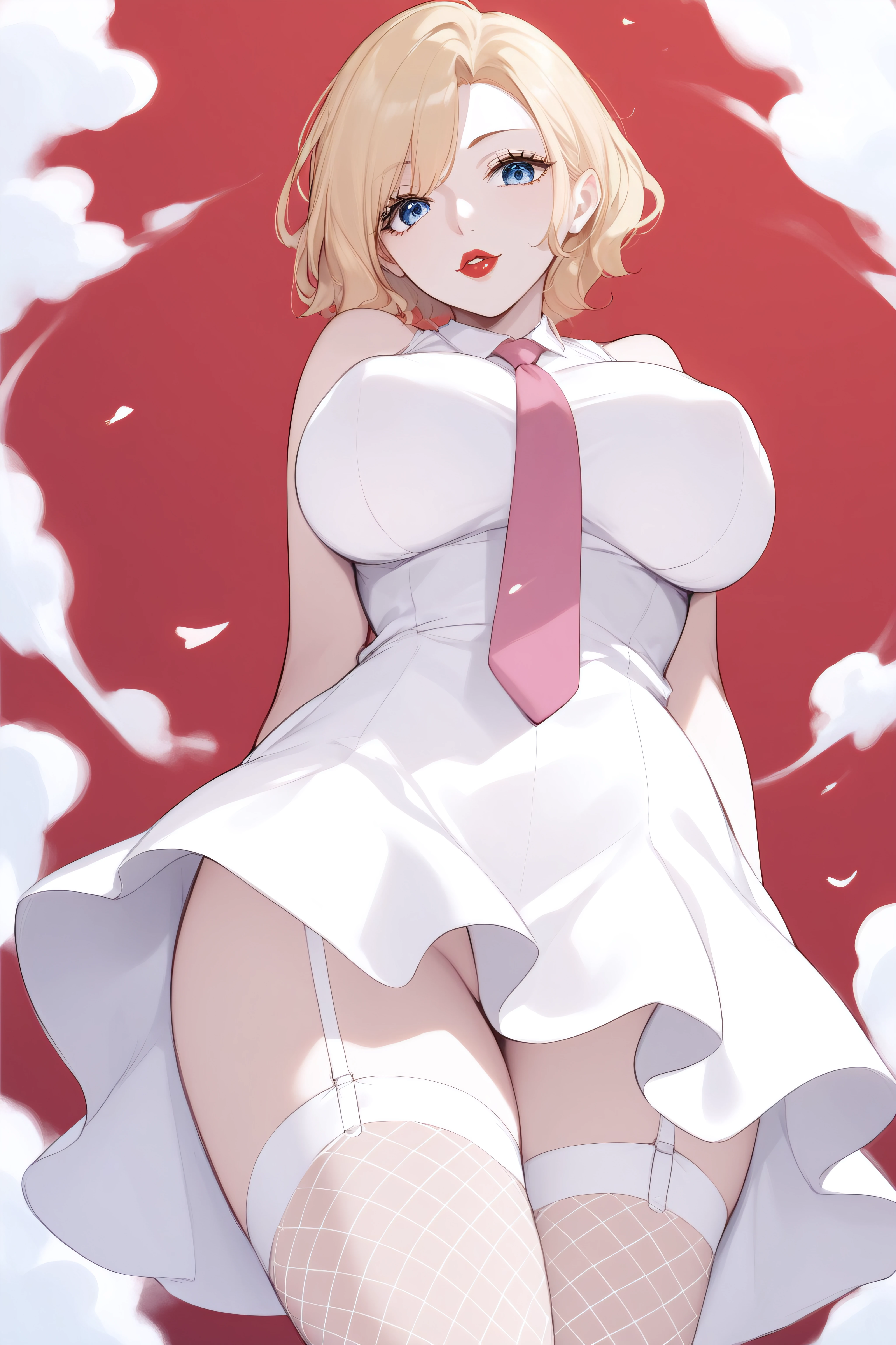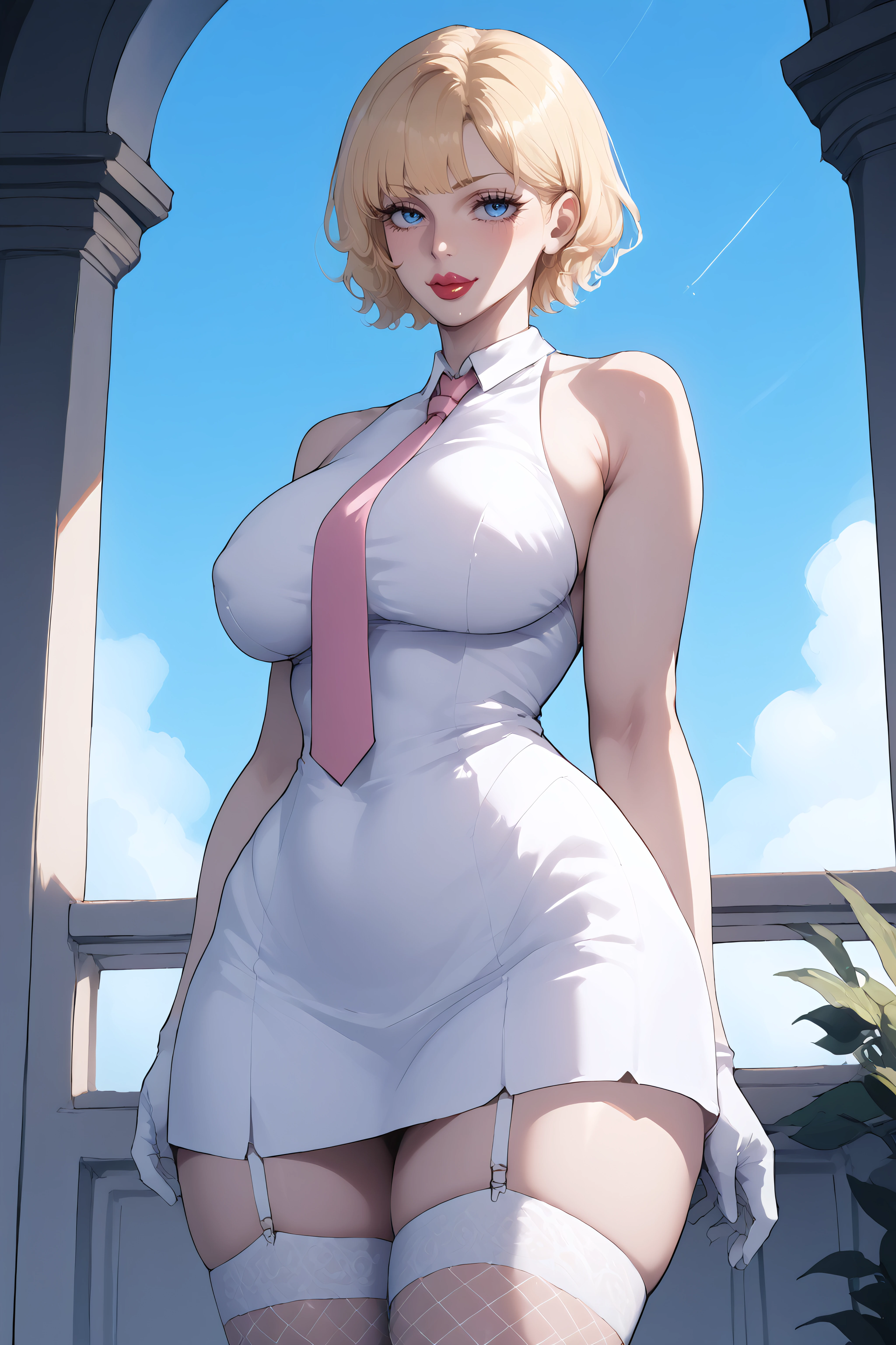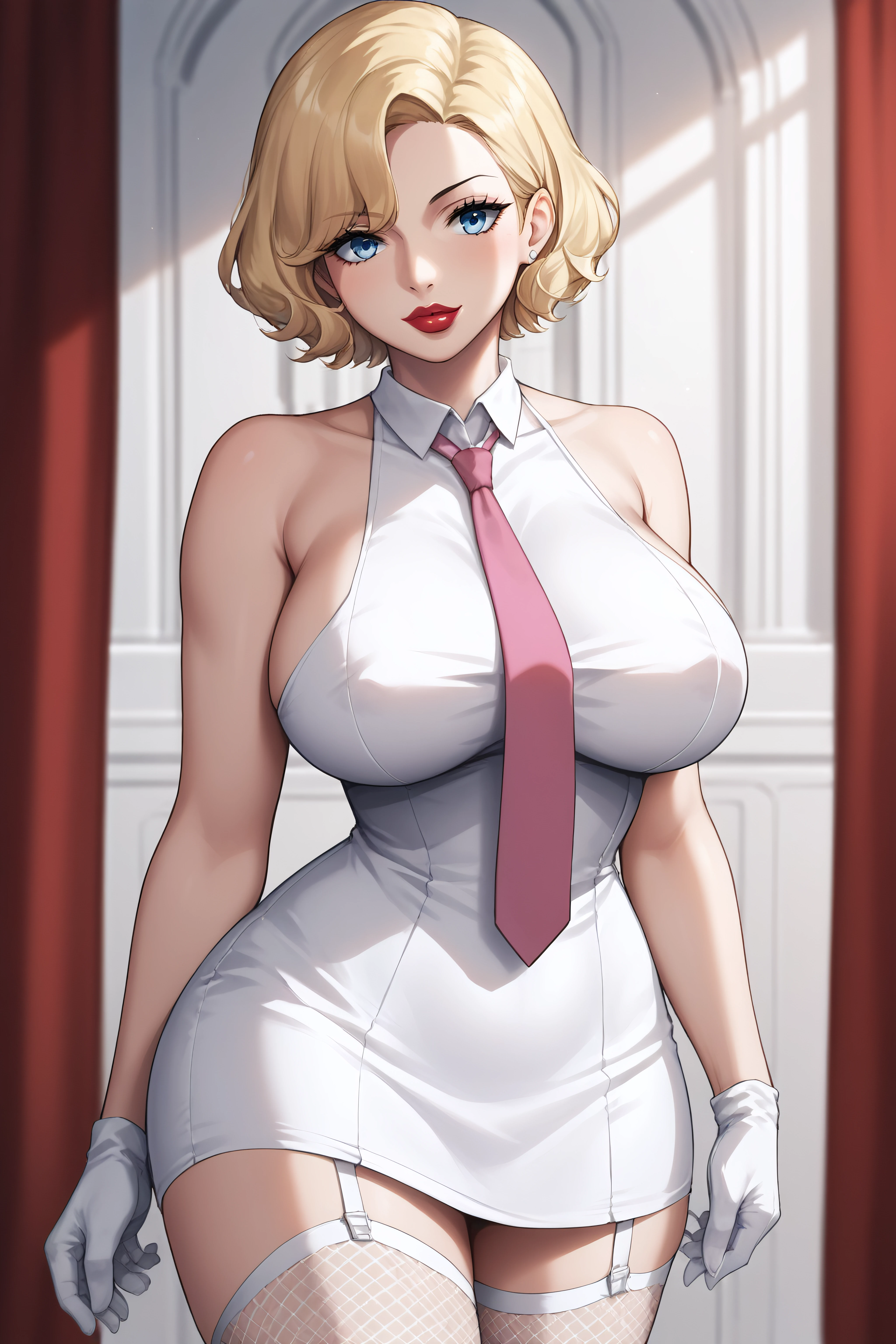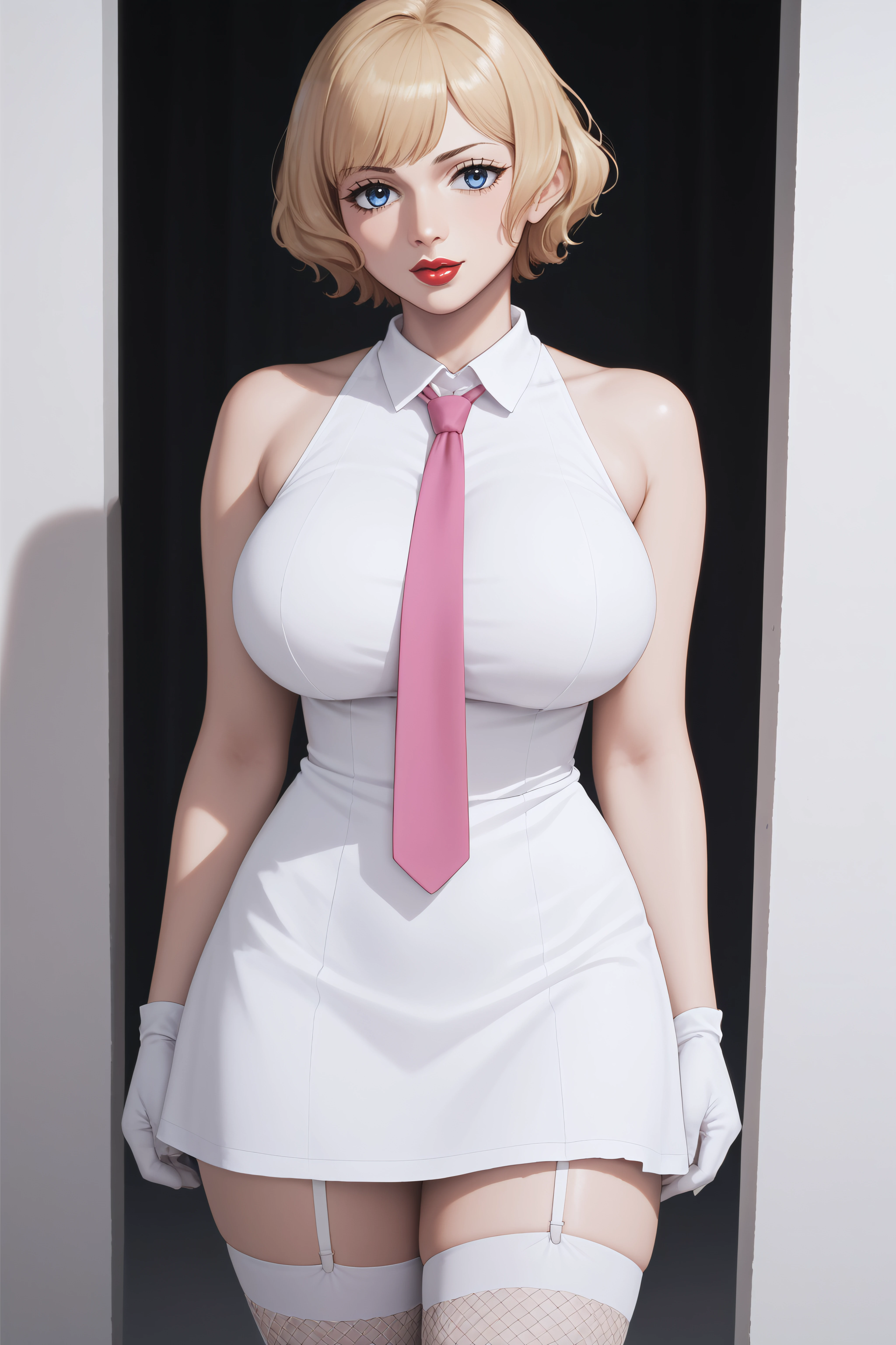 stussy, blue eyes, blonde hair, short hair, lipstick, large breasts, white dress, sleeveless, pink necktie, garter straps, white gloves, fishnet white thighhighs,
