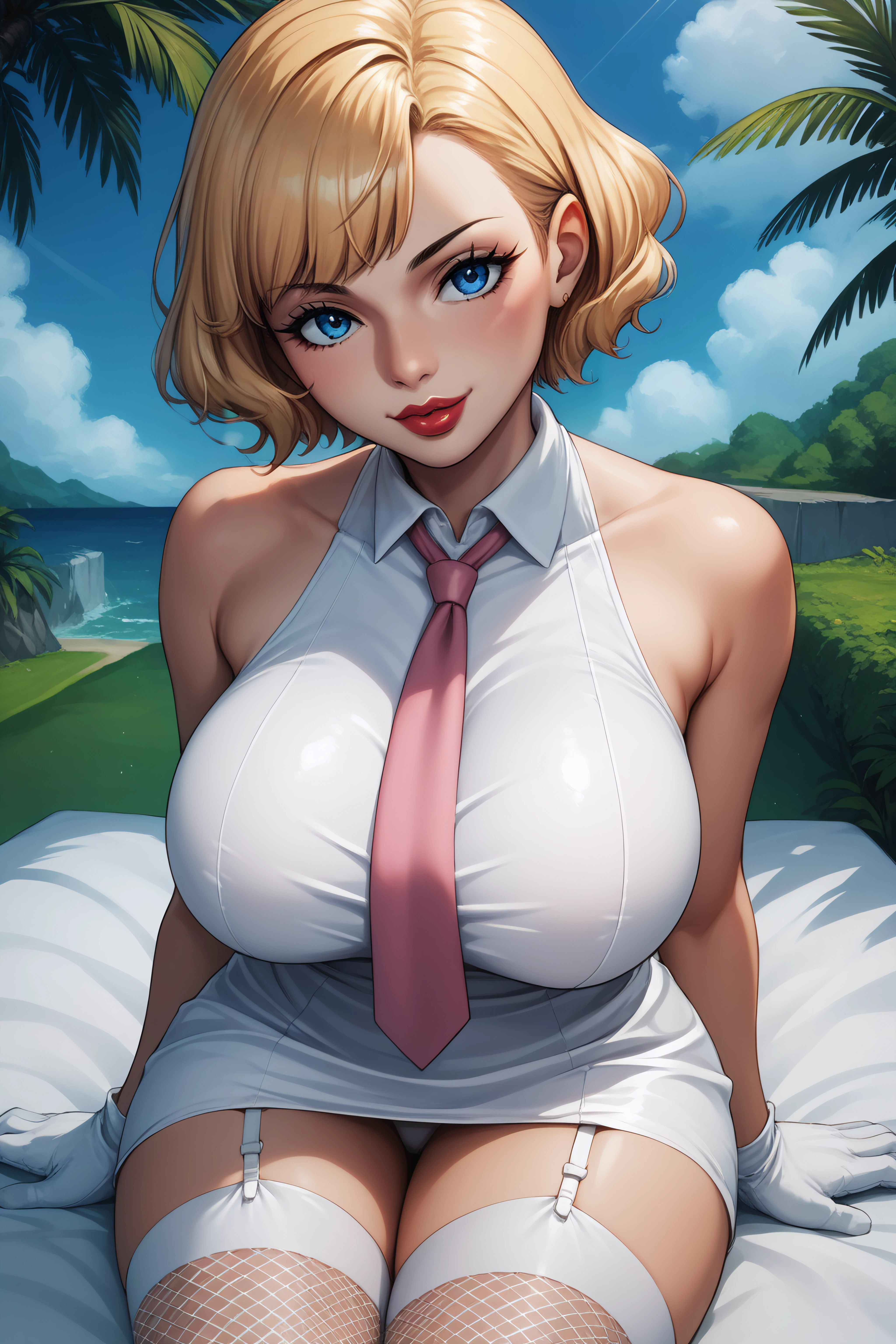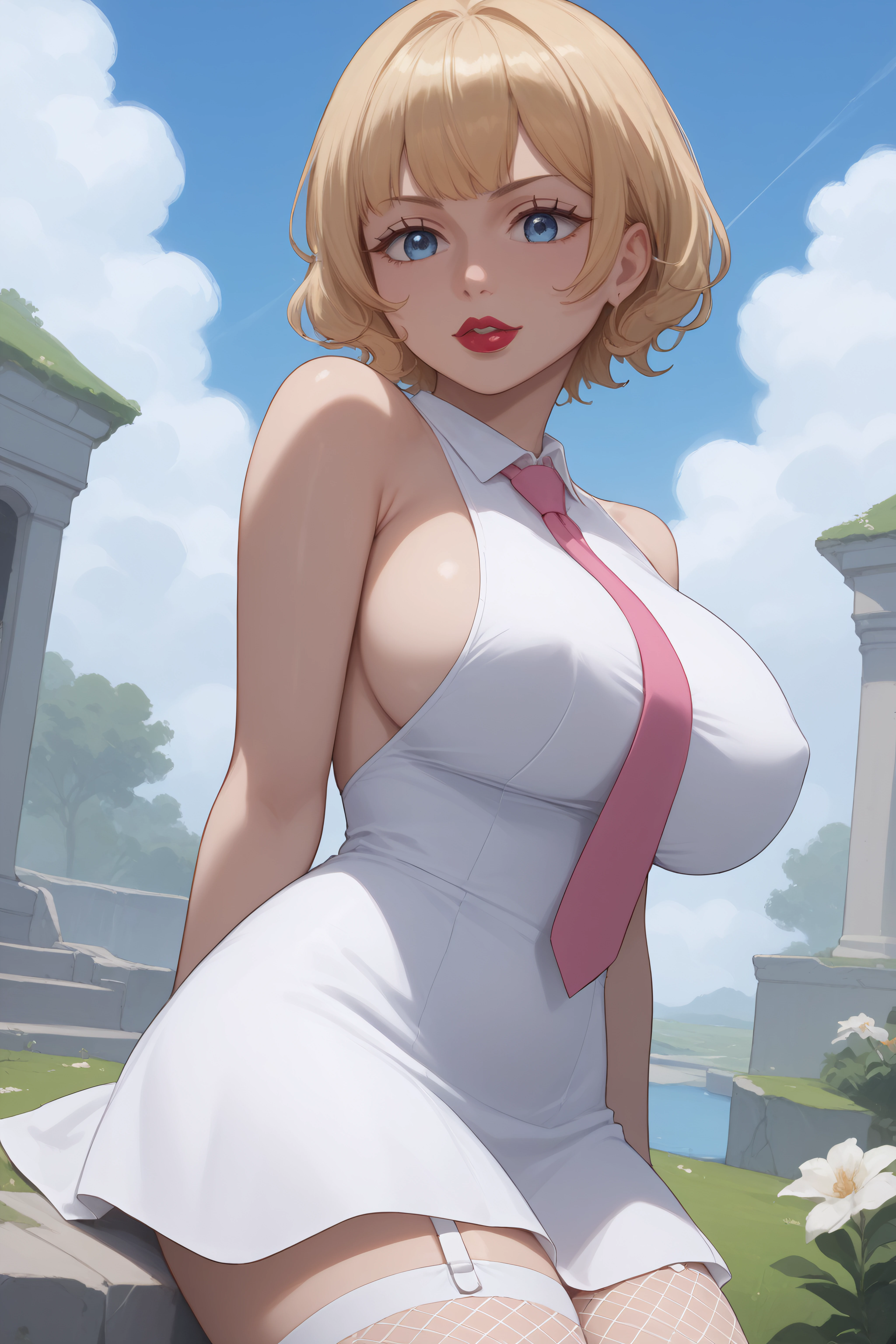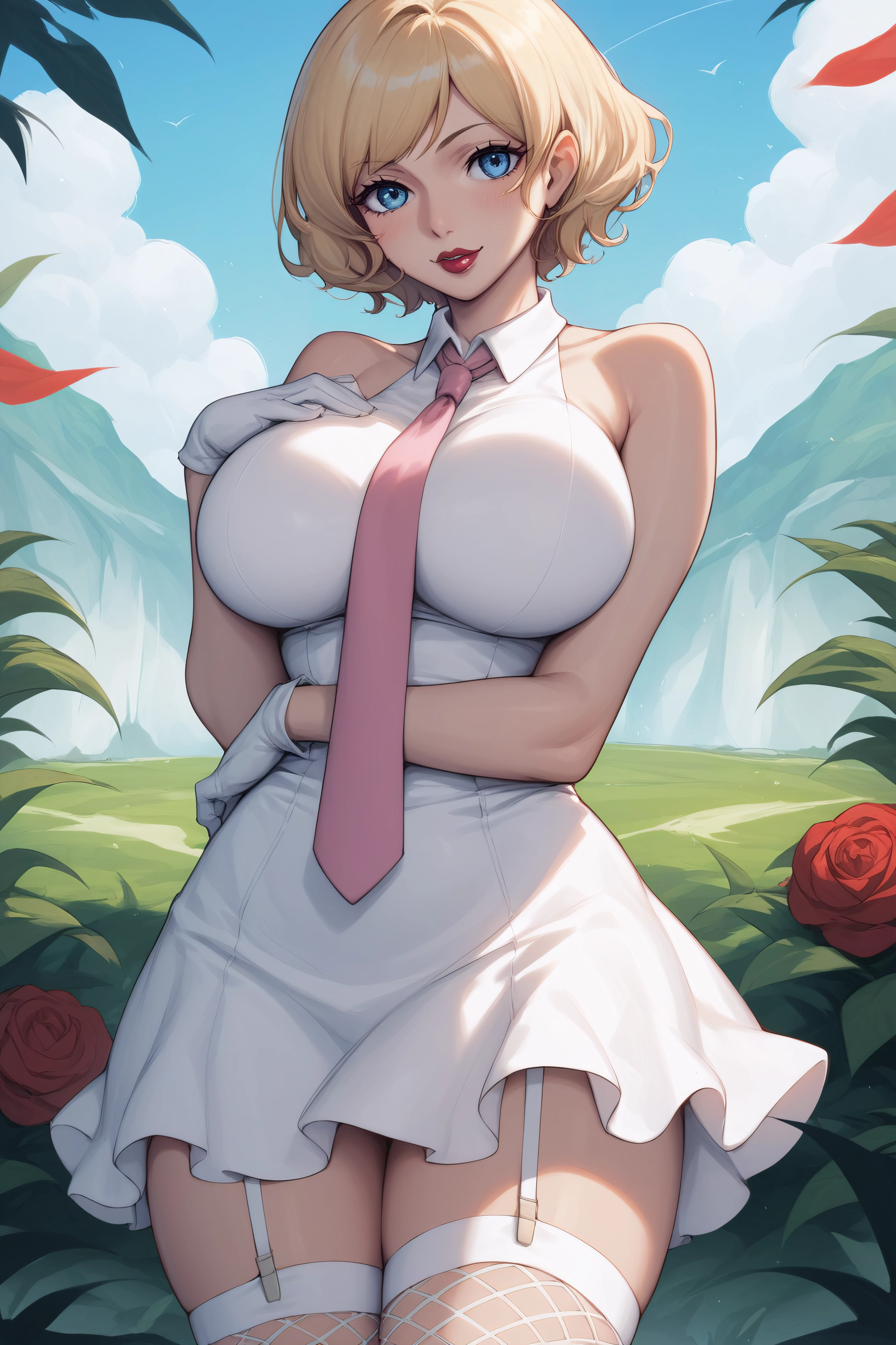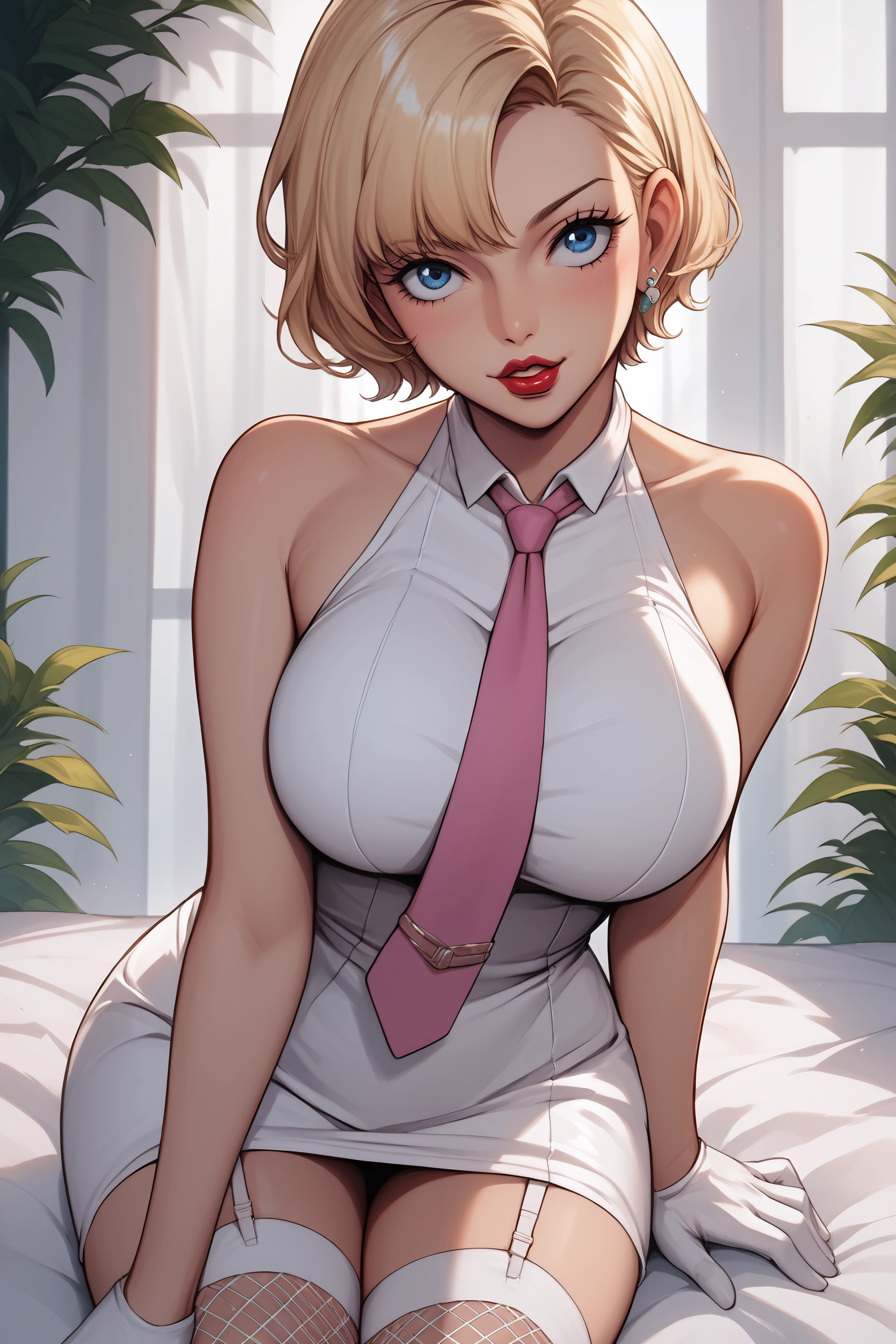 stussy, blue eyes, blonde hair, short hair, lipstick, large breasts, white dress, sleeveless, pink necktie, garter straps, white gloves, fishnet white thighhighs,