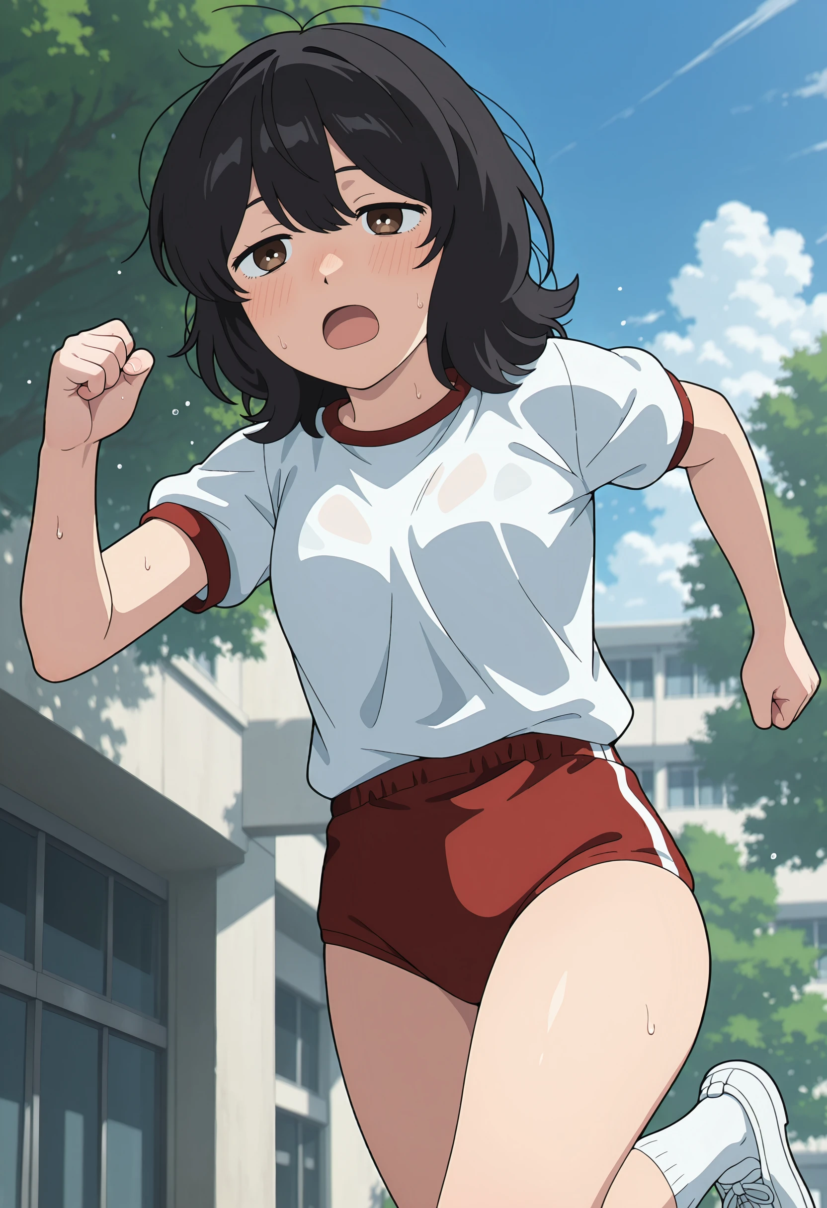 YanoOkamoto, brown eyes, black hair, medium hair, messy hair, double-parted bangs