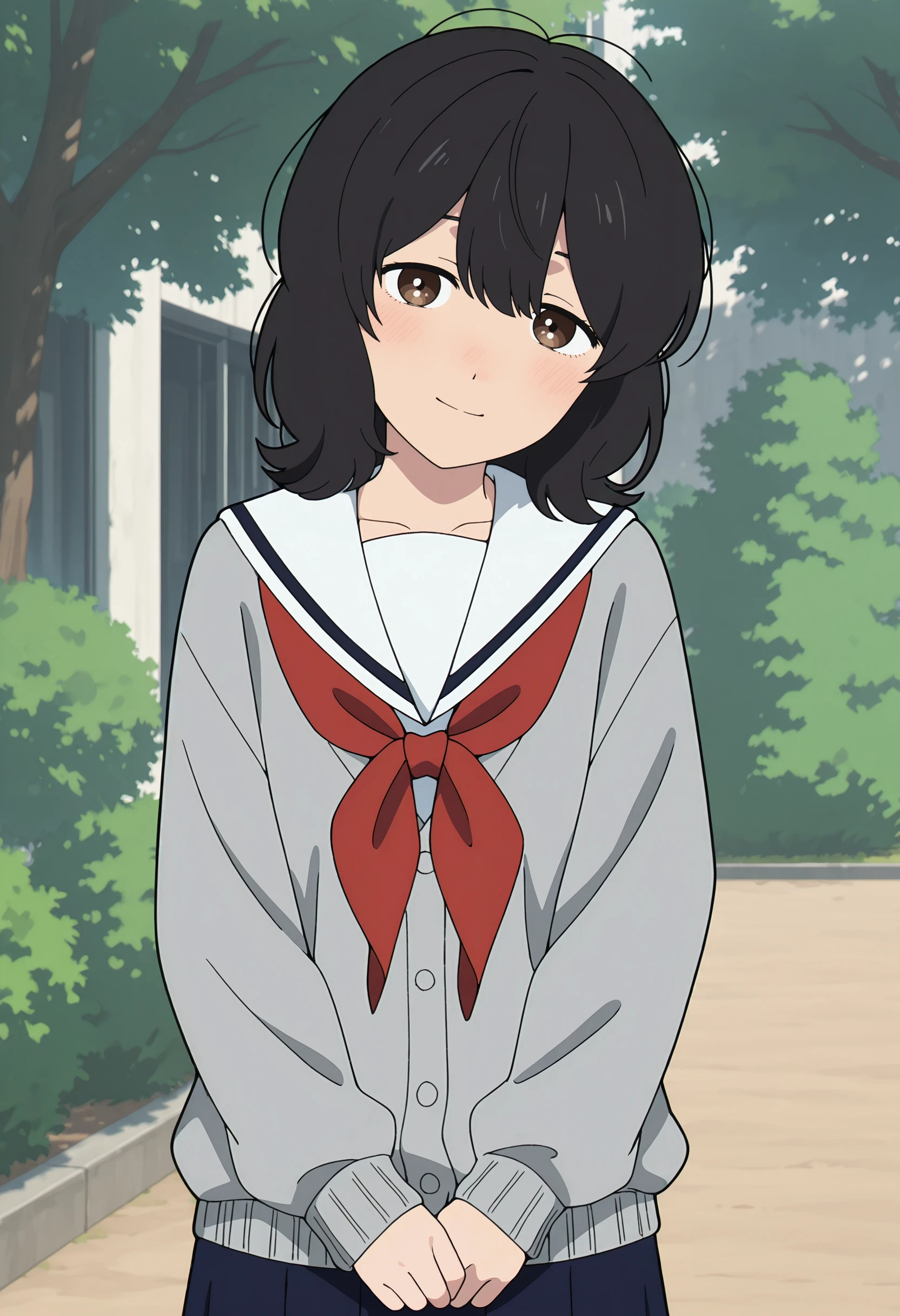 #1: serafuku, white sailor collar, red neckerchief, grey cardigan, long sleeves, blue skirt, pleated skirt, black socks, brown loafers