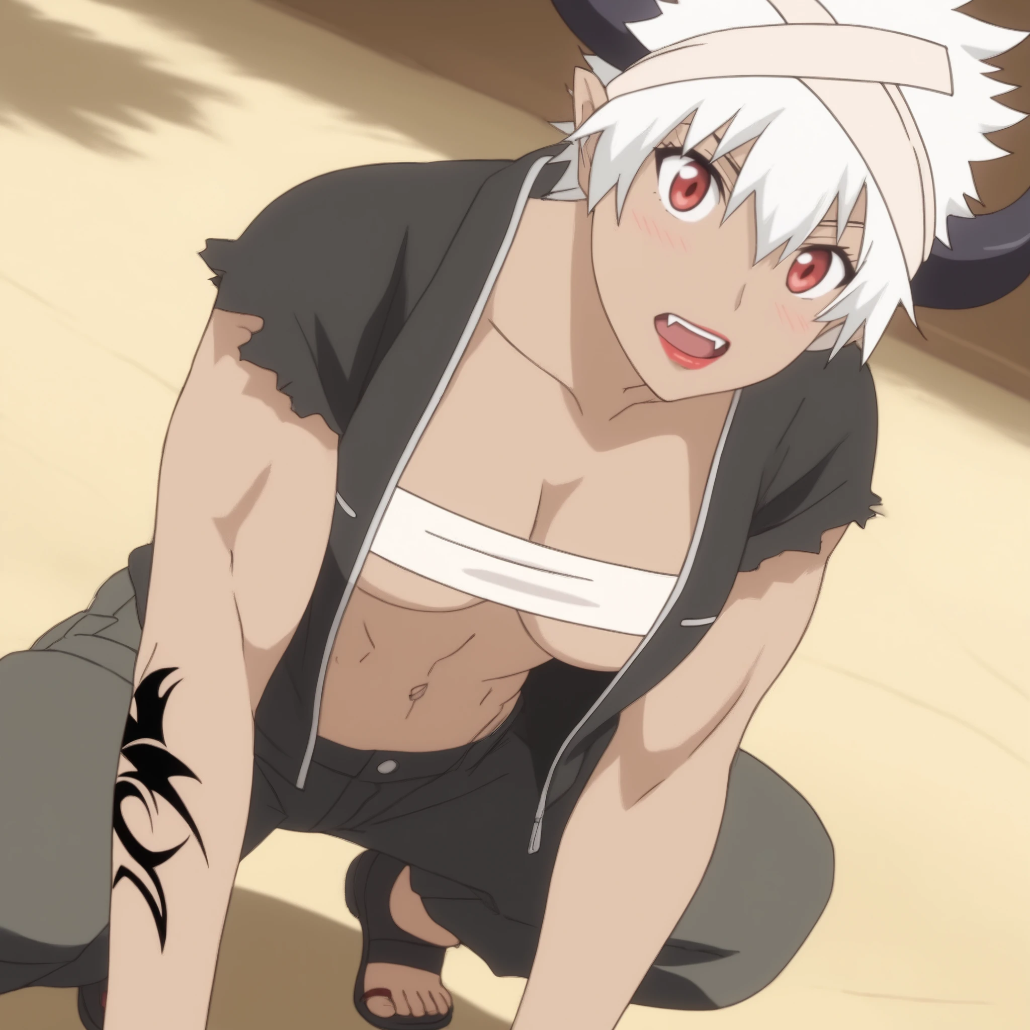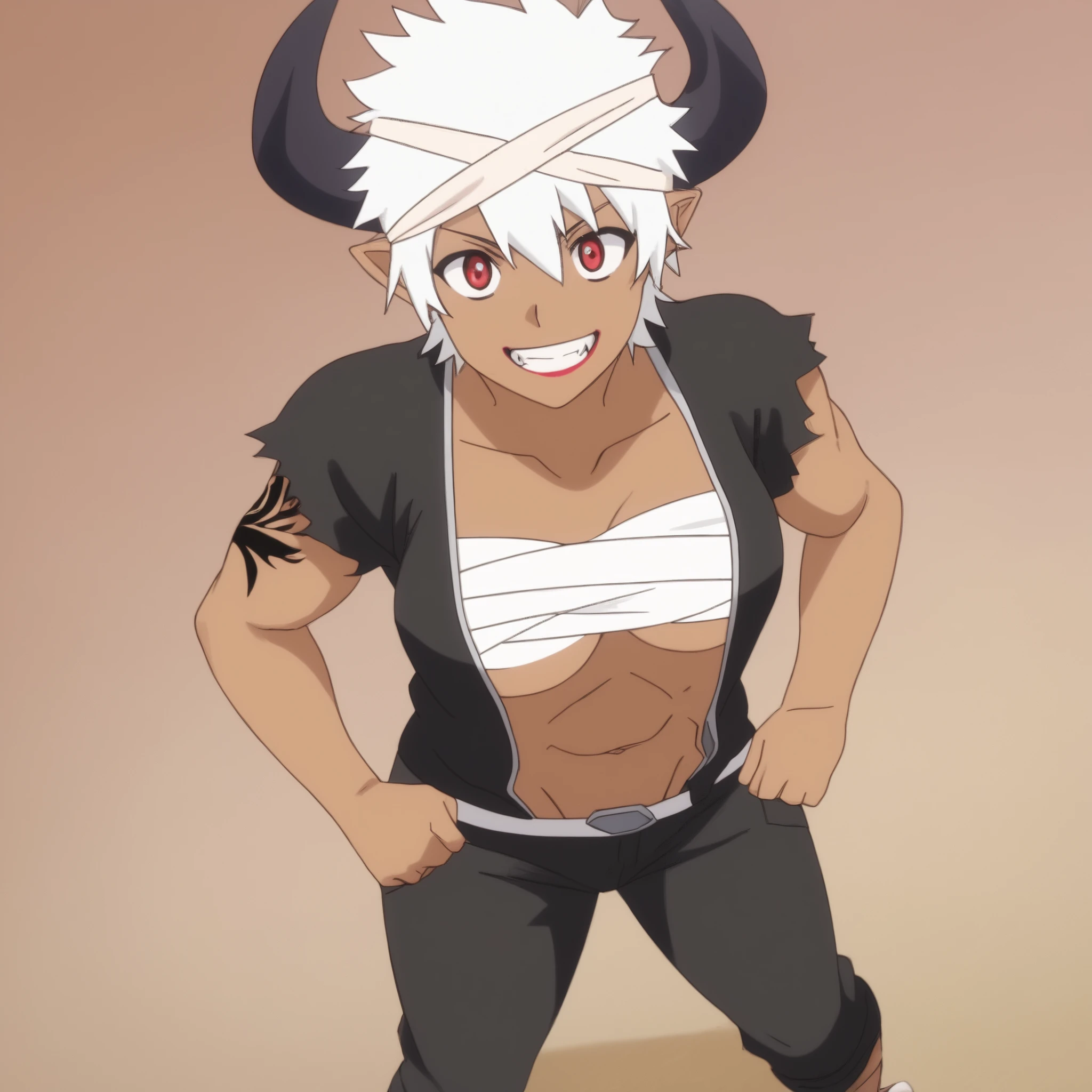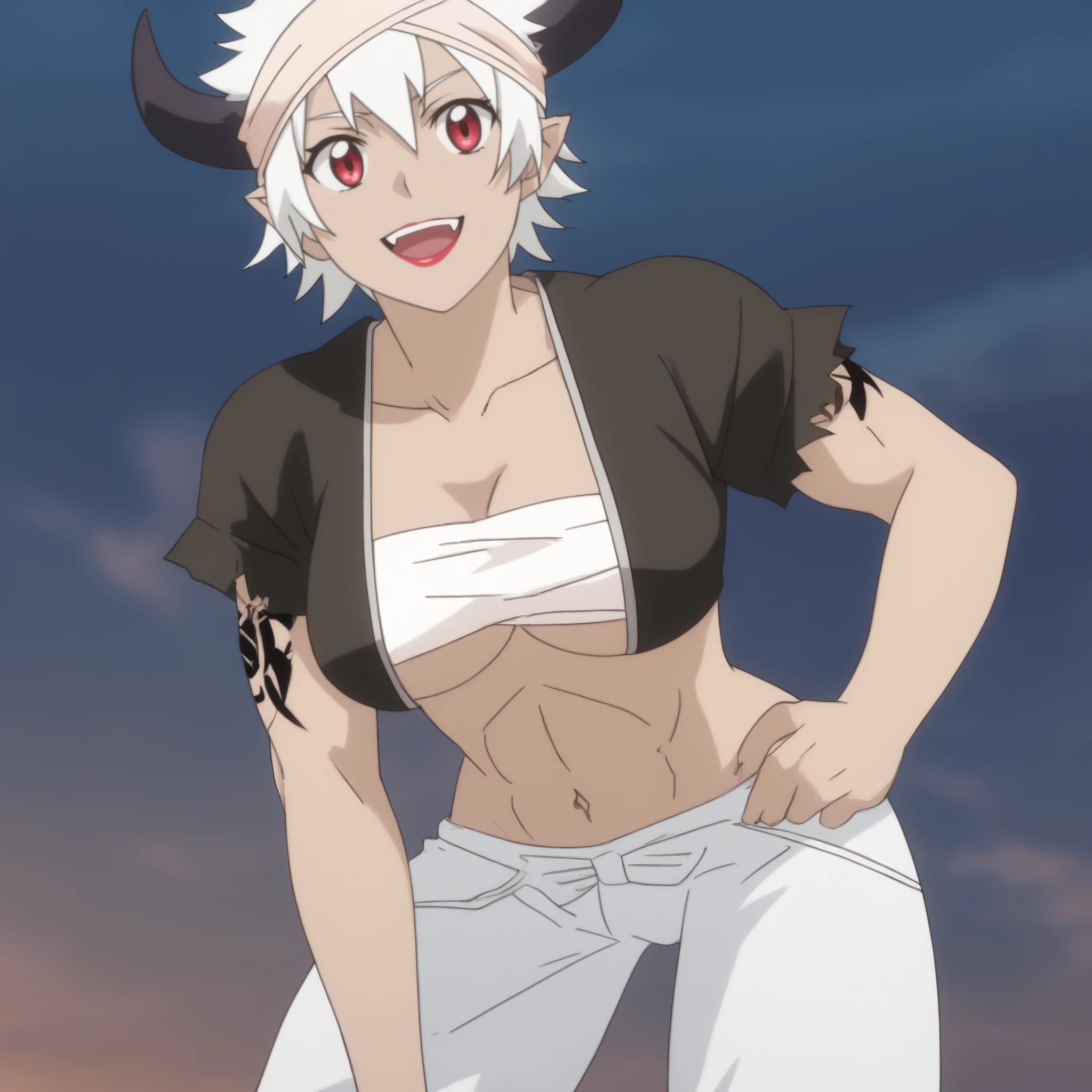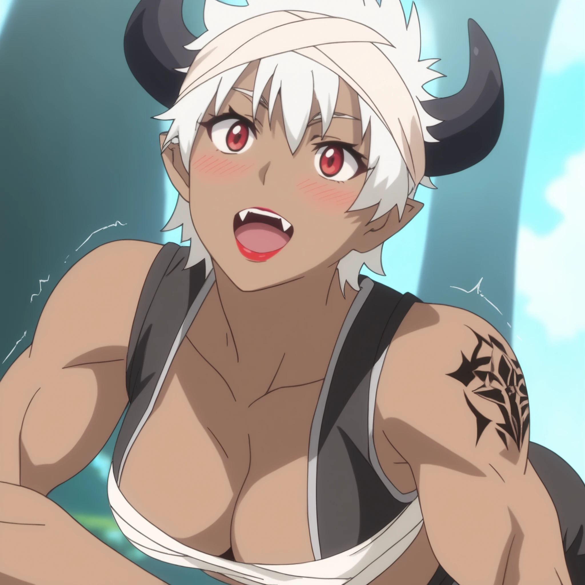 ReMonsterE, red eyes, white hair, short hair, fangs, dark-skinned female, dark skin, black horns, bandages, bandage headband, lipstick, pointy ears, tattoo, muscular,