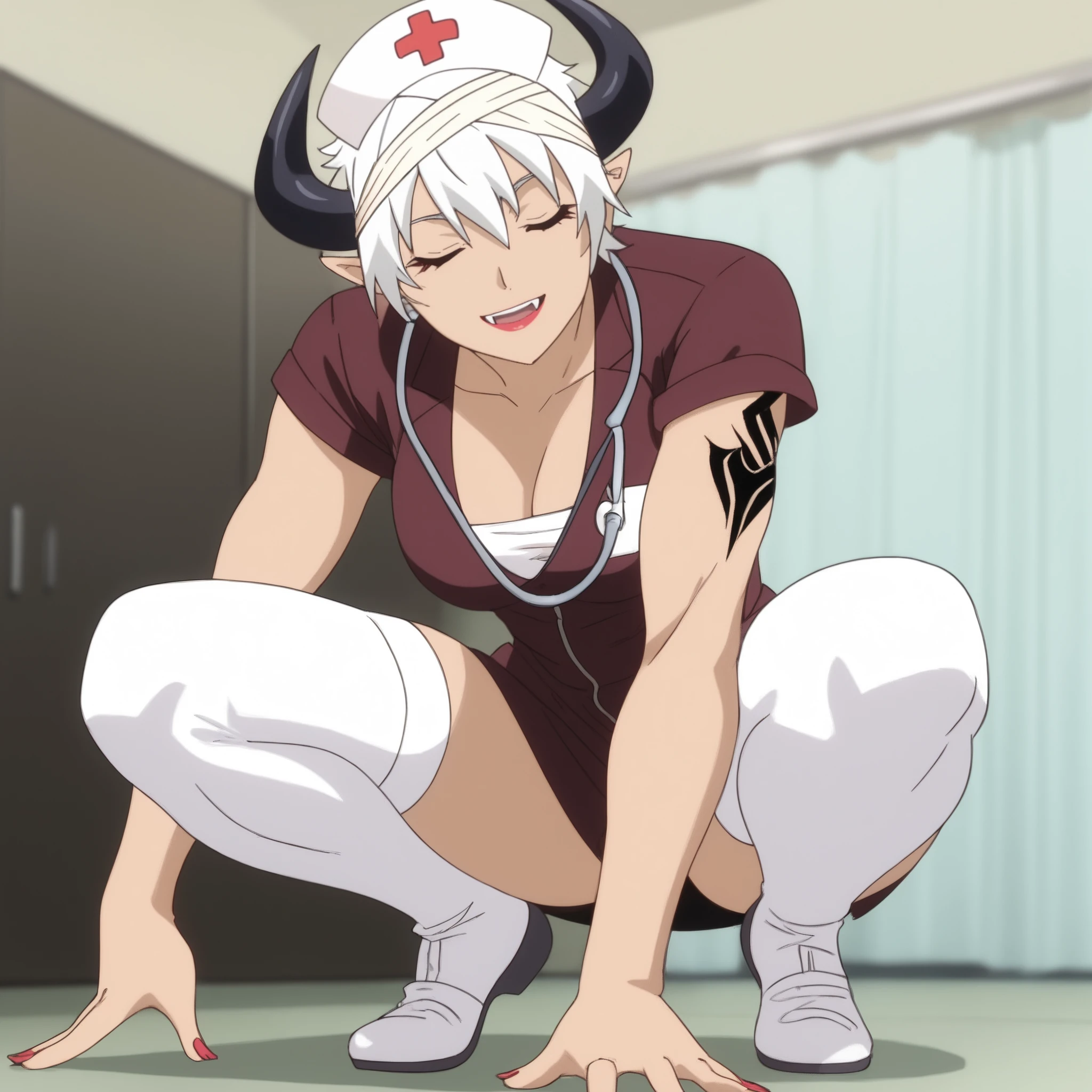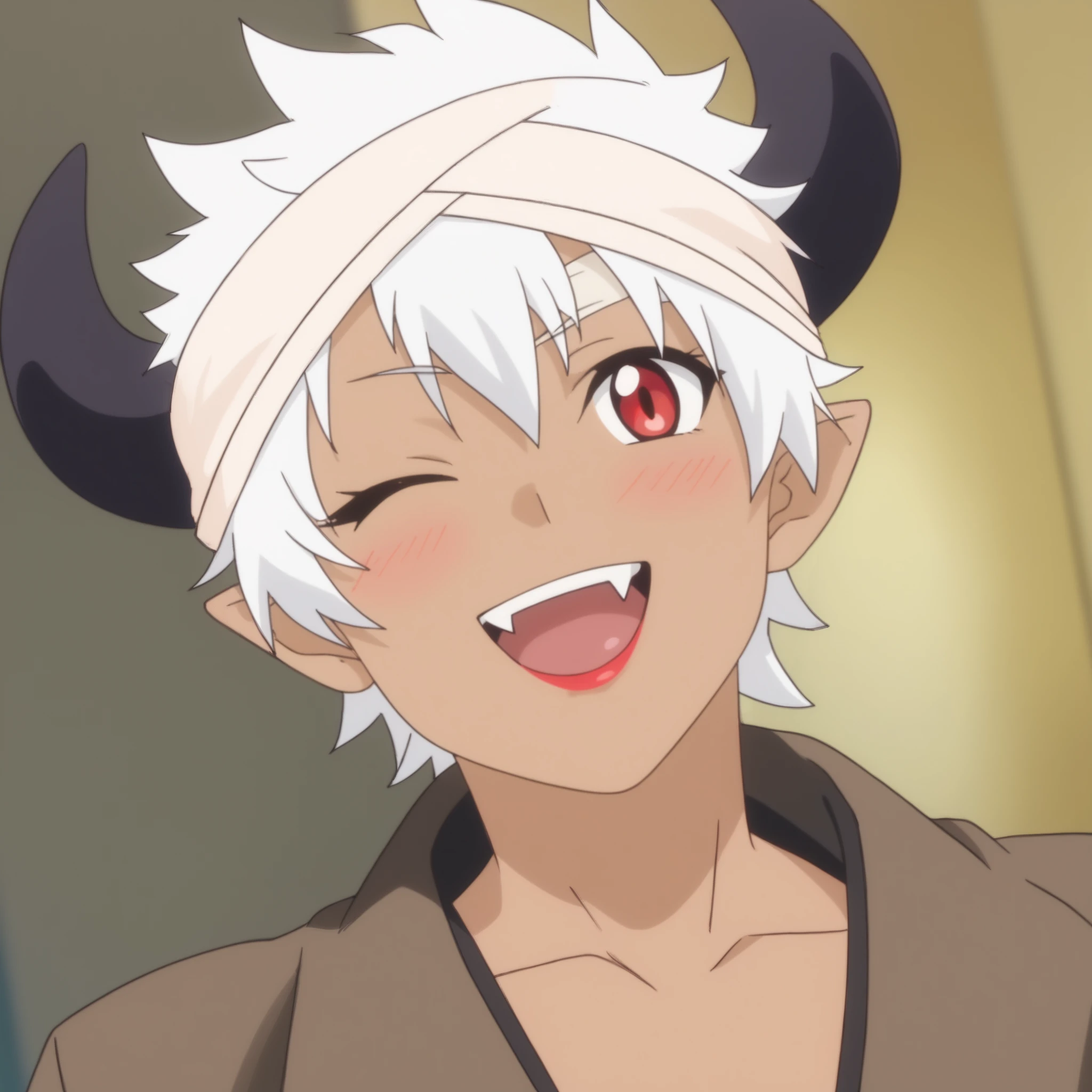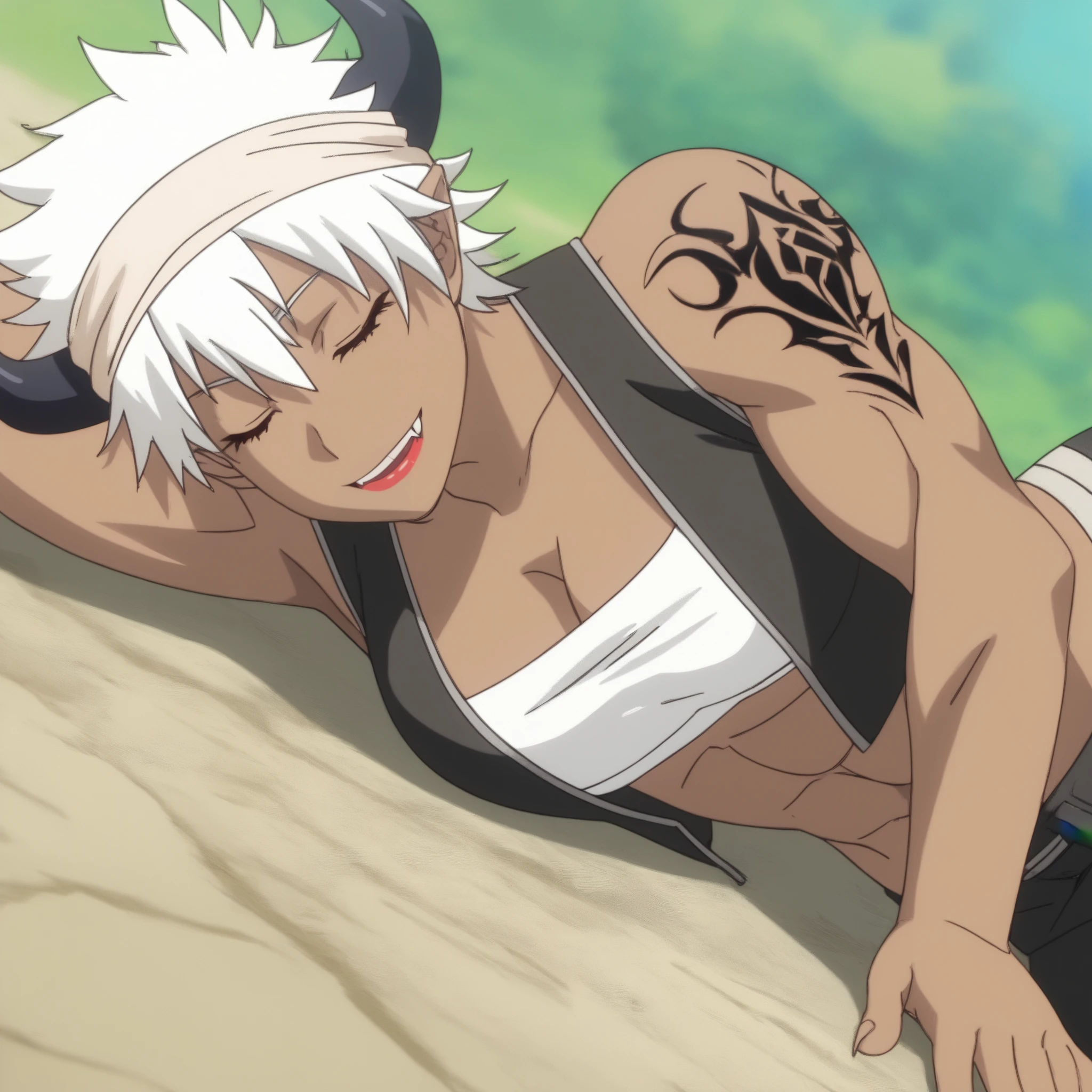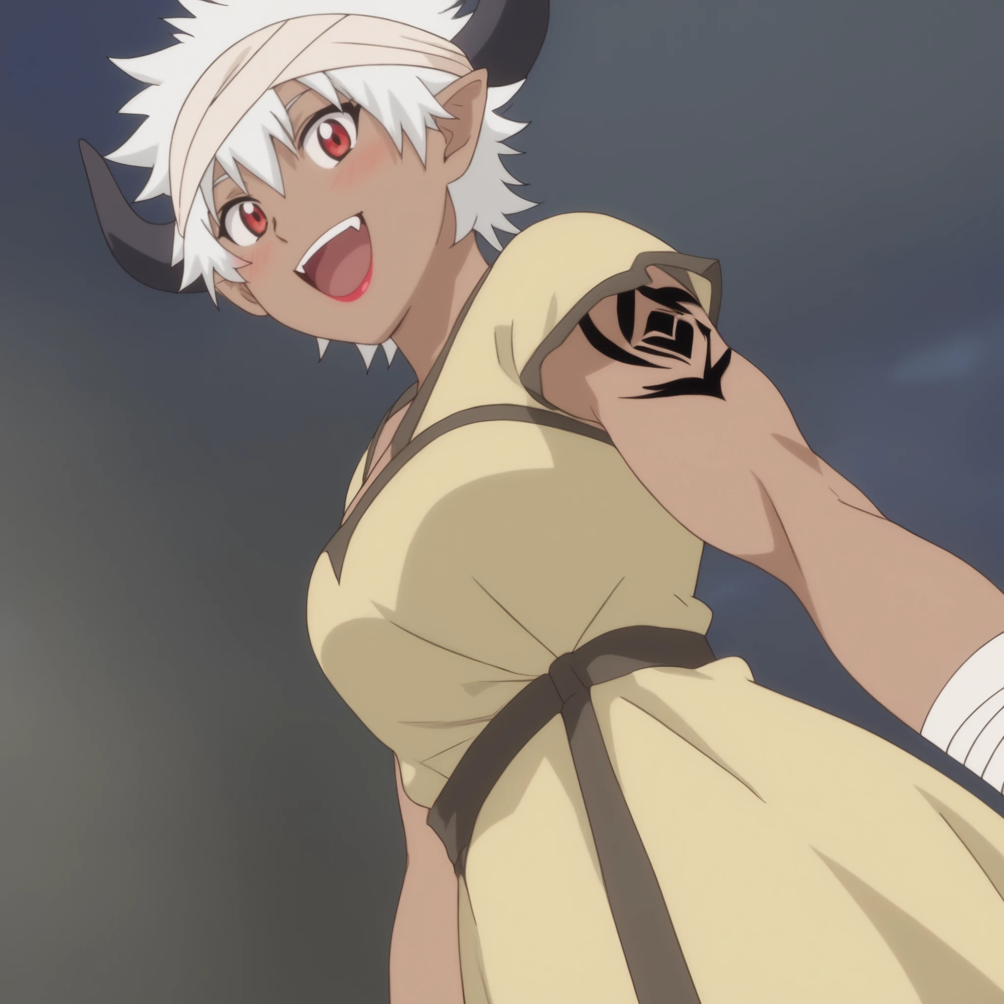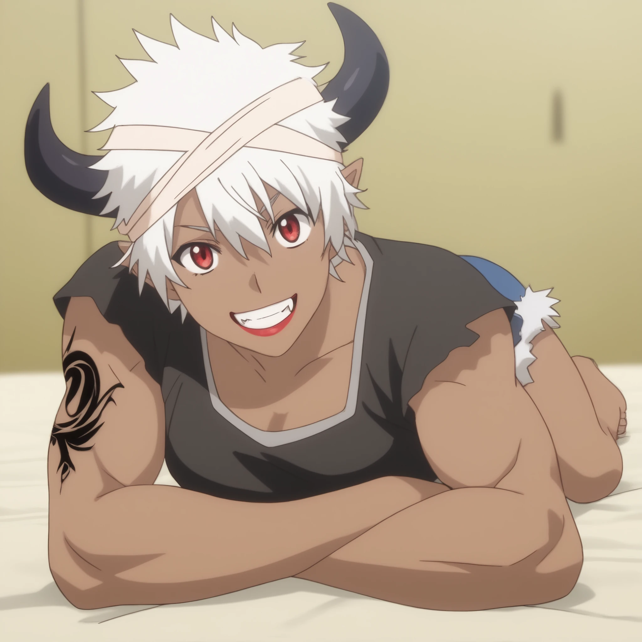 ReMonsterE, red eyes, white hair, short hair, fangs, dark-skinned female, dark skin, black horns, bandages, bandage headband, lipstick, pointy ears, tattoo, muscular,
