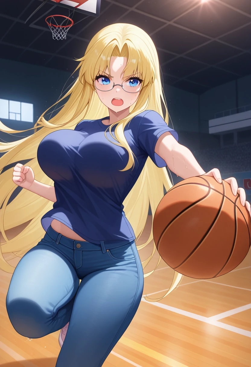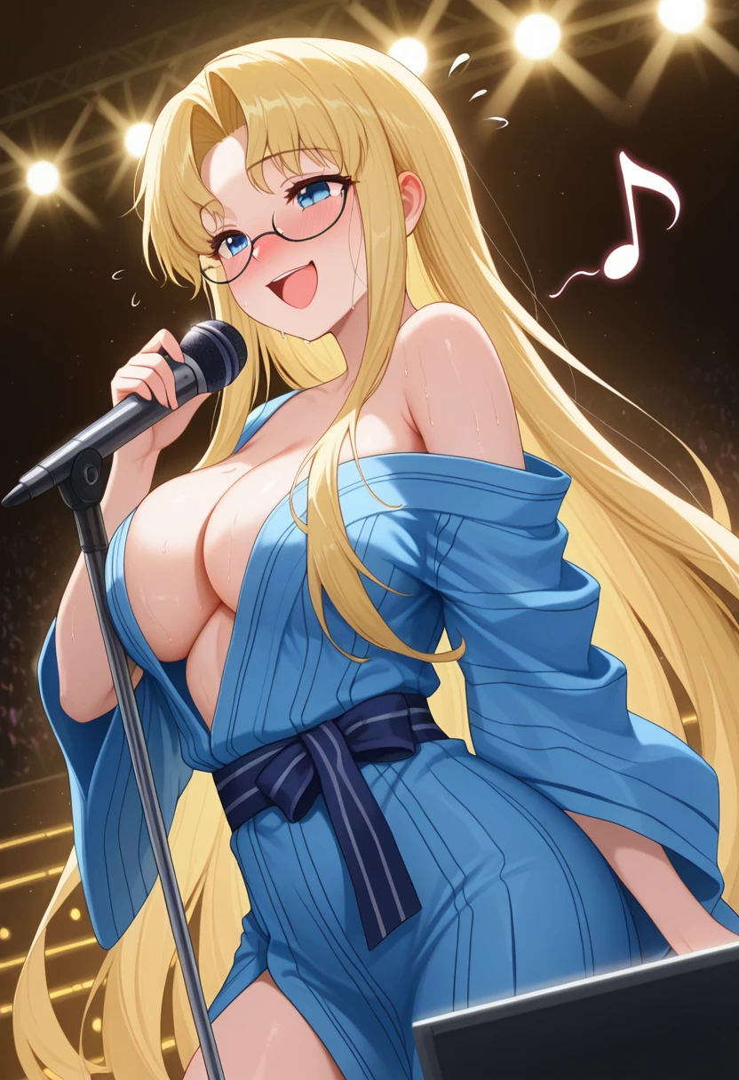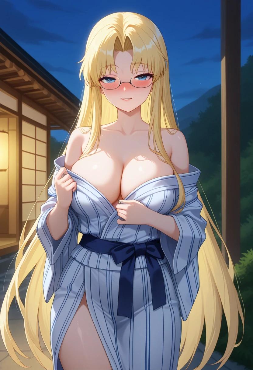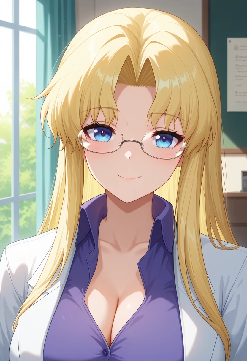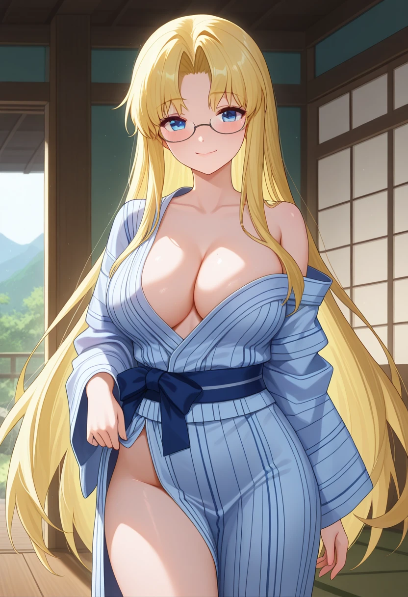 mitsukoww, blue eyes, blonde hair, long hair, very long hair, parted bangs, glasses, large breasts,