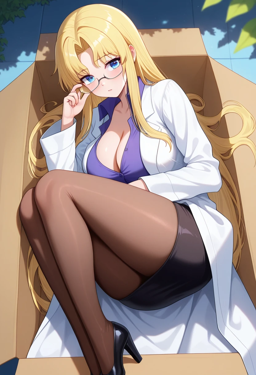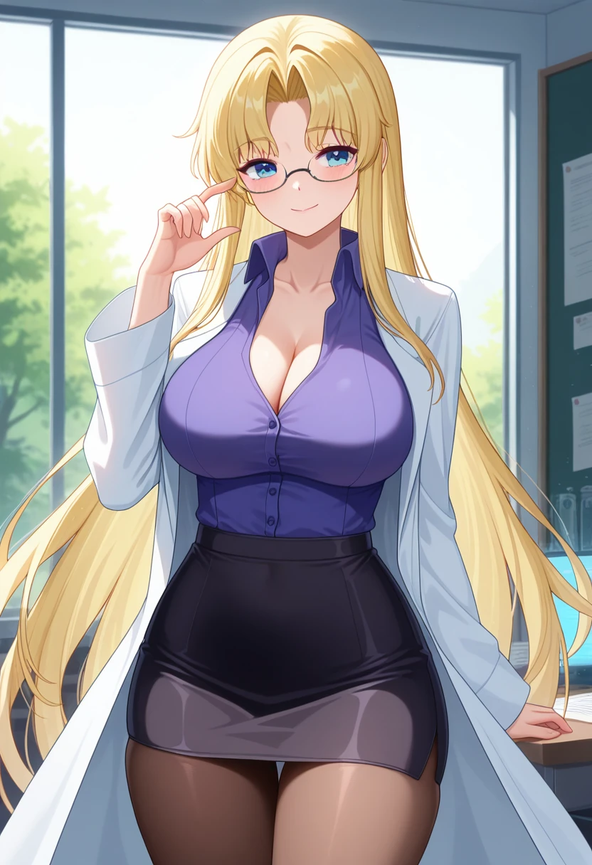 lab coat, long sleeves, breasts, cleavage, purple collared shirt, black pencil skirt, brown pantyhose, high heels,