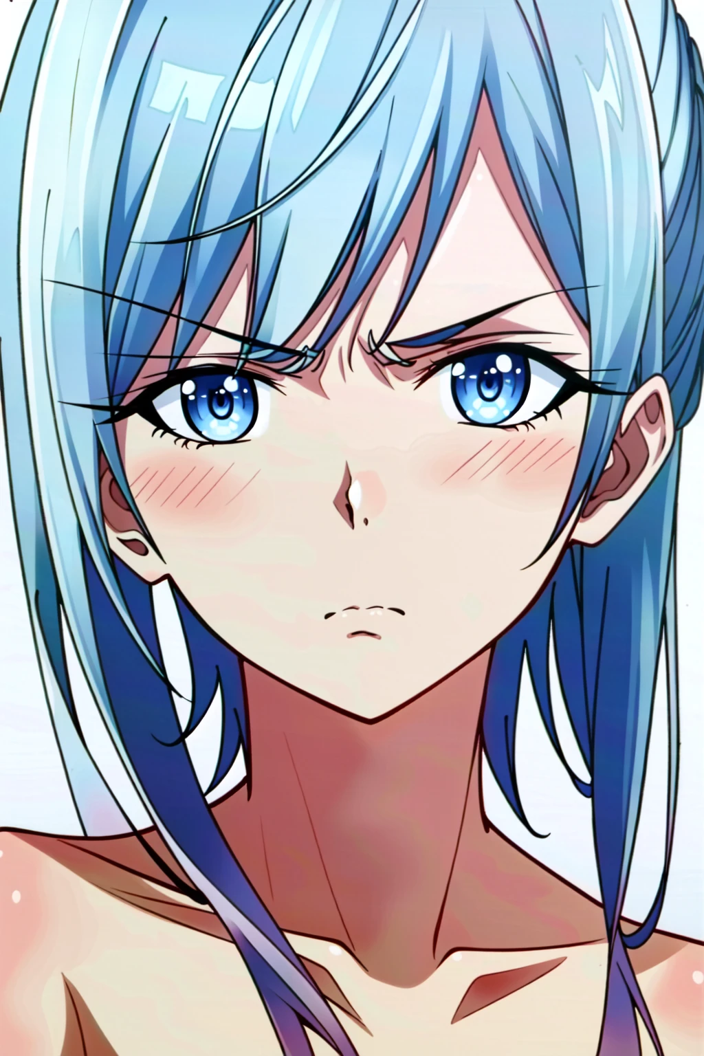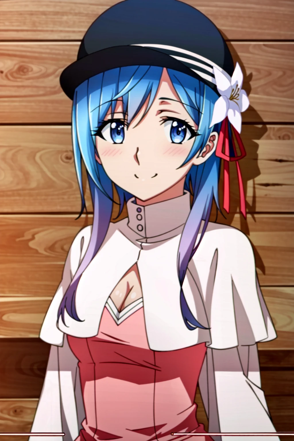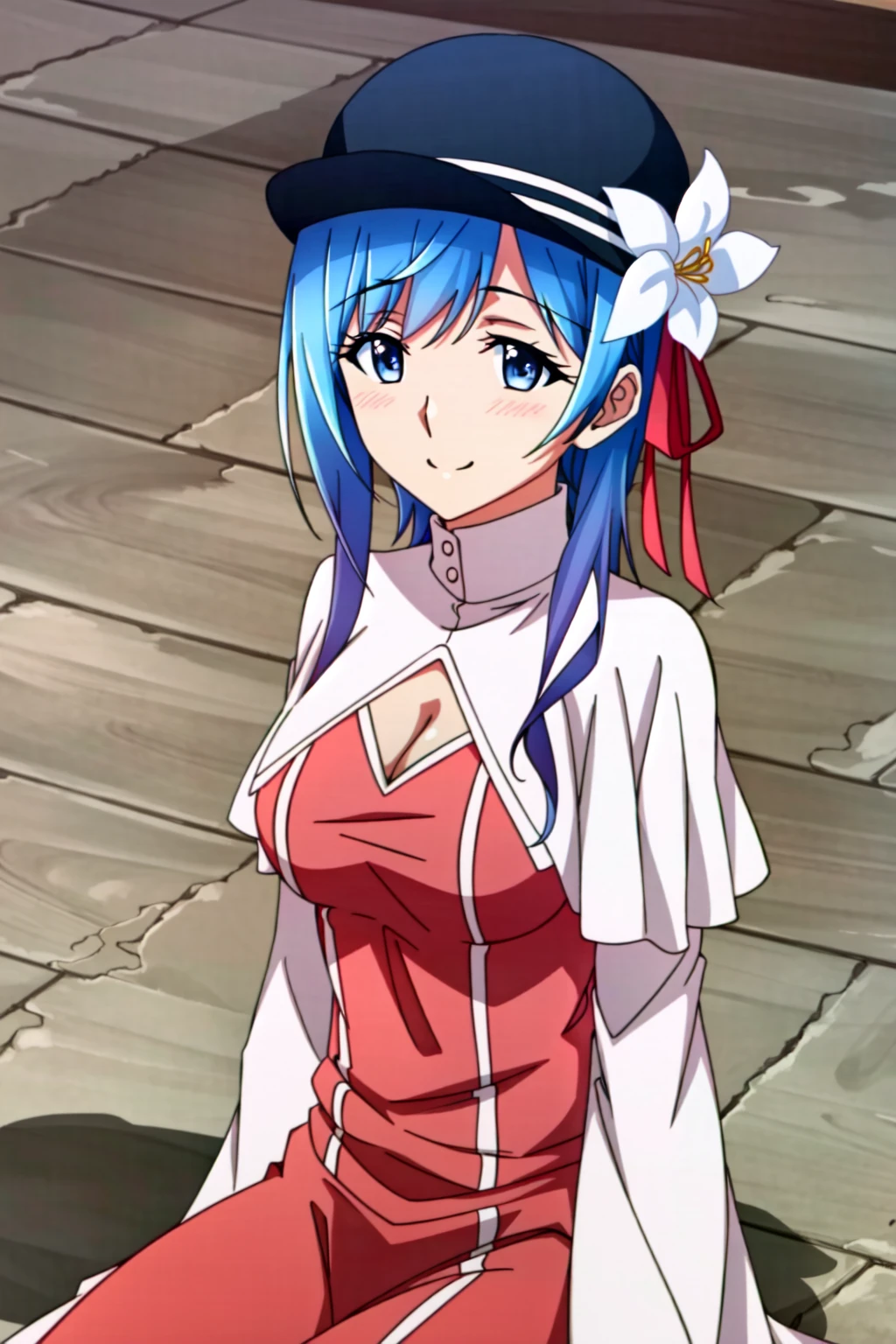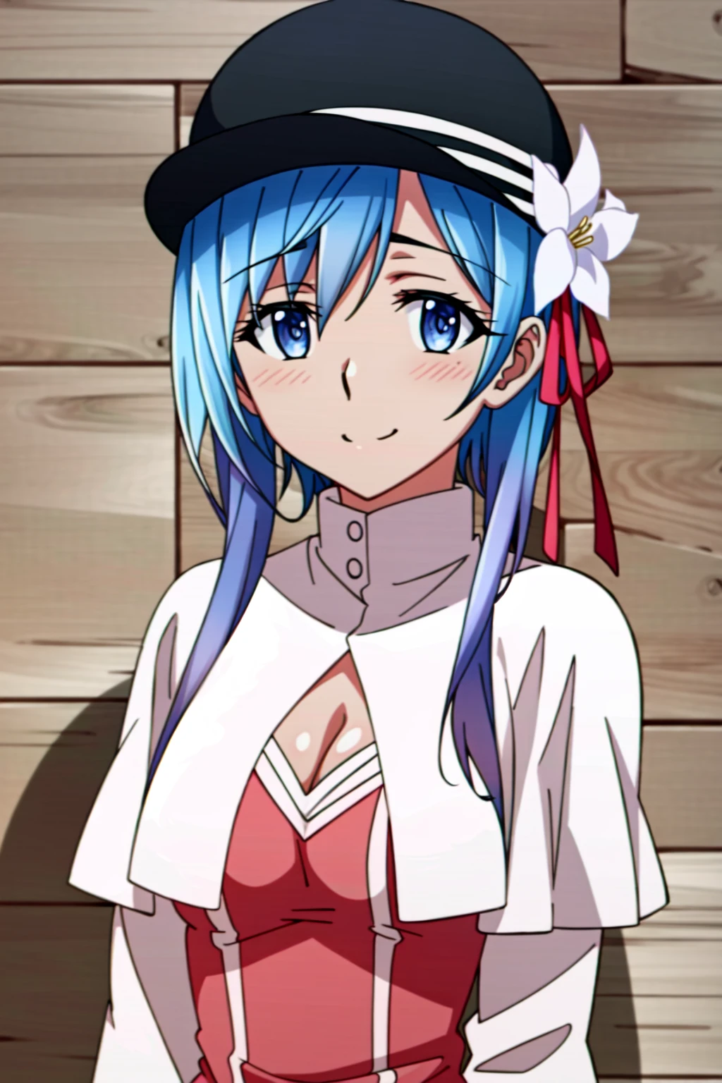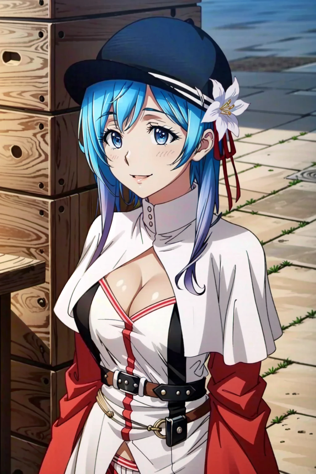 Hina Farrow, 1girl, solo, blue eyes, blue hair, thighhighs, skirt, staff, hat, day, sky, black thighhighs, zettai ryouiki, hair ornament, flower, breasts, petals, hair flower, cloud, cape, short hair, smile, cleavage