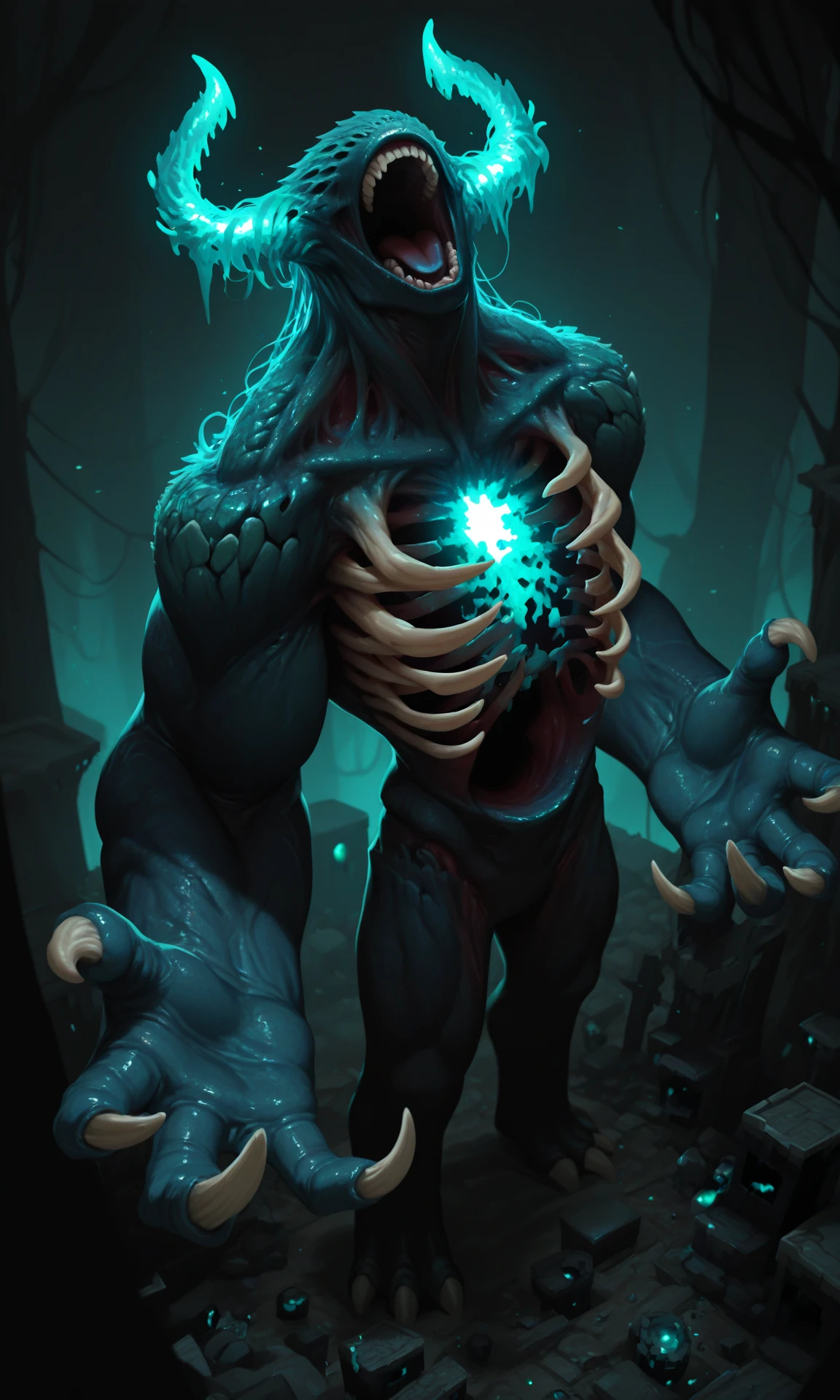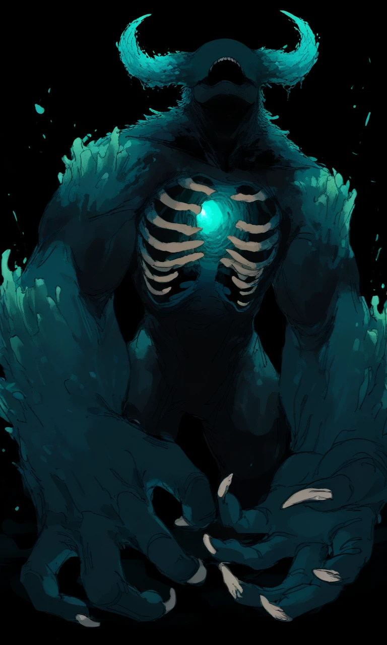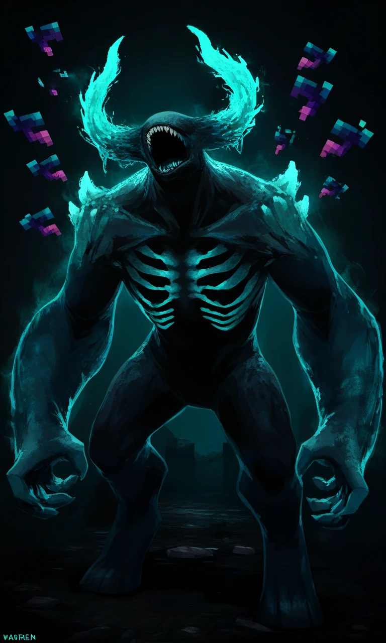 monster, eyeless, glowing horns, expose ribs, colored skin, big arms, wide body, souls inside chest, claws, Warden Minecraft