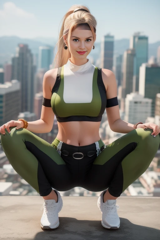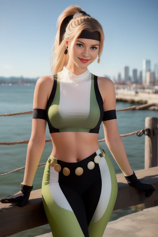 mk3sonya, sonya blade, mk3, gloves, armlet, headband, bare shoulders, lipstick, pants, ponytail, blonde hair, medium breasts, green leggings, crop top, long hair, earrings, midriff, navel