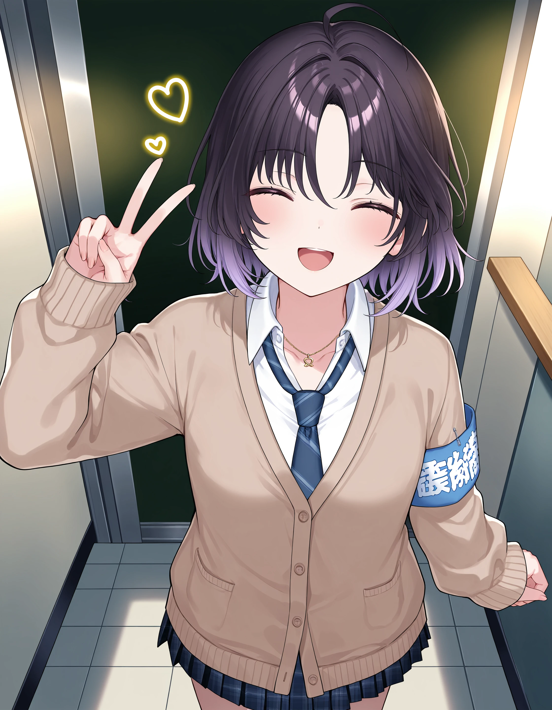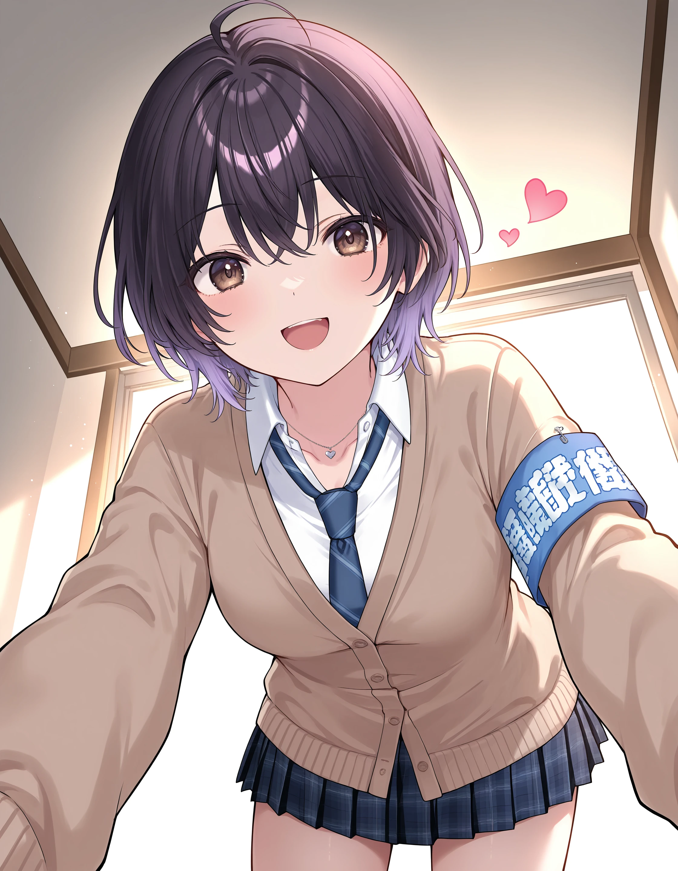 kuroo-tina,black hair,purple hair,multicolored hair,short hair,bangs,ahoge,brown eyes,school uniform,brown cardigan,cardigan,long sleeves,sleeves past wrists,white shirt,collared shirt,blue necktie,necktie,diagonal stripes,striped,blue skirt,plaid skirt,plaid,pleated skirt,armband,necklace,jewelry,