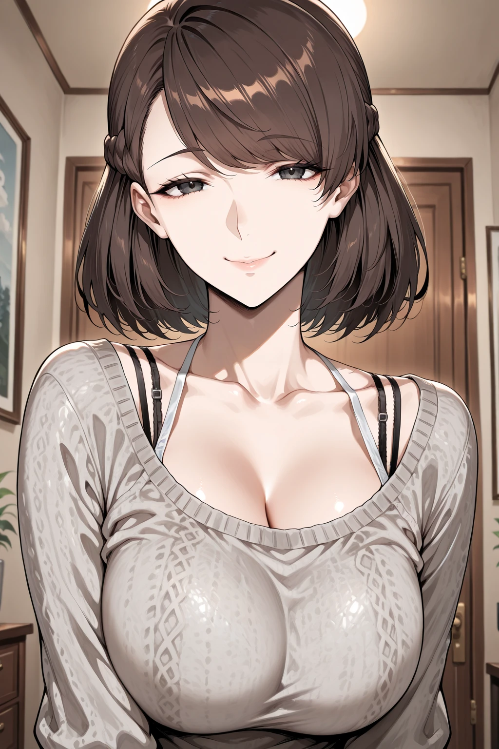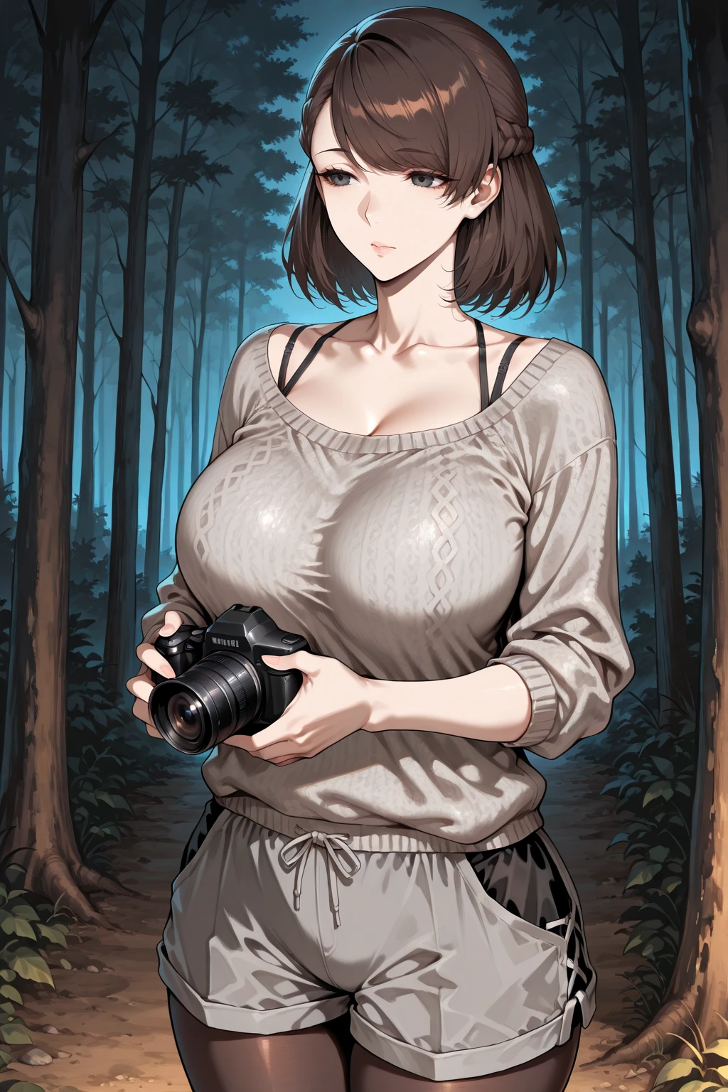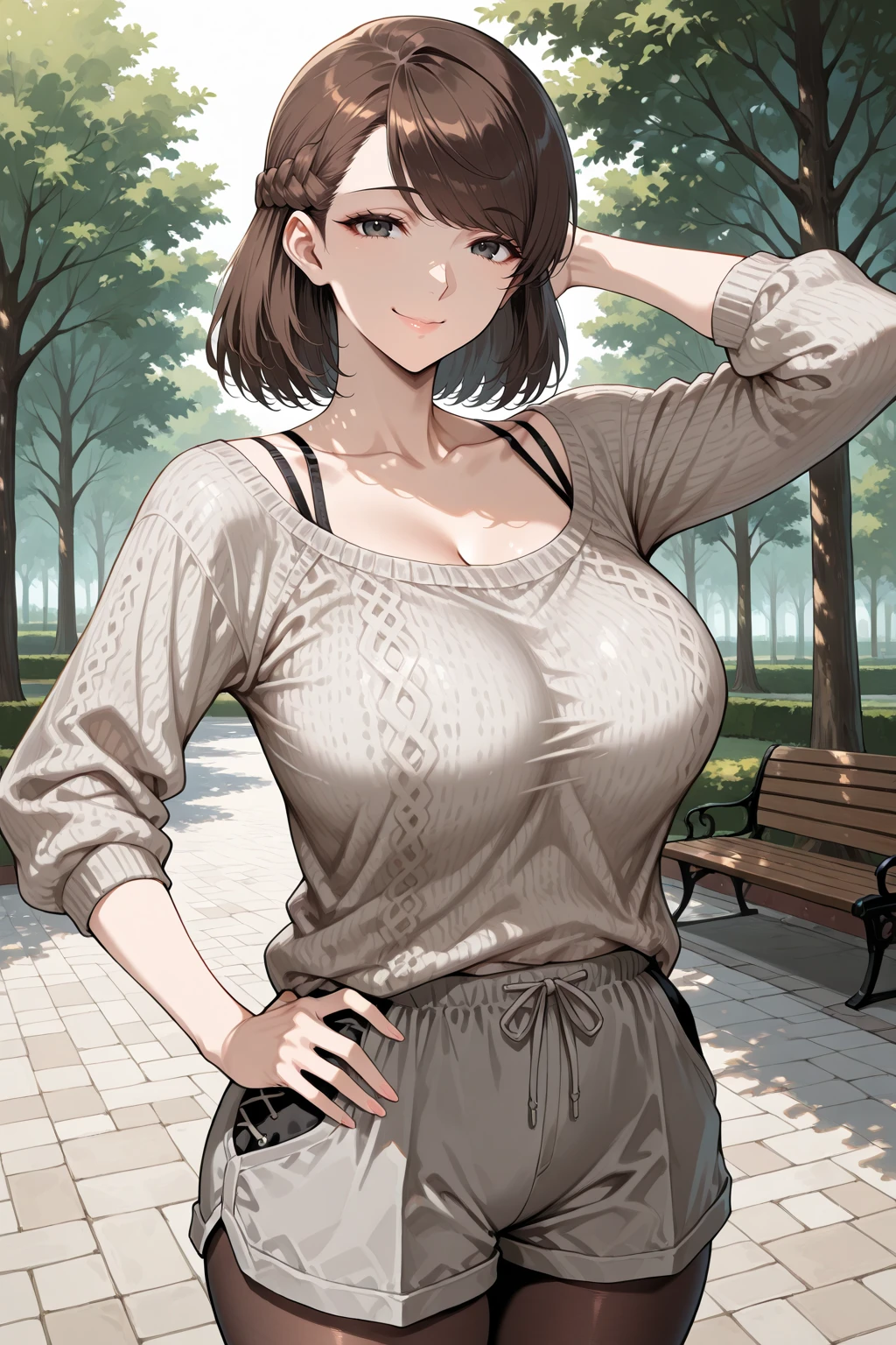 collarbone, bra strap, grey sweater, grey shorts, brown pantyhose, pantyhose under shorts