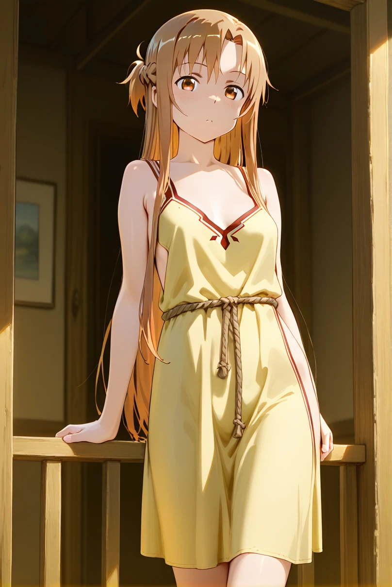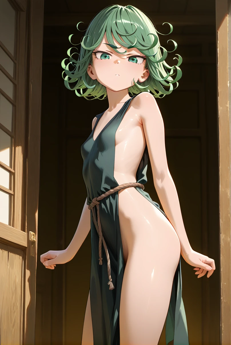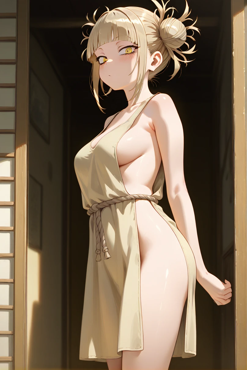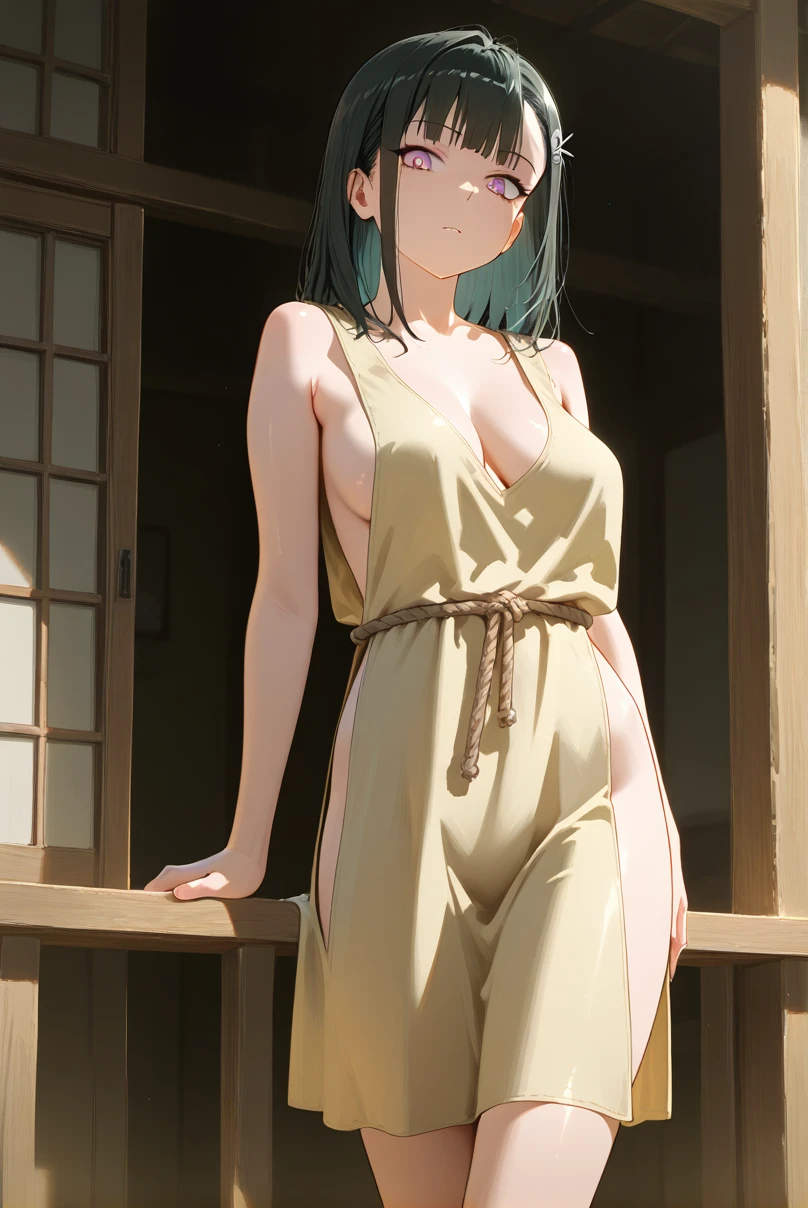 masterpiece,best quality,amazing quality,very aesthetic,absurdres,ultra detailed face,ultra detailed eyes, <lora:SlaveTunicOutfit_Illustrious_v2:0.8>, (slavetunicoutfit:1.2), rope around waist, sleeveless dress, revealing clothes, Negative Prompt