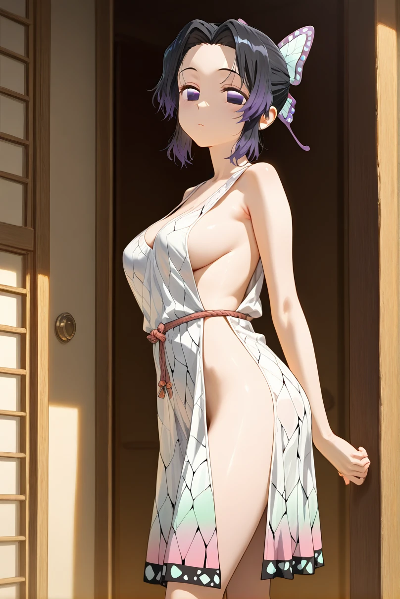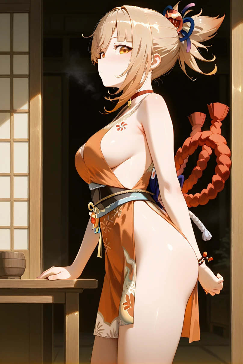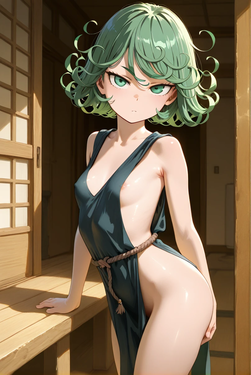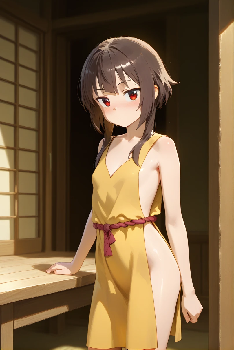 masterpiece,best quality,amazing quality,very aesthetic,absurdres,ultra detailed face,ultra detailed eyes, <lora:SlaveTunicOutfit_Illustrious_v2:0.8>, (slavetunicoutfit:1.2), rope around waist, sleeveless dress, revealing clothes, Negative Prompt