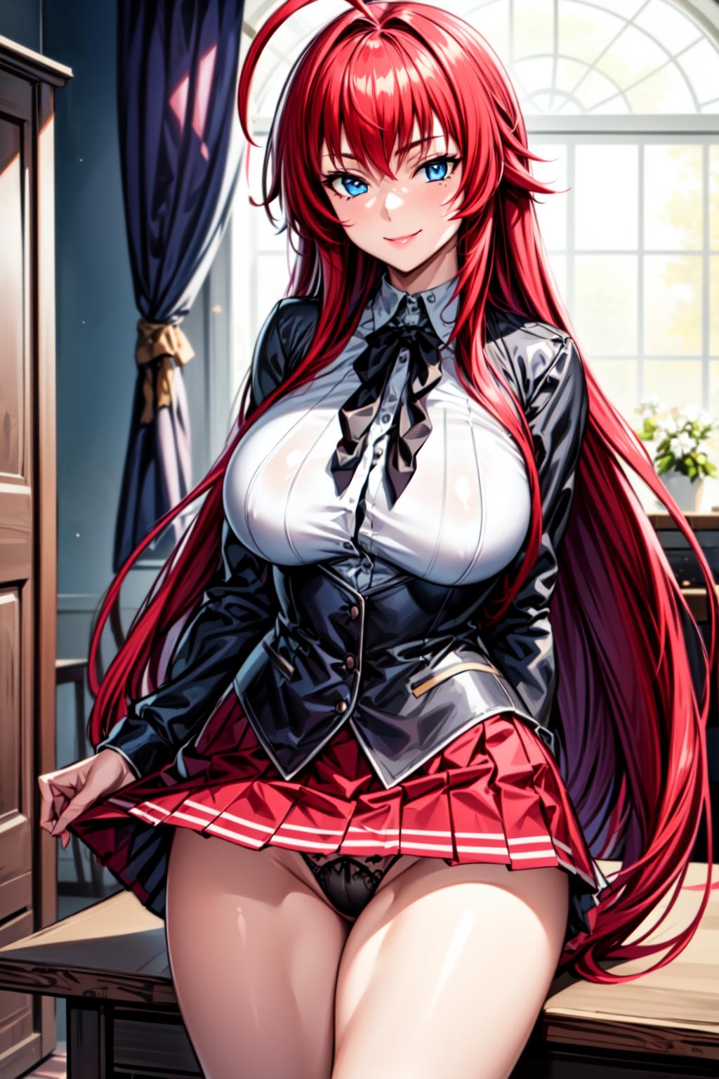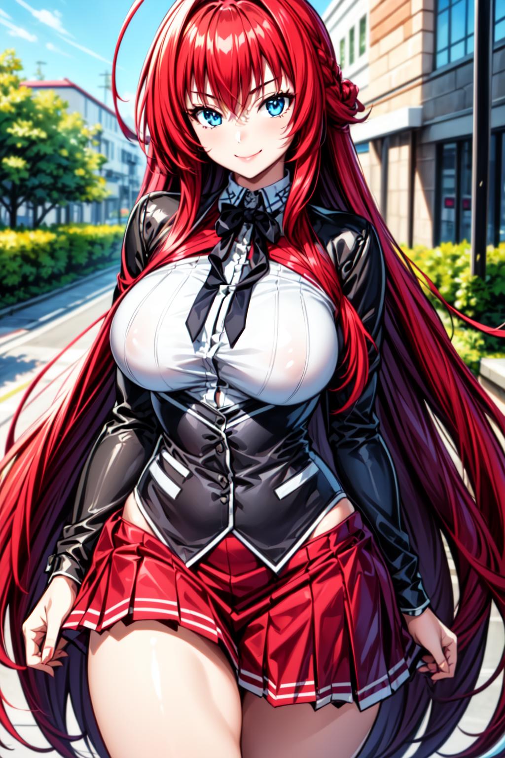 RiasGremoryNDV, 1girl, red hair, large breasts, very long hair, ahoge, blue eyes, red skirt, school uniform, shirt, corset