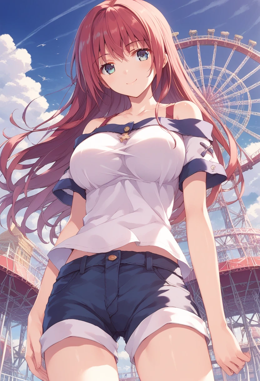 long hair: raika misaki,red hair,long hair,large breasts,short sleeves,bare shoulders,shorts,single thighhigh,