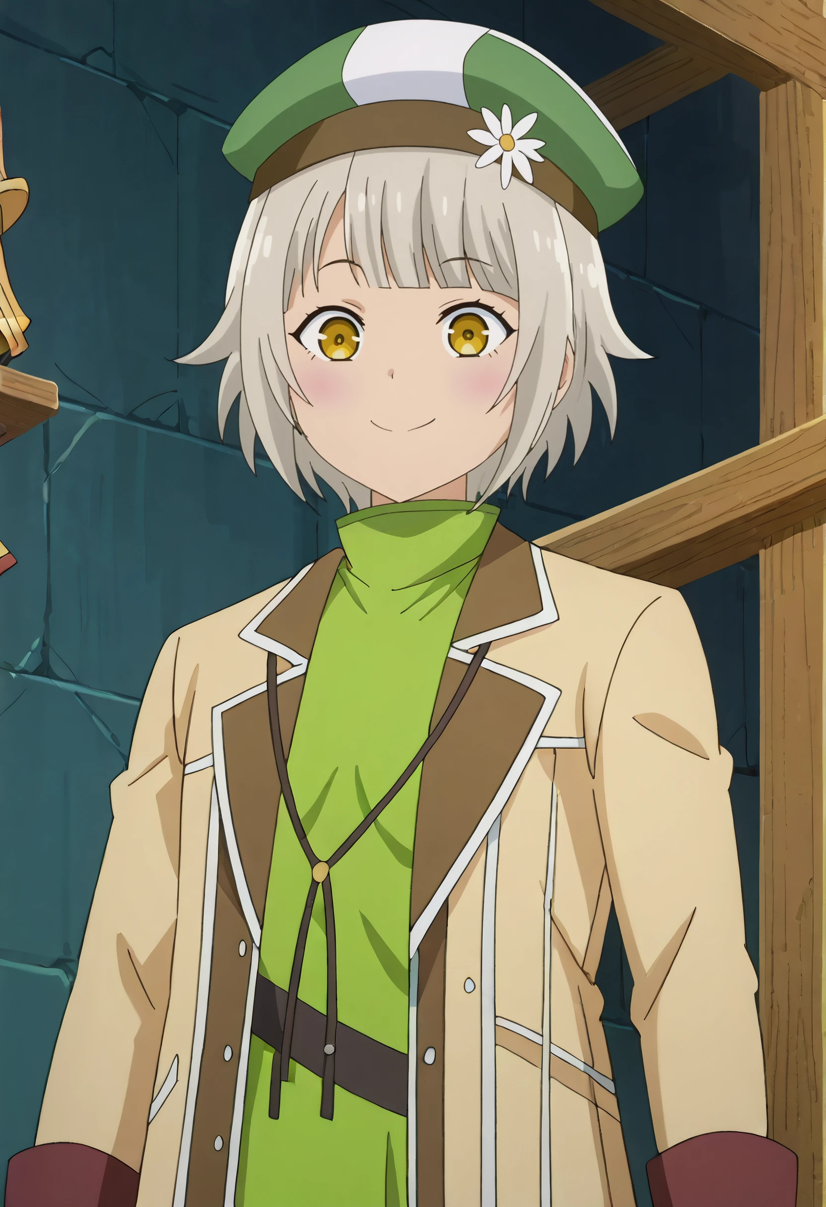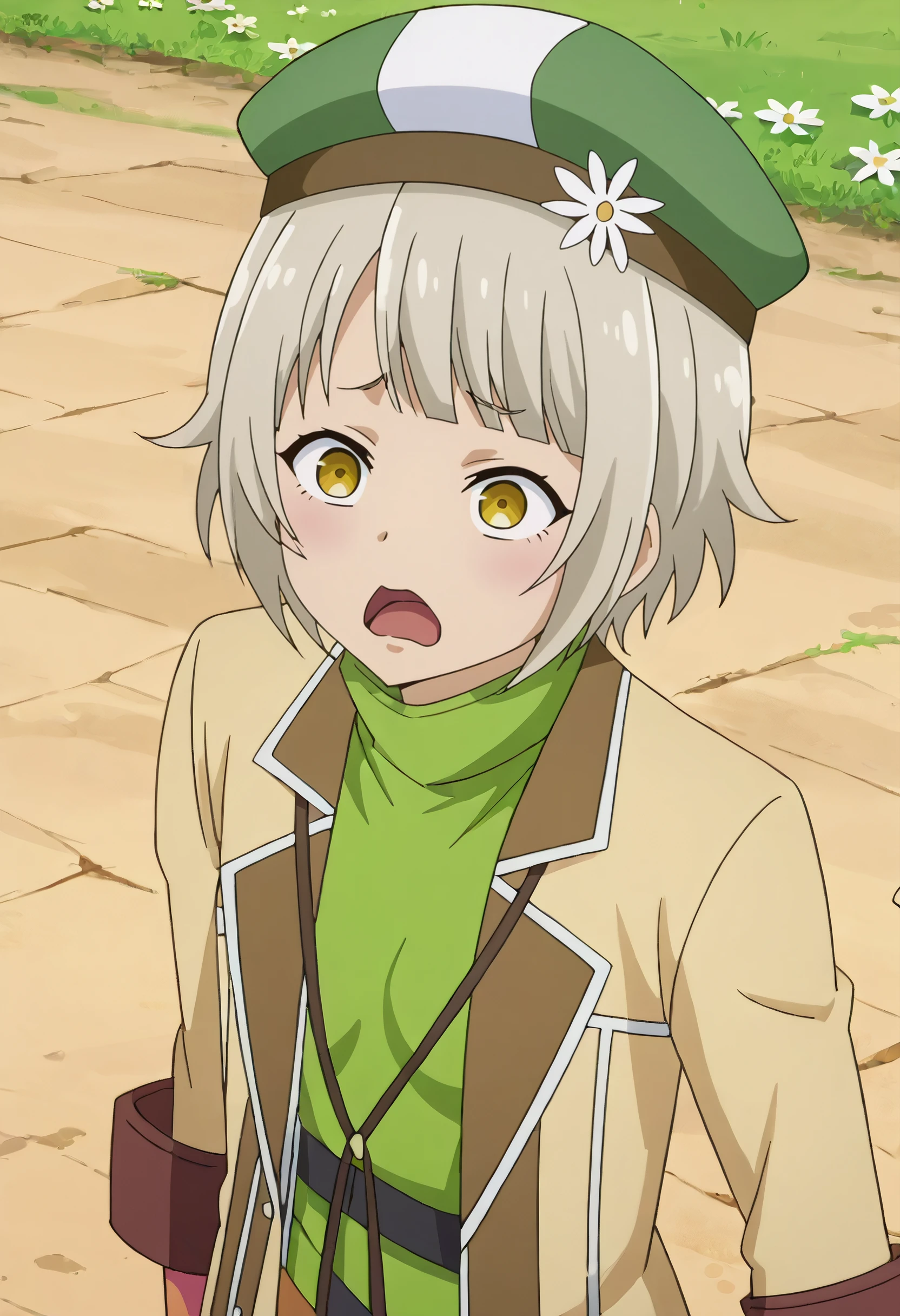 AlmaJacket, brown jacket, green hat, green shirt, beret, turtleneck, long sleeves, open clothes, flower, green headwear, green sweater, open jacket, turtleneck sweater, white flower, striped headwear, striped clothes, green pants, notched lapels, hair flower, multicolored headwear, vertical-striped headwear, multicolored hat, brown coat, shoes, white socks, brown footwear, necklace, jewelry, hair ornament,