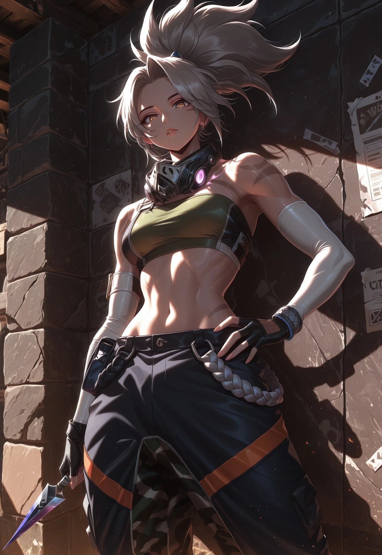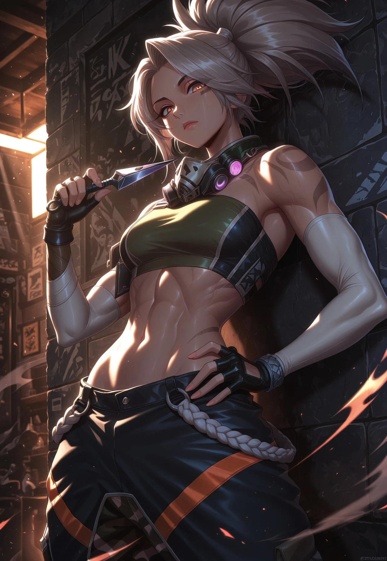 TDakali,grey hair,medium hair,ponytail,asian,multicolored pants,baggy pants,green top,bare shoulders,fingerless gloves,kunai