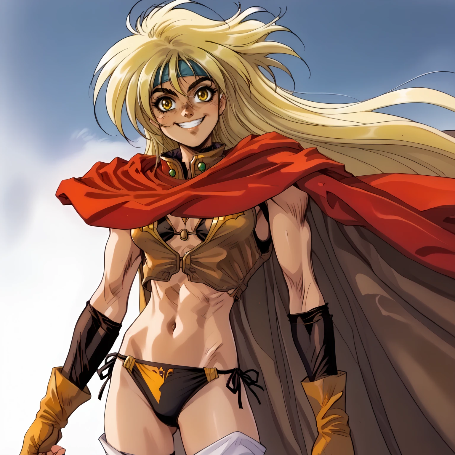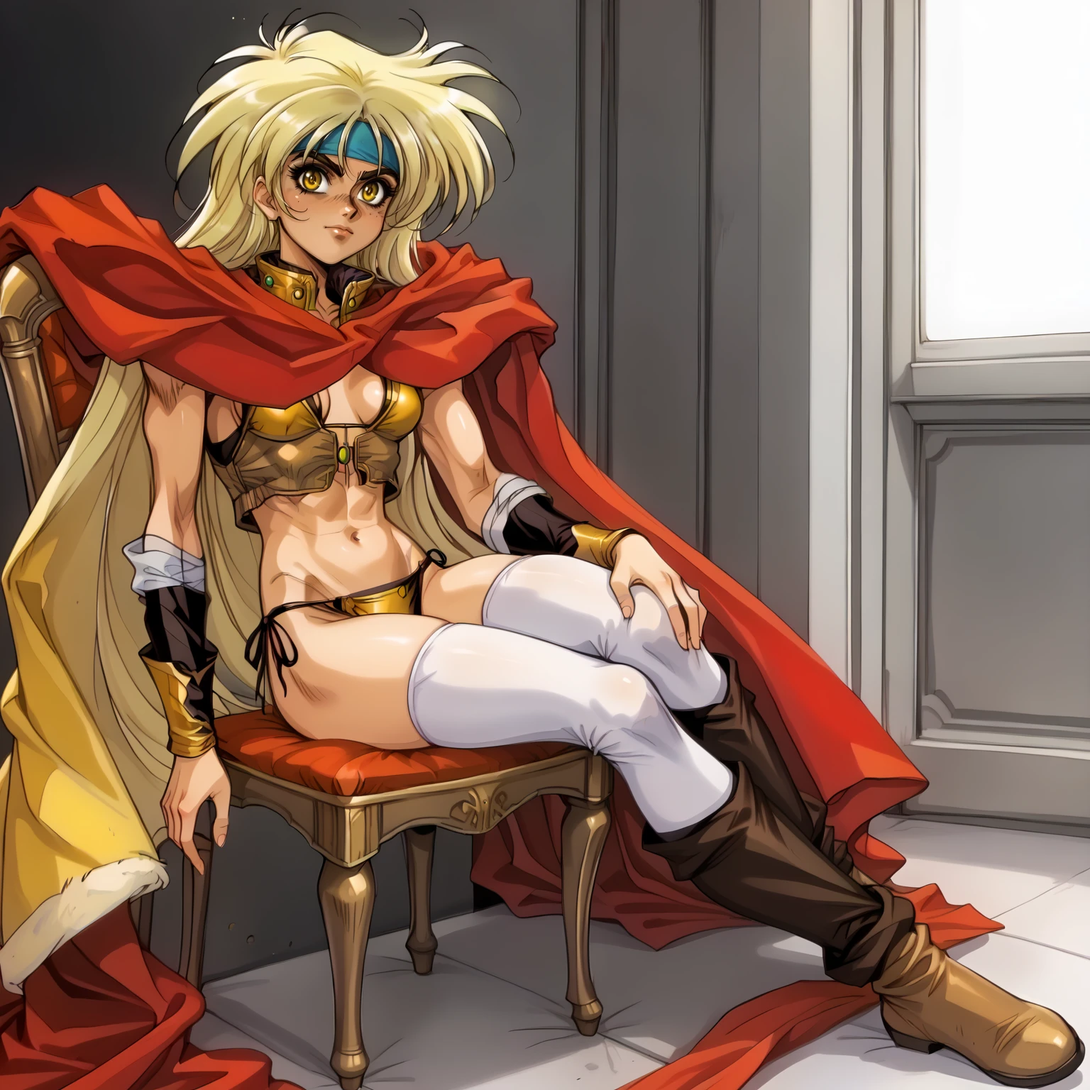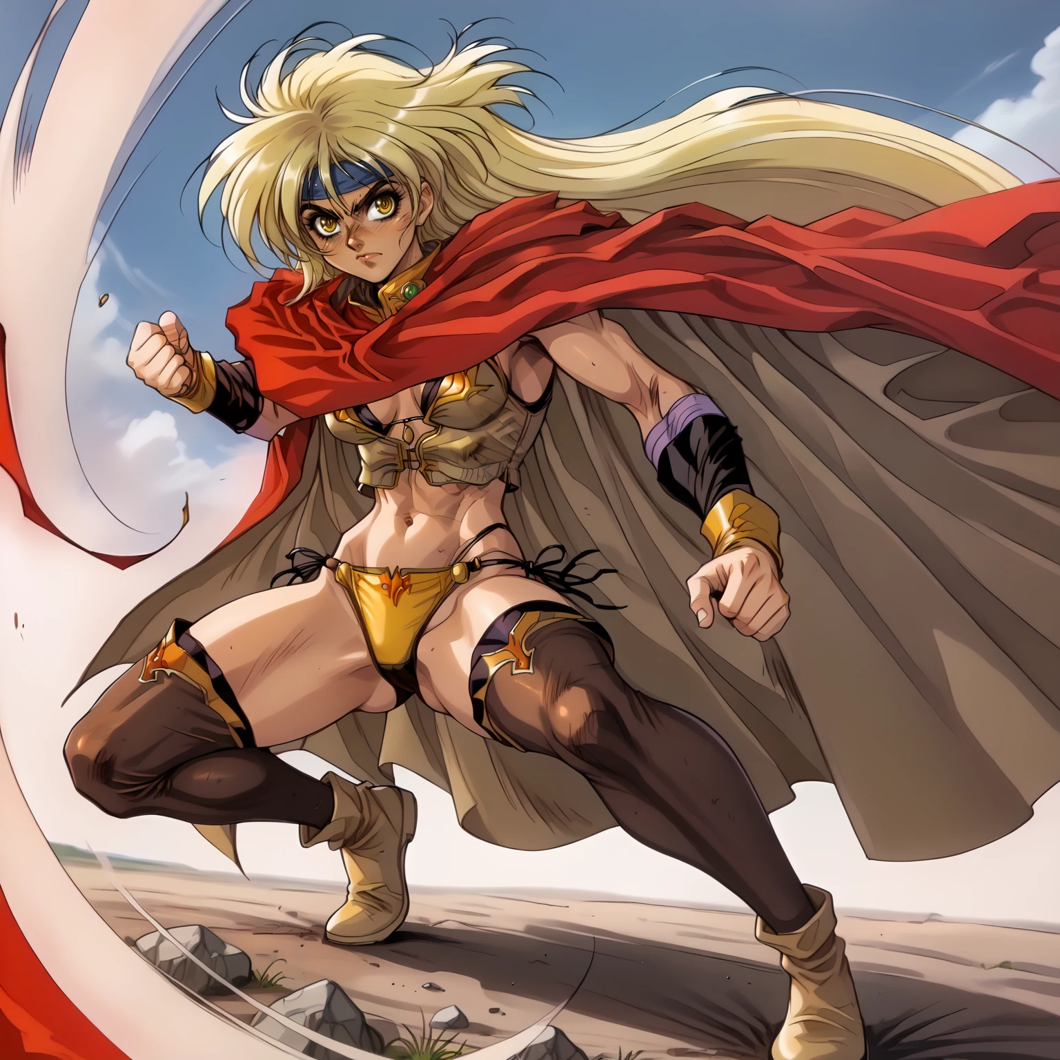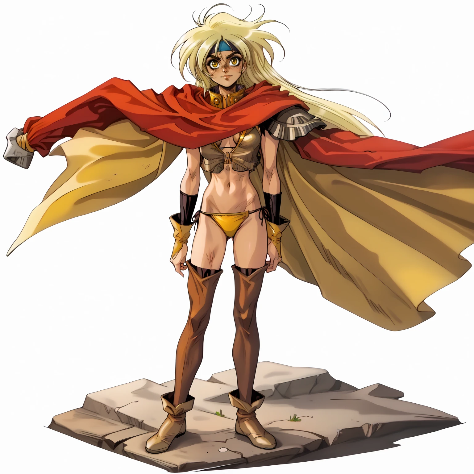 cape,coat, crop_top,bikini_armor, thighhighs,