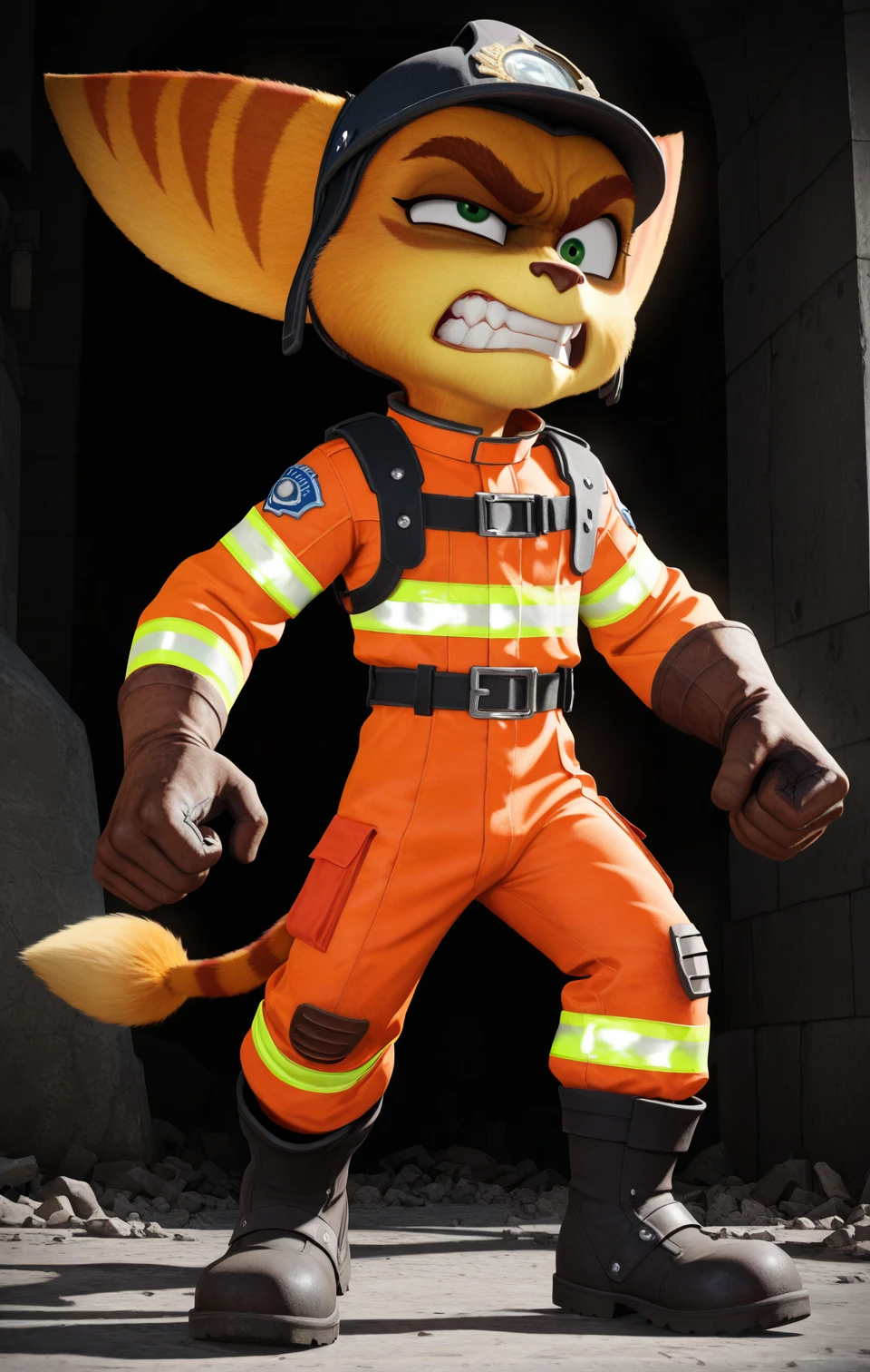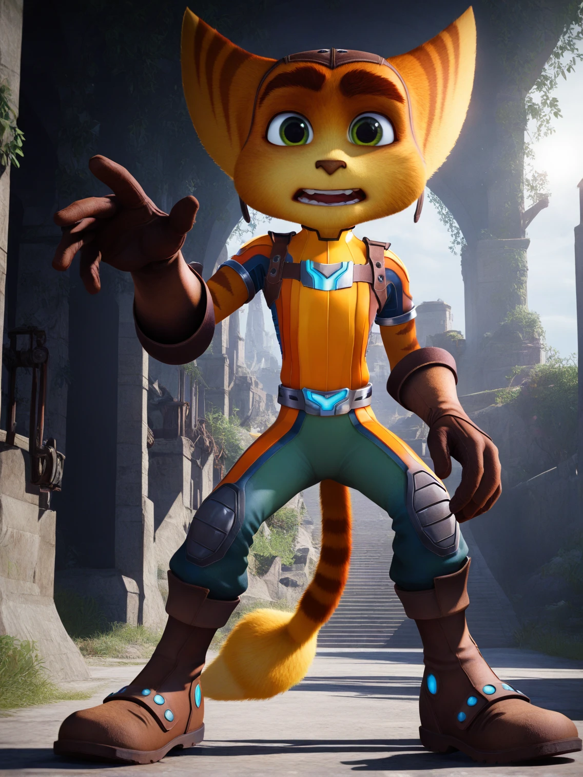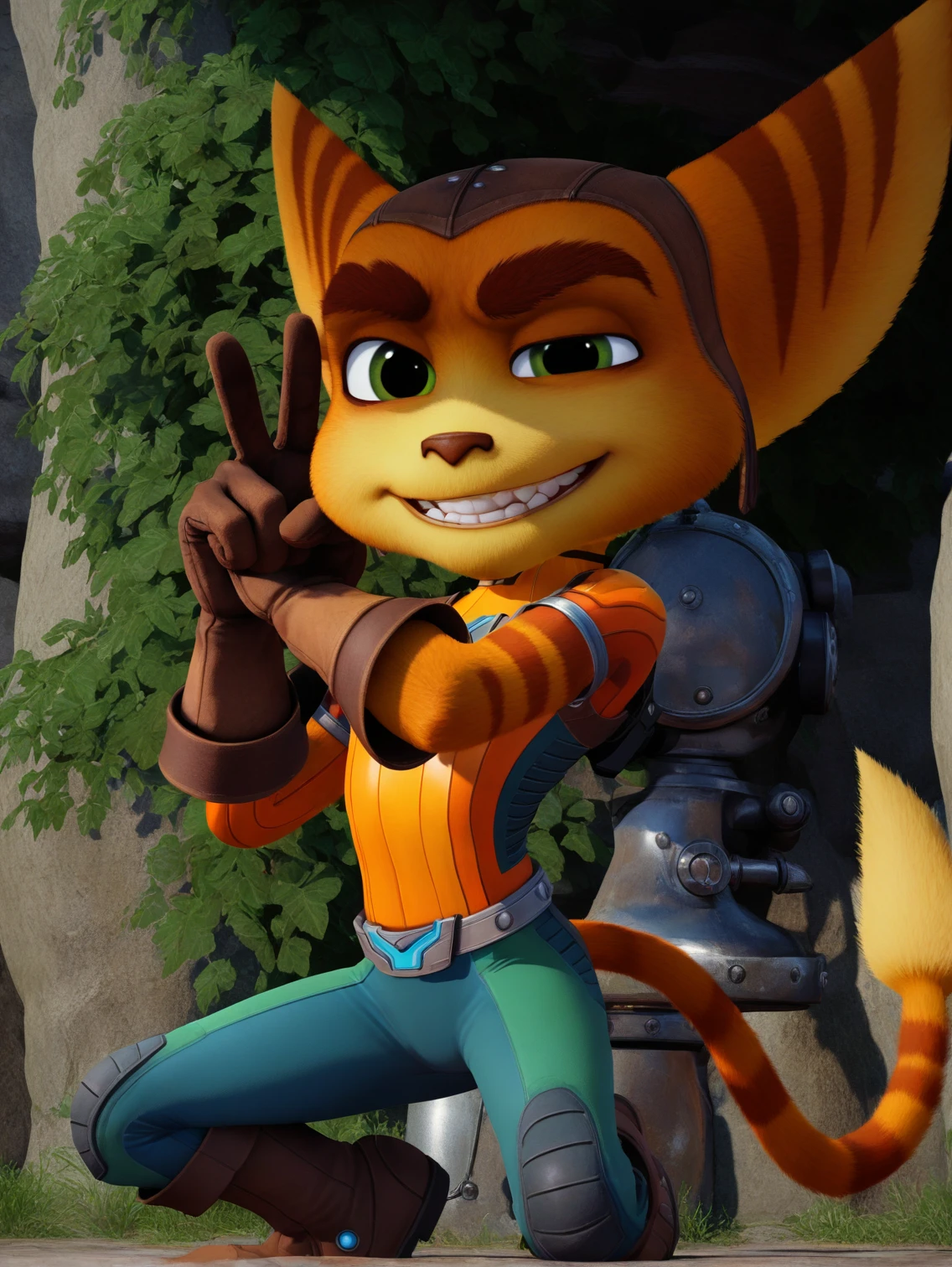 Reinforcement Tags: green eyes,furry, lombax, striped body, orange shirt, tail, boots, pants,