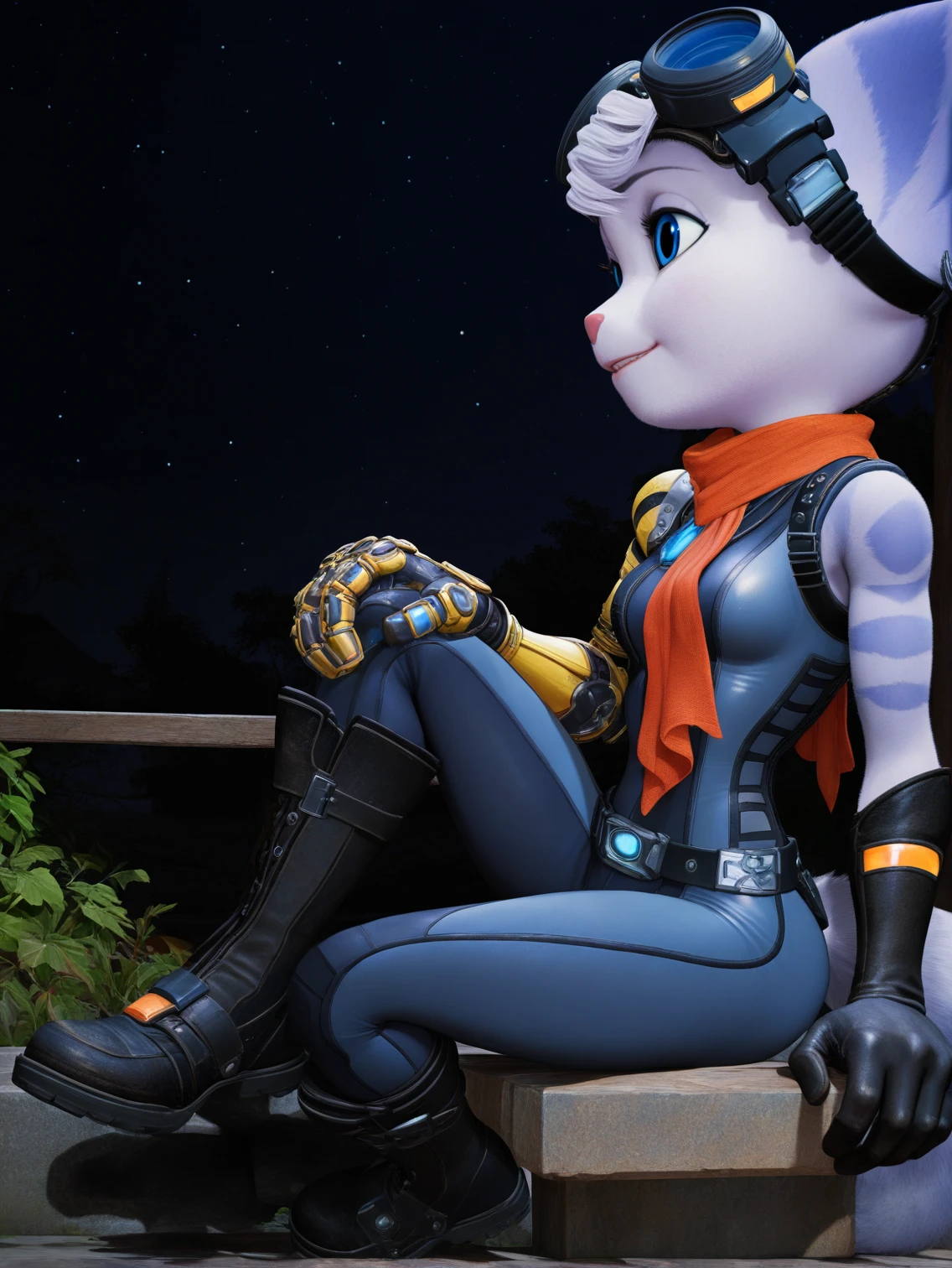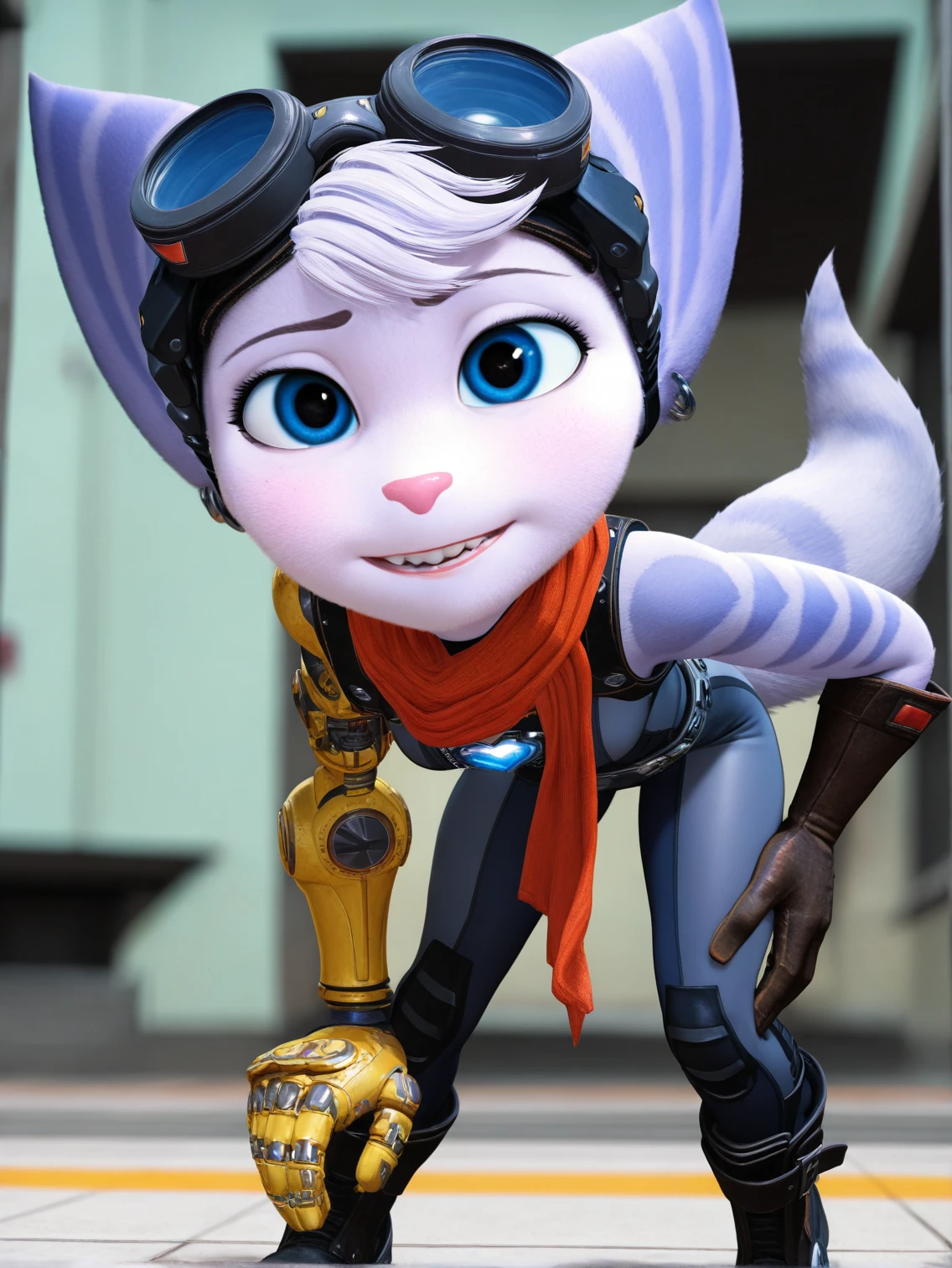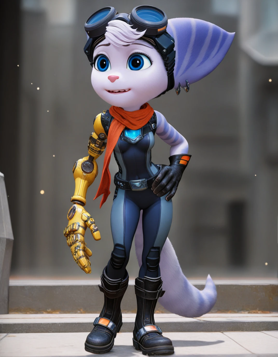 Reinforcement Tags: blue eyes,furry, lombax, striped body, goggles on head, ear ring, cybernetic arm, bodysuit, red tie, boots