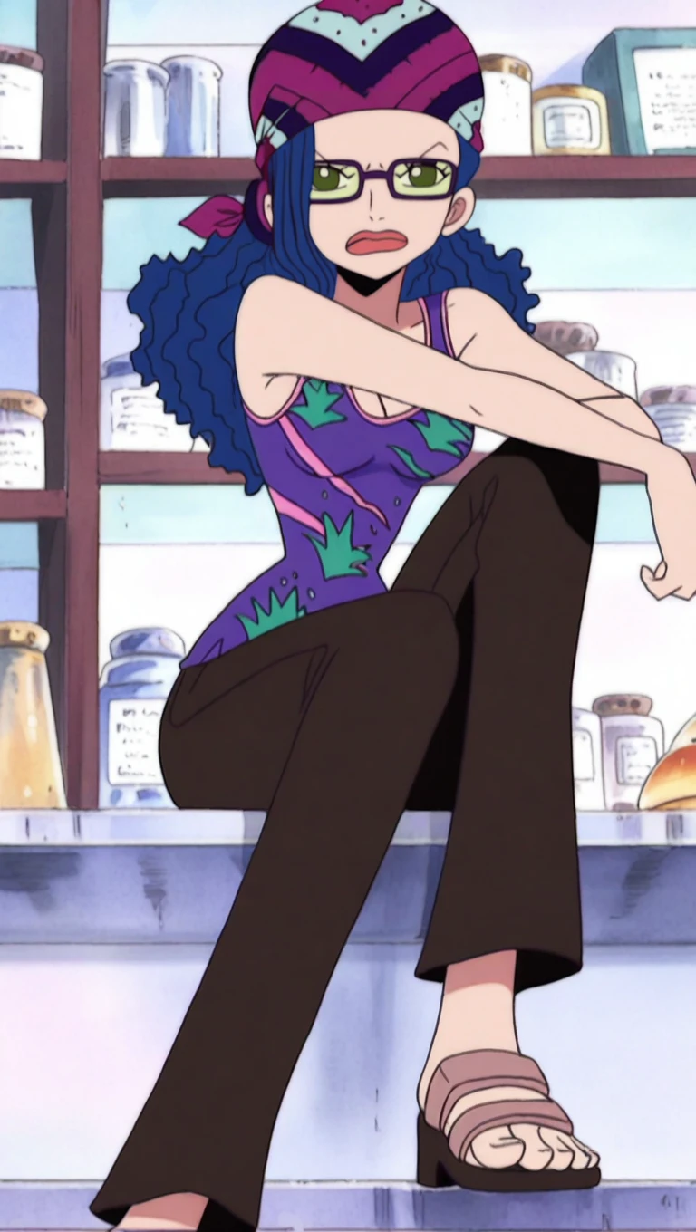 c0ff3e shop outfit, ponytail, glasses, purple and pink tank top, plant decal, purple and pink durag, brown pants, breasts, medium breasts, cleavage,