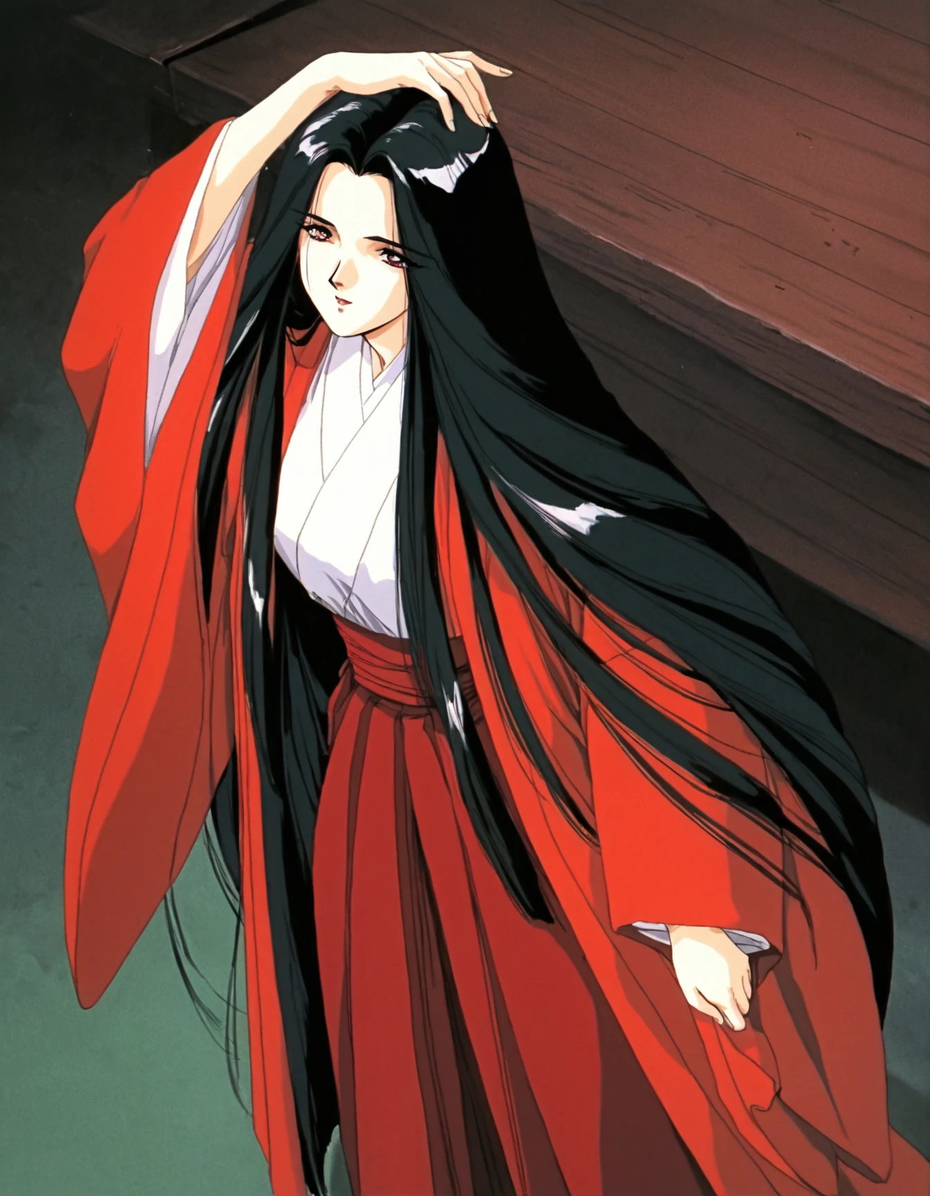 long hair, skirt, long sleeves, japanese clothes, wide sleeves, kimono, hakama, hakama skirt, red hakama, red haori,