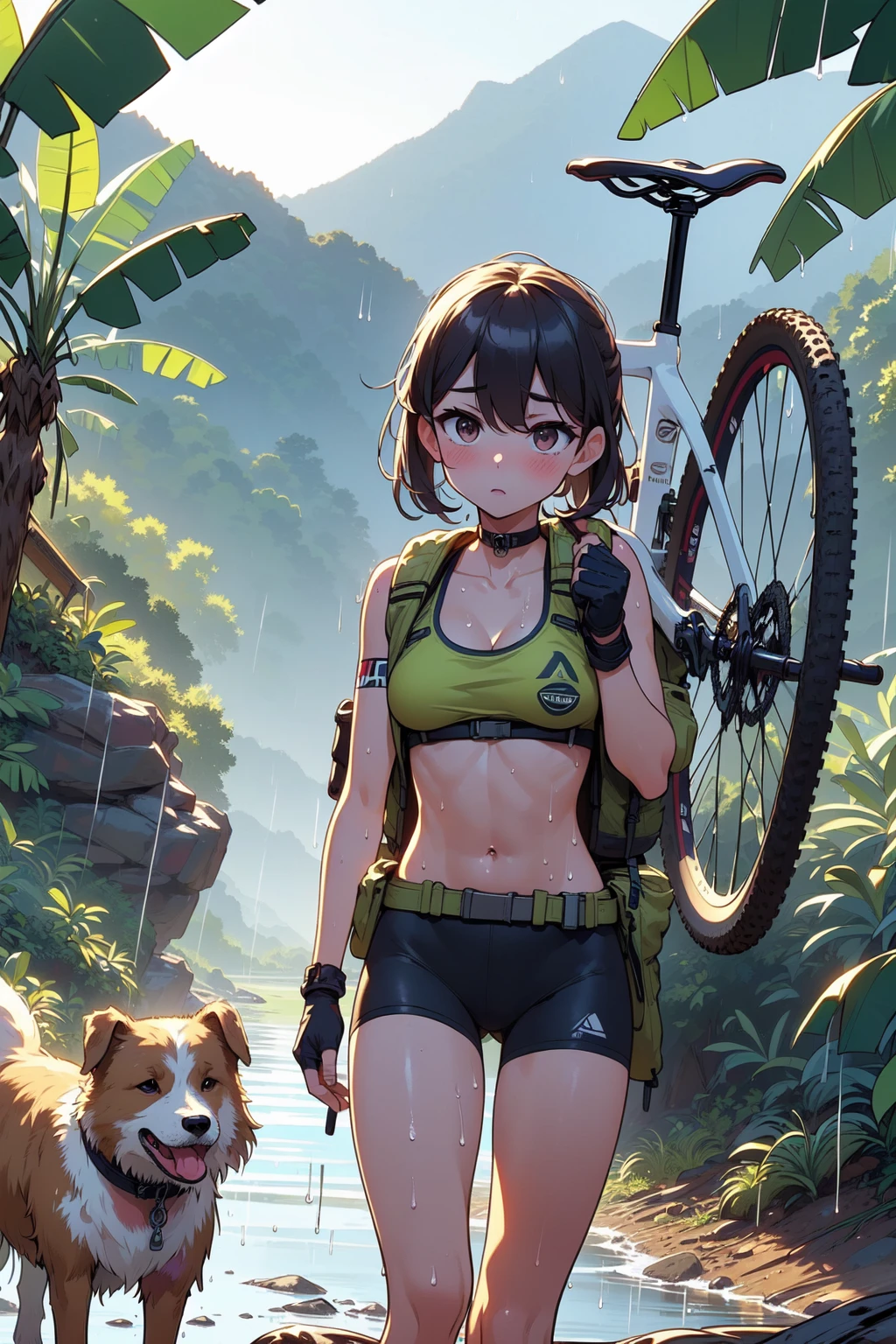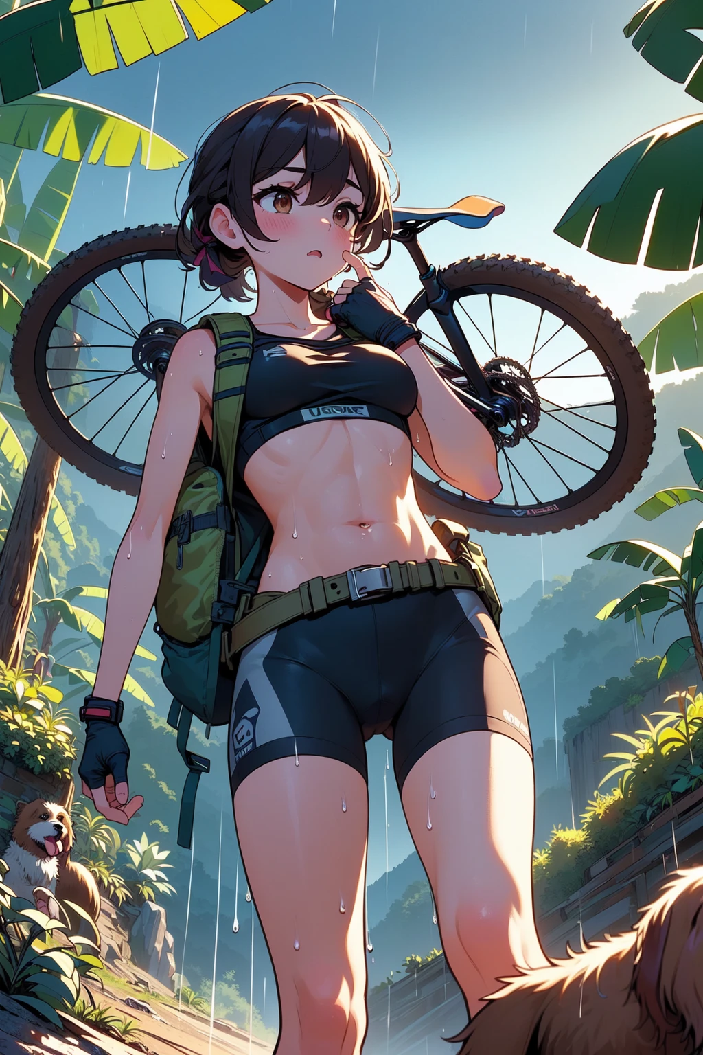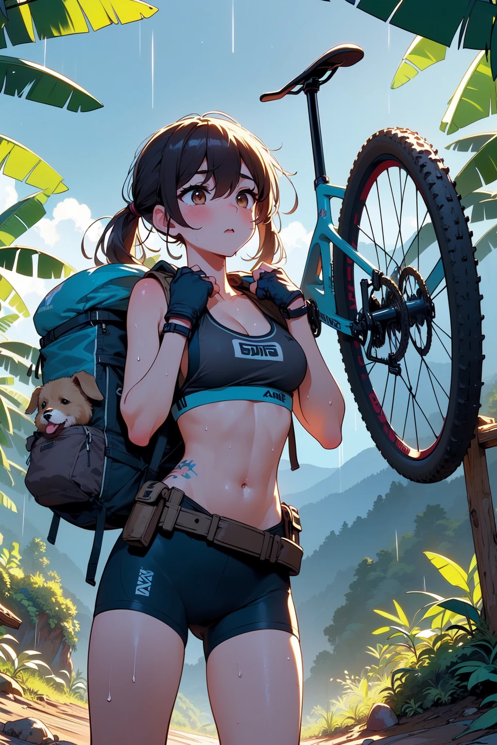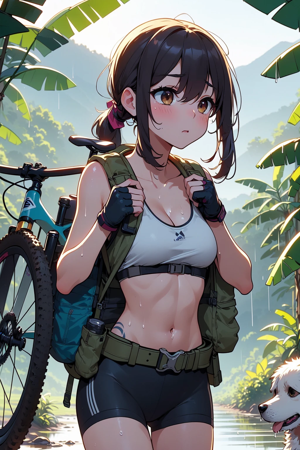 (((arthur dog))), (((raise arms))), (((fingerless gloves))), ((lifting a mountain bike)), ((sweat)), ((wet body)), ((belly tattoo)), armband, sports bra, bike shorts, backpack, mud, swamp, jungle, stream, (((raining))), (((dark night))),