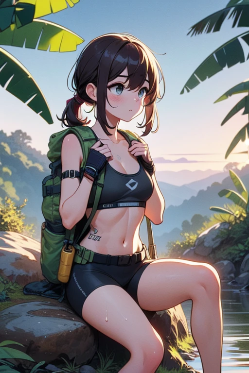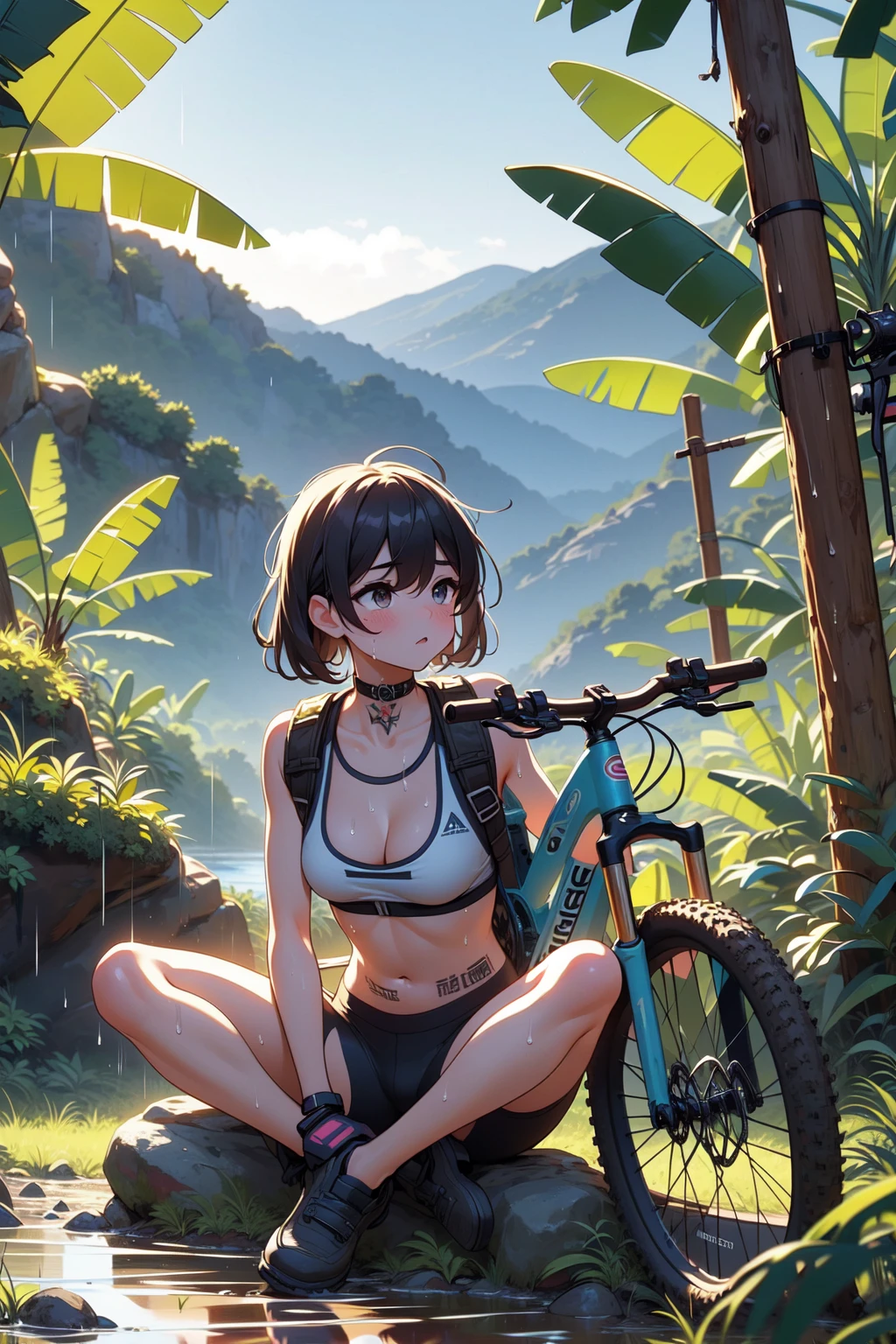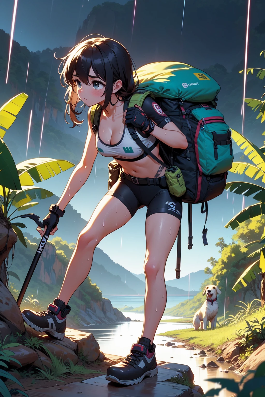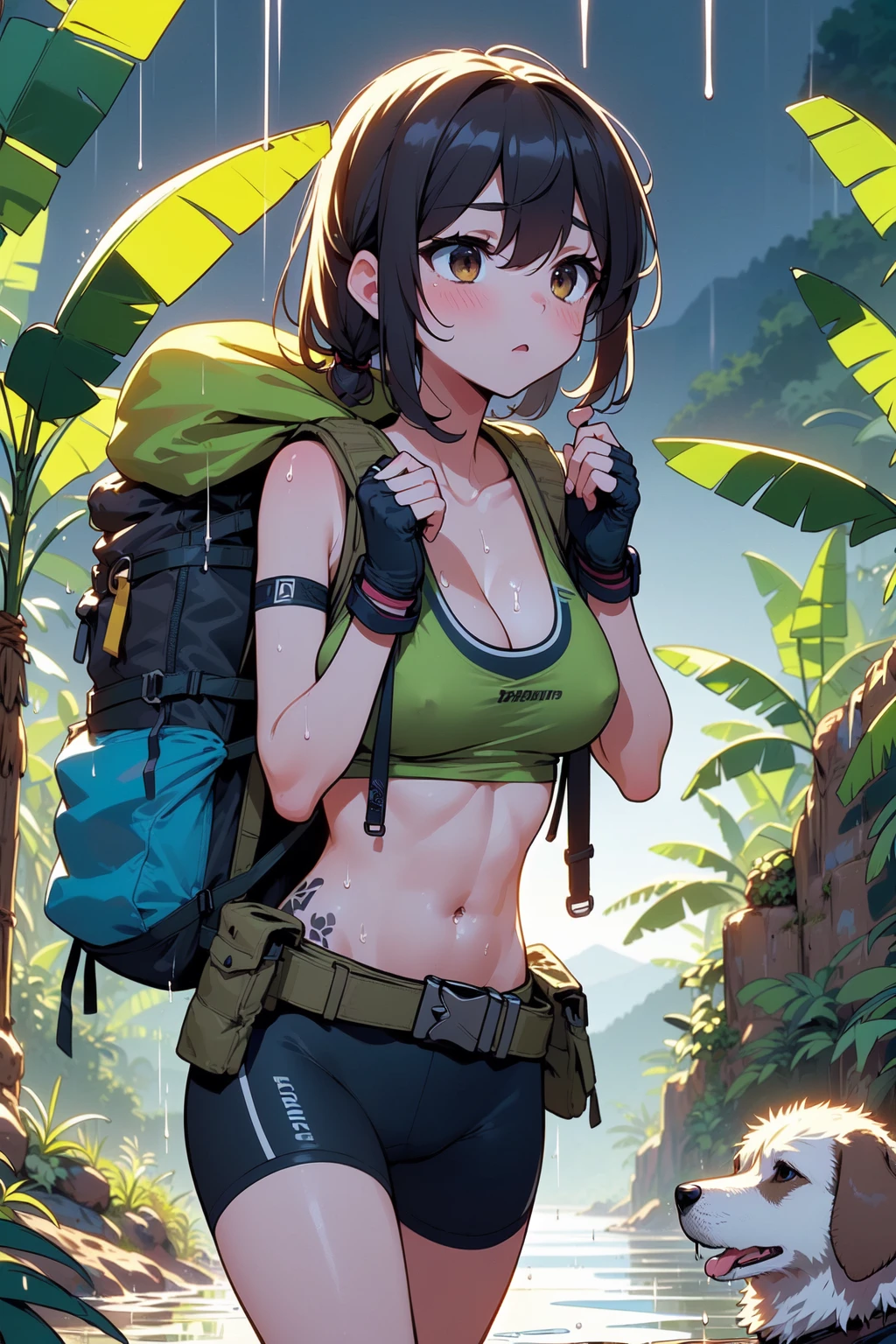 (((arthur dog))), (((raise arms))), (((fingerless gloves))), ((lifting a mountain bike)), ((sweat)), ((wet body)), ((belly tattoo)), armband, sports bra, bike shorts, backpack, mud, swamp, jungle, stream, (((raining))), (((dark night))),