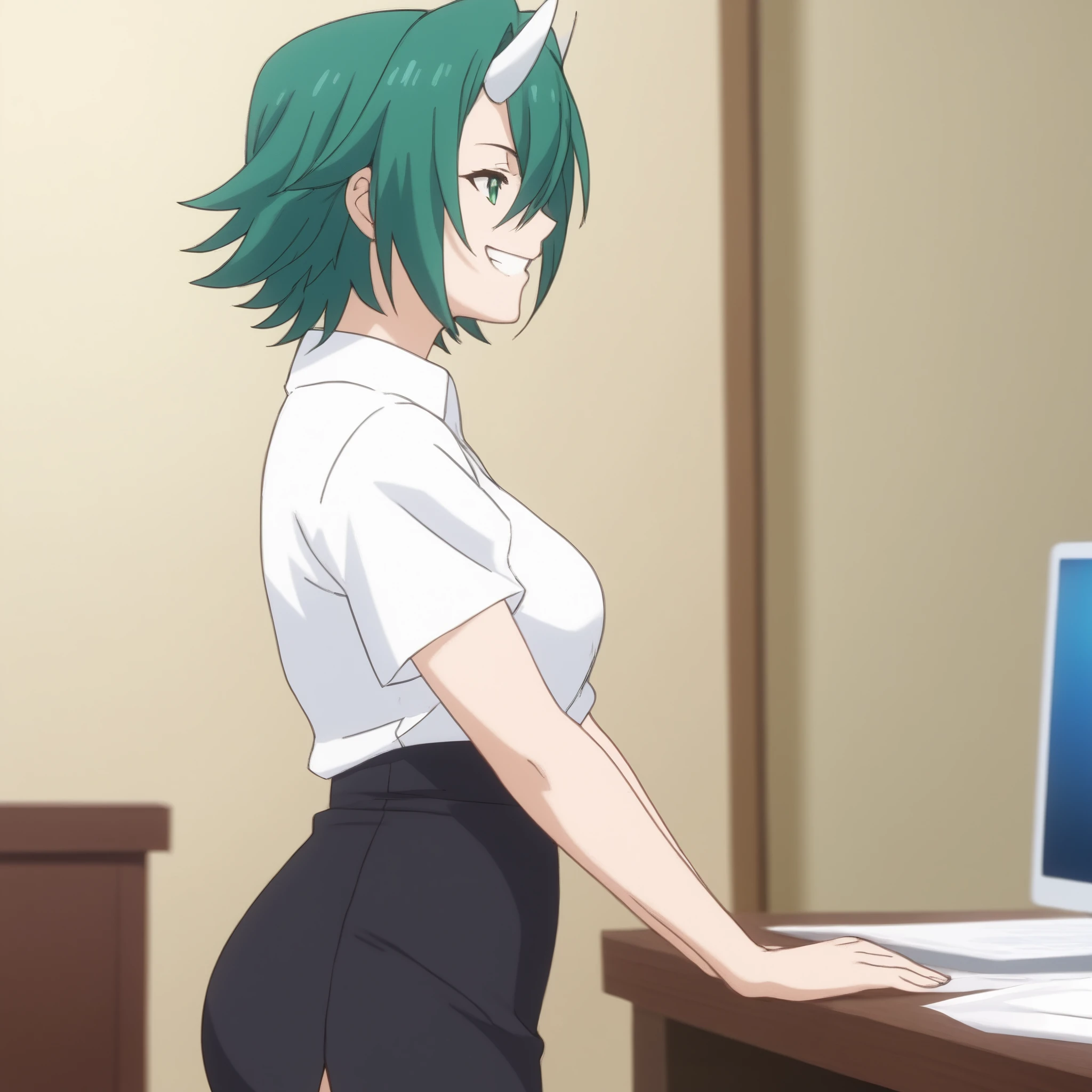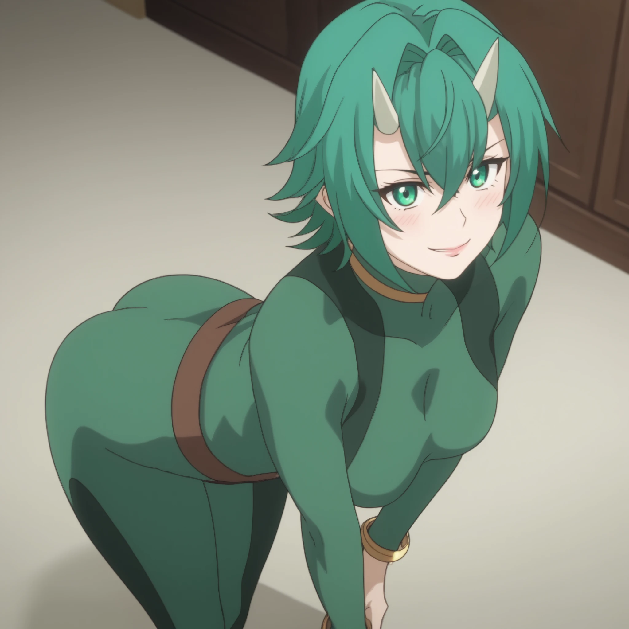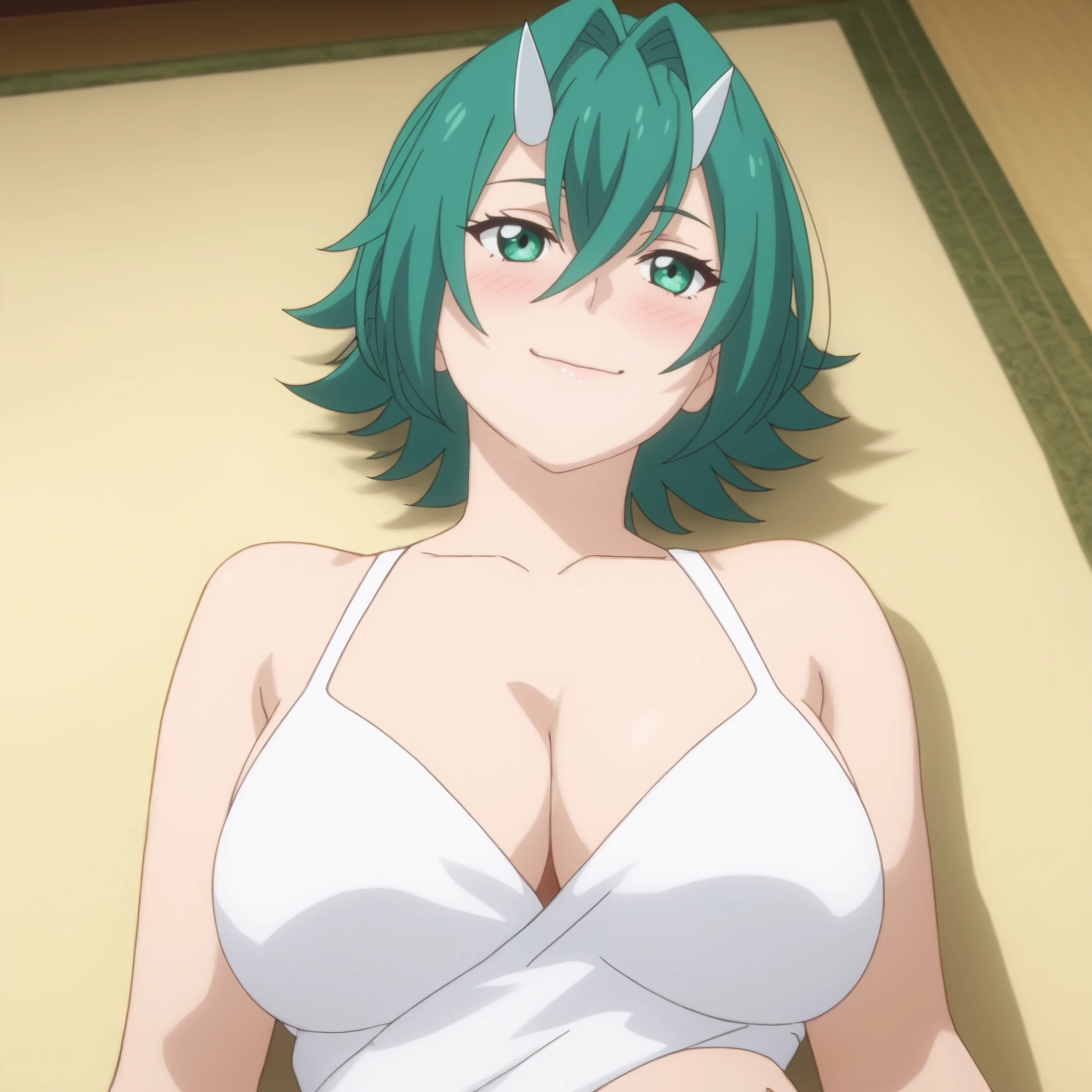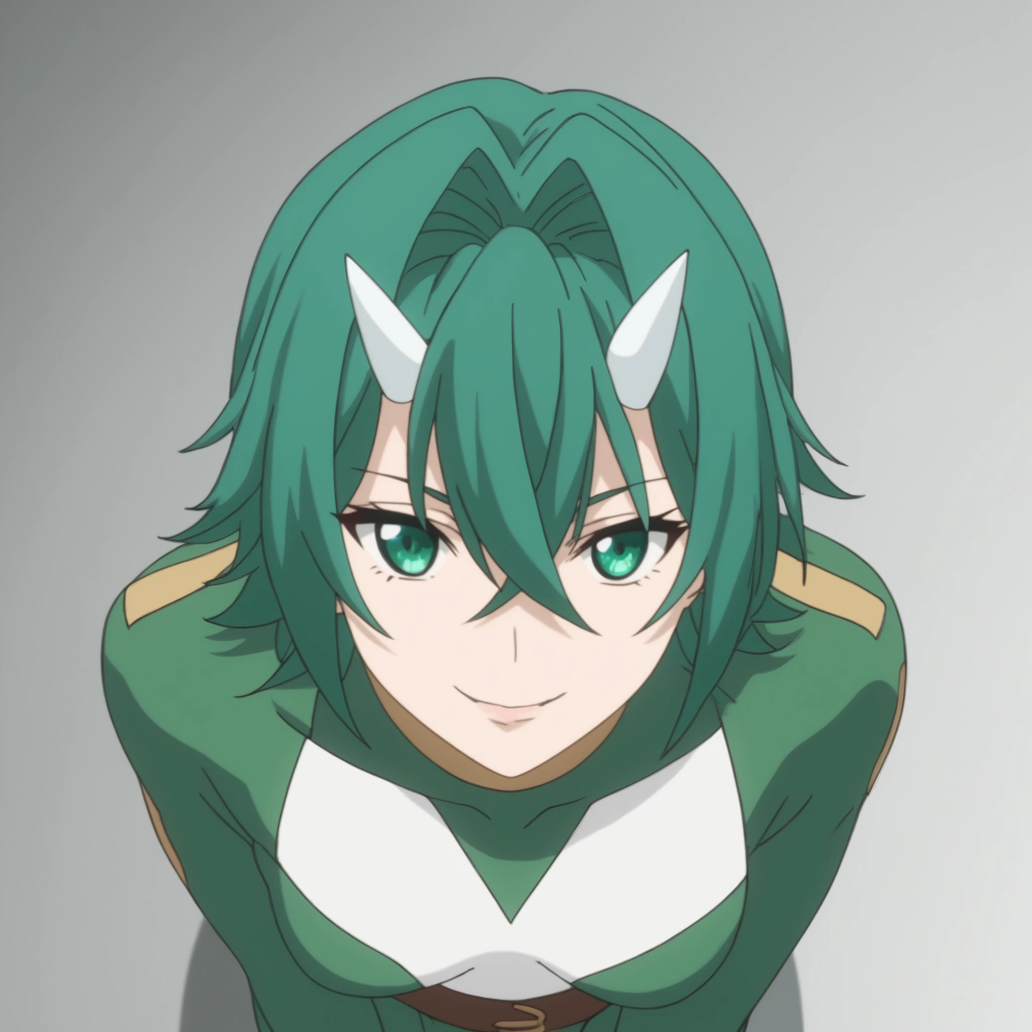 ReMonsterFuuki, green eyes, green hair, short hair, hair between eyes, horns, points ears,