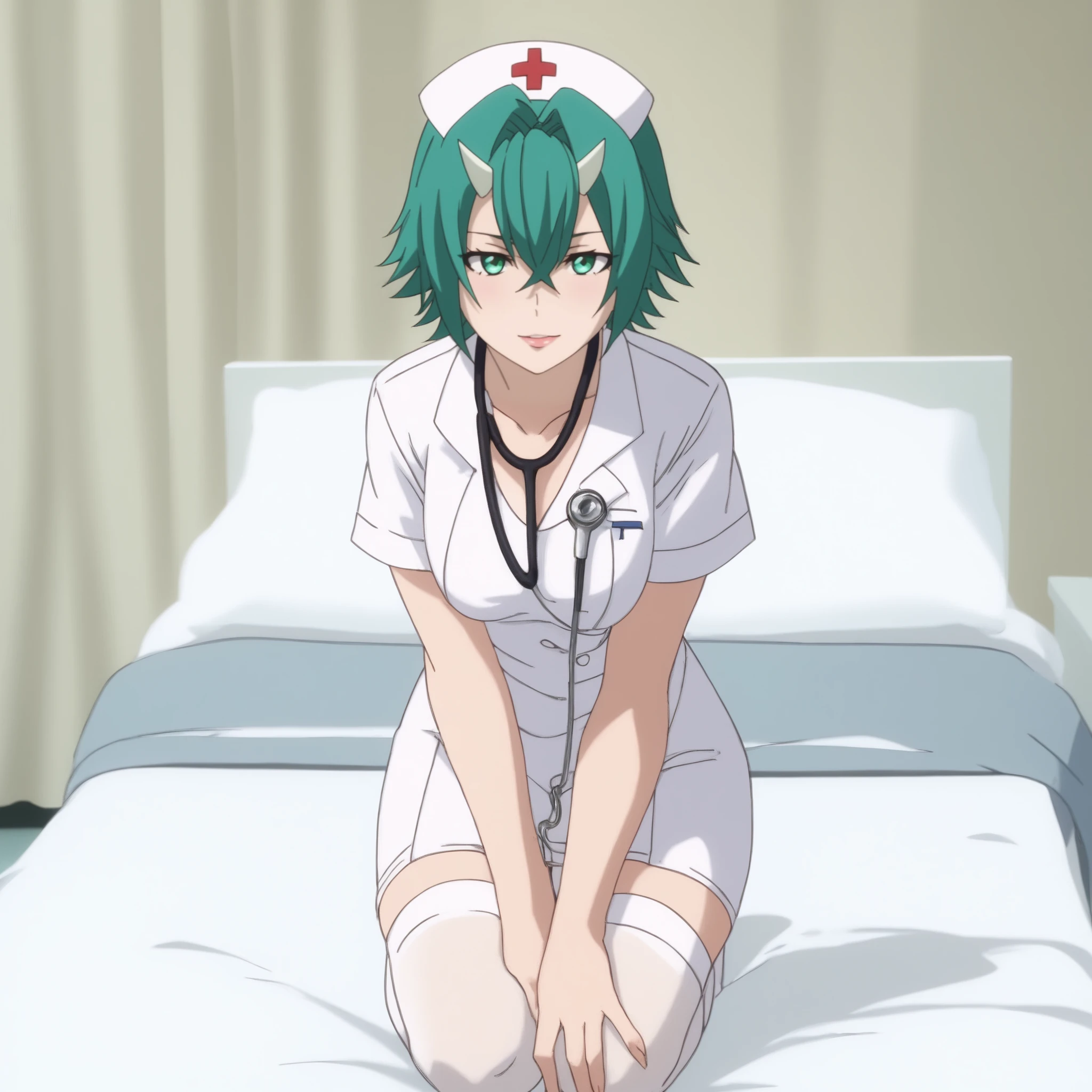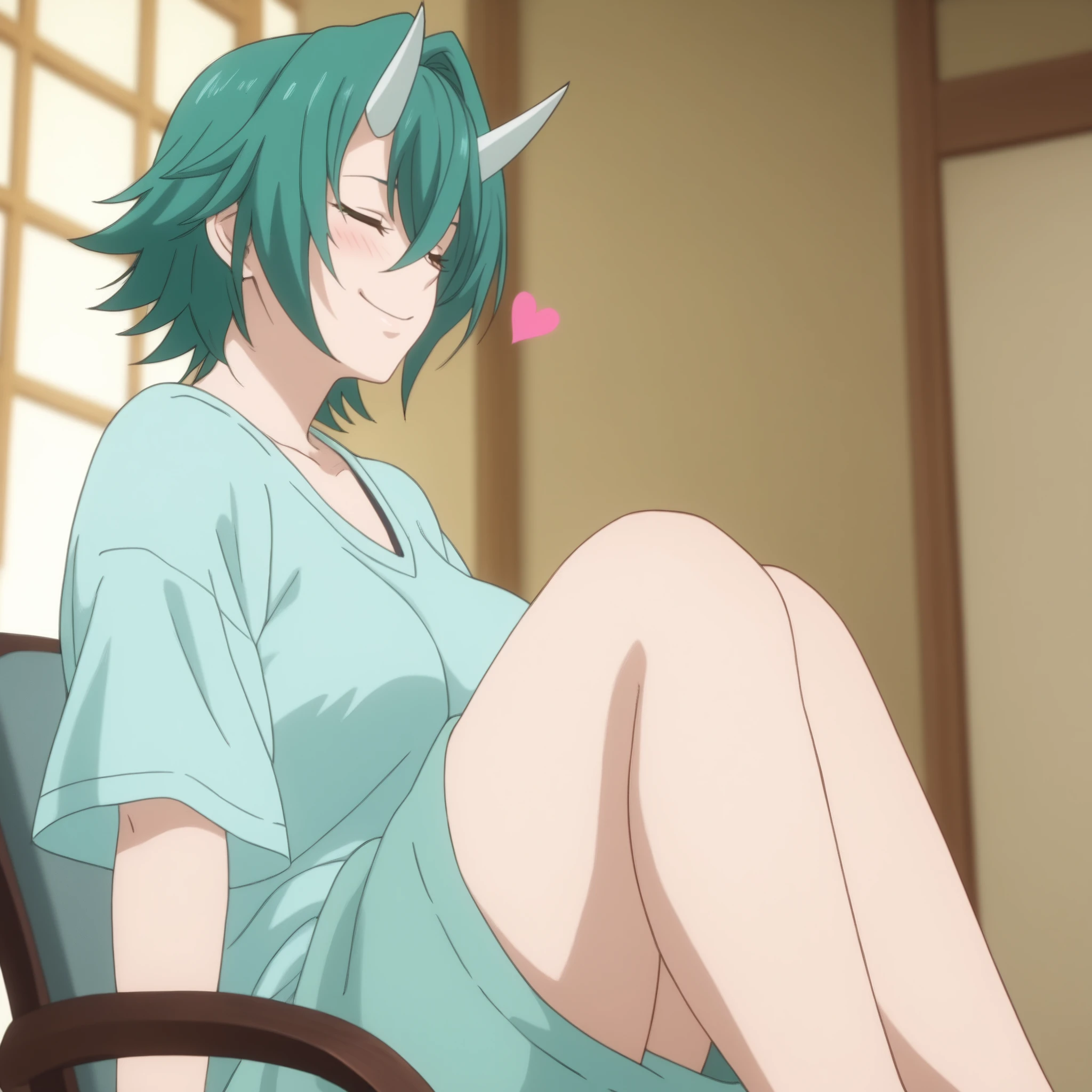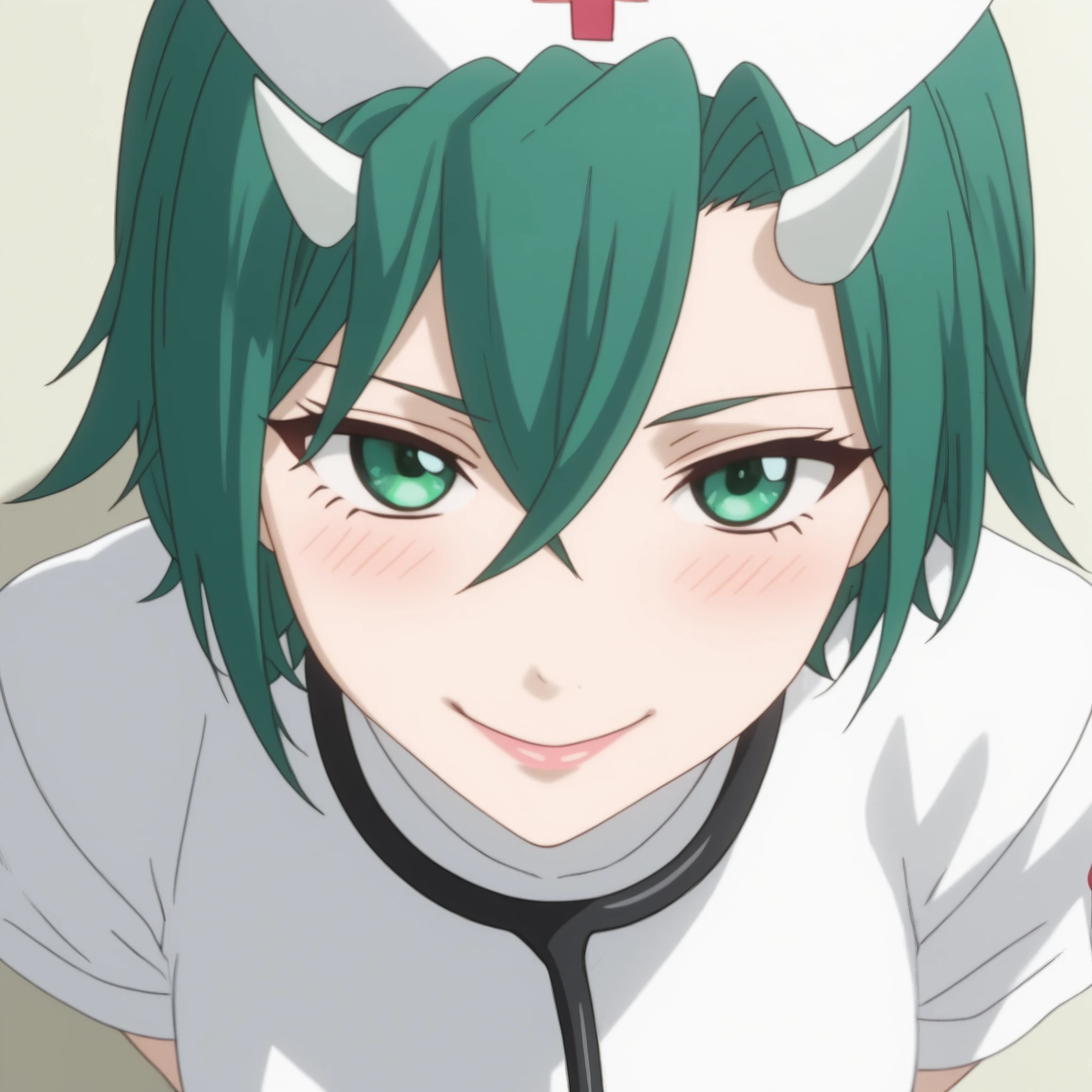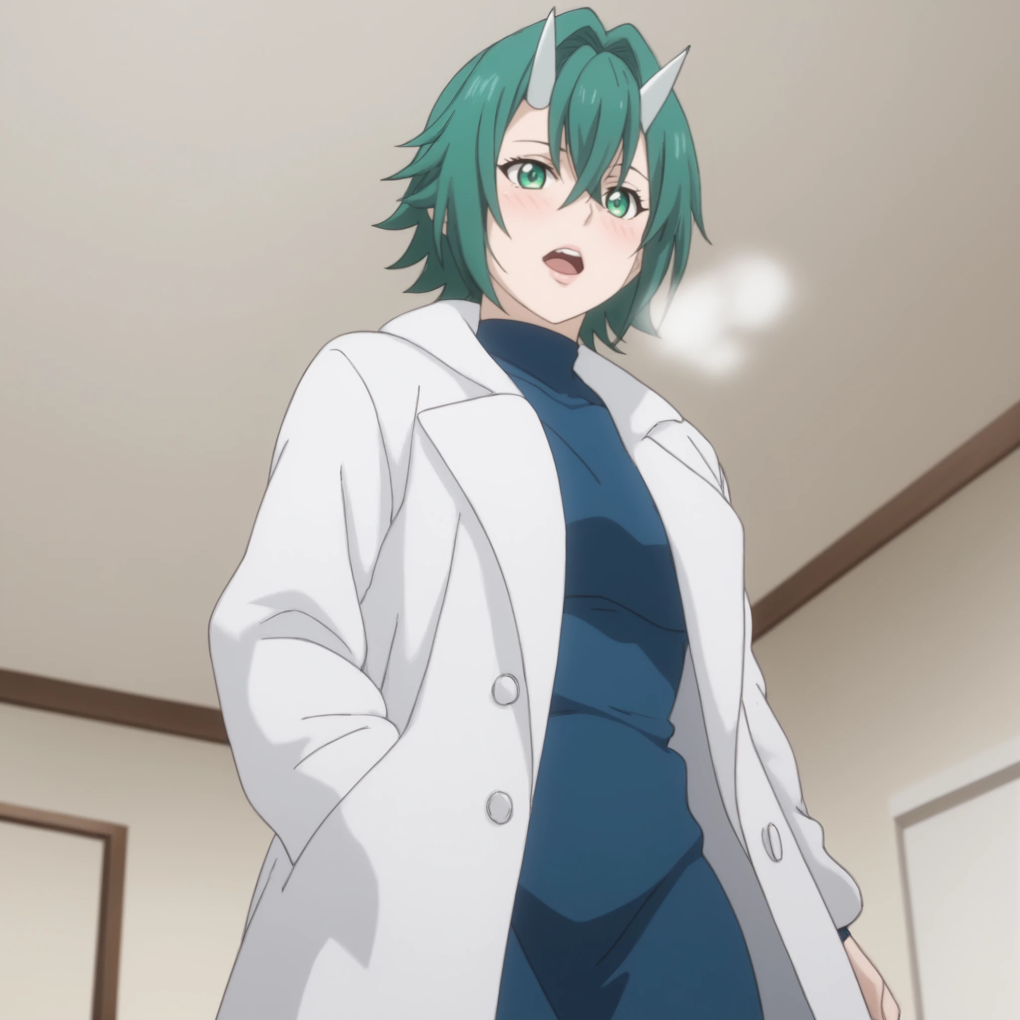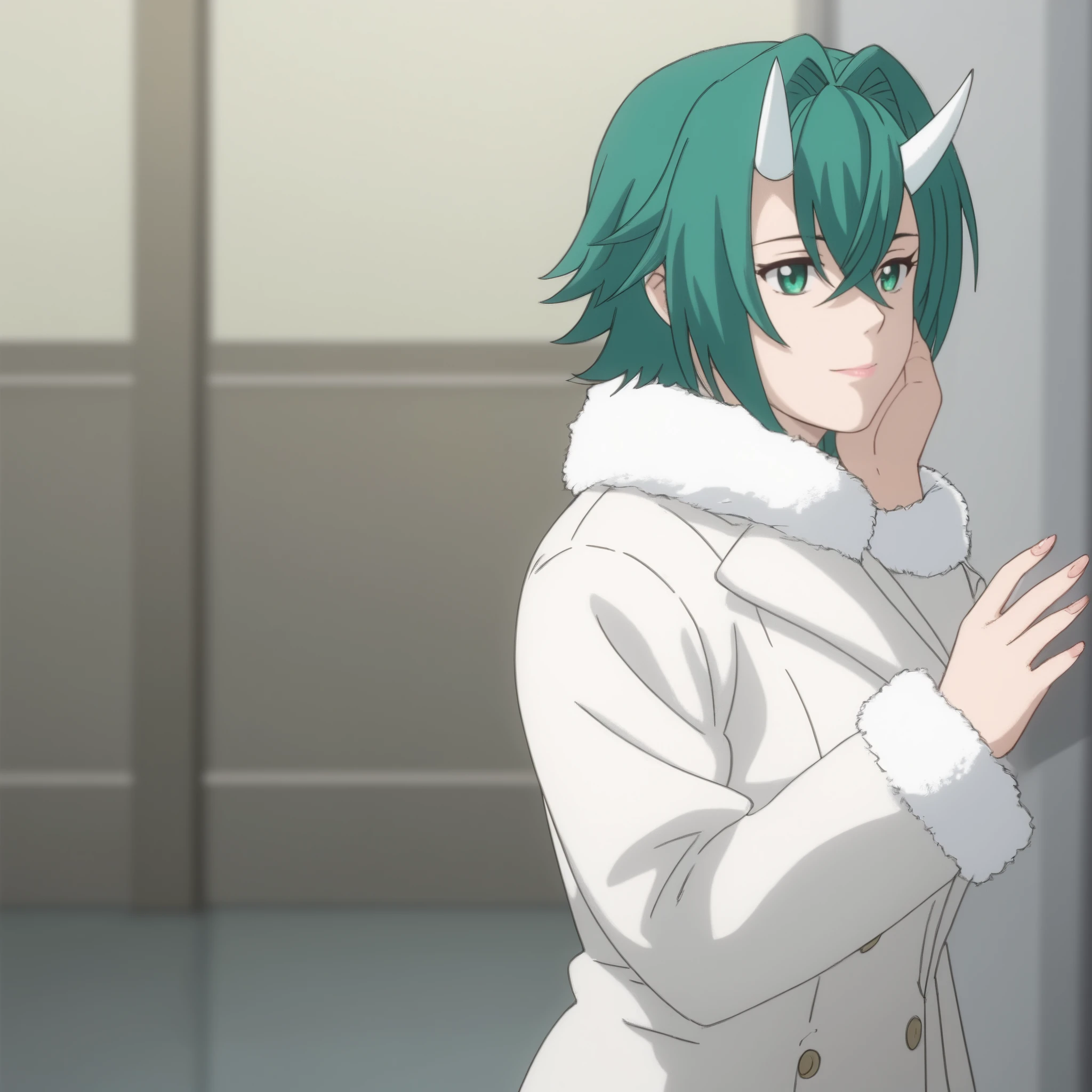 ReMonsterFuuki, green eyes, green hair, short hair, hair between eyes, horns, points ears,
