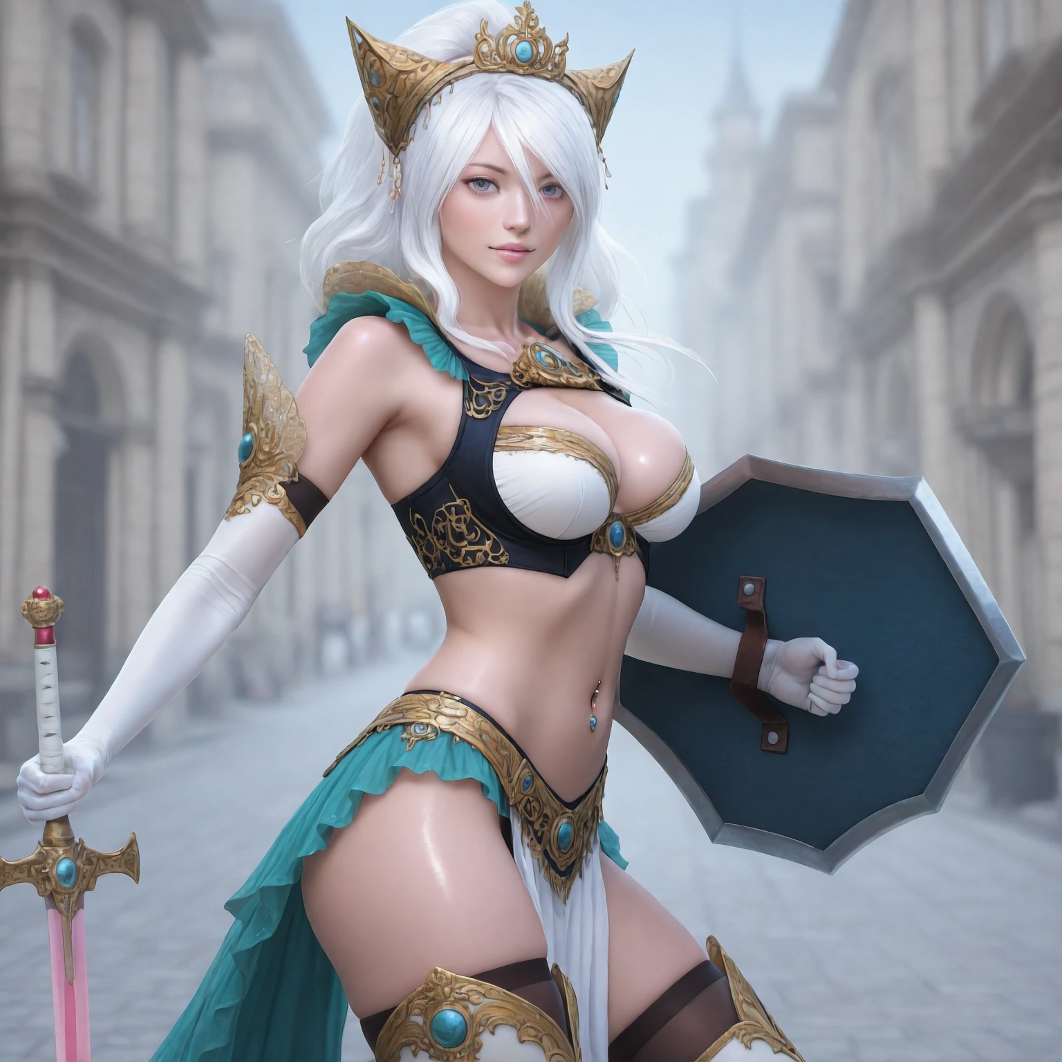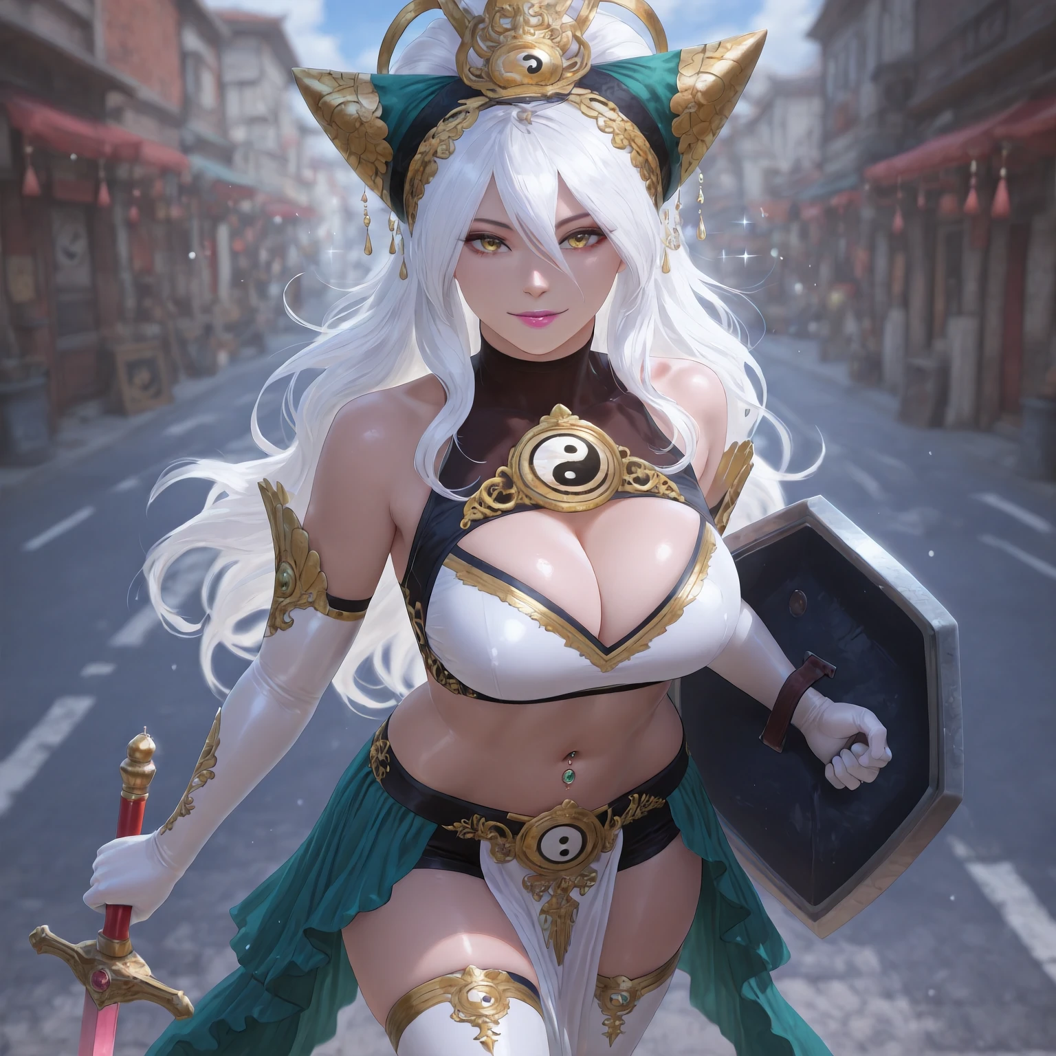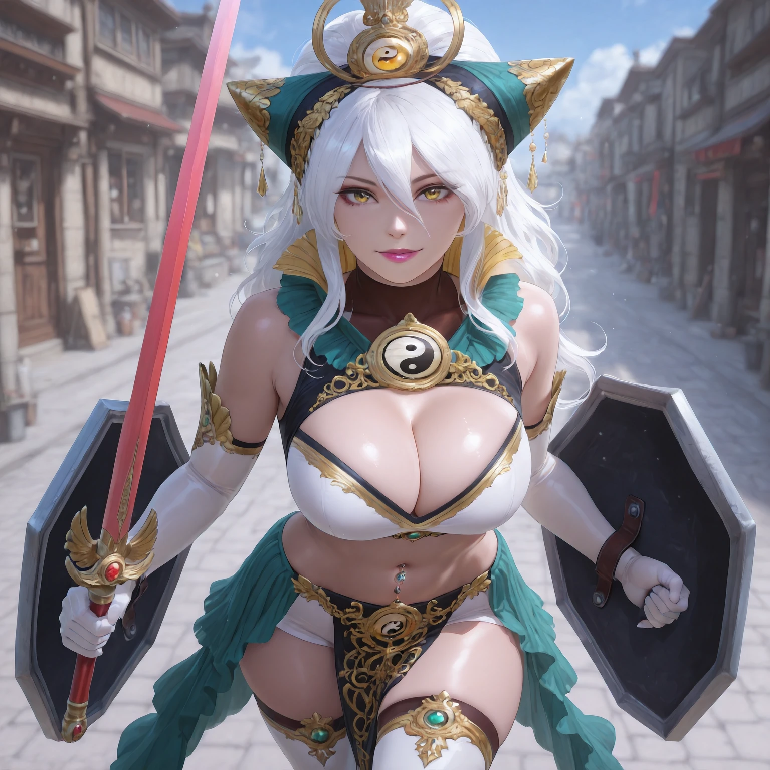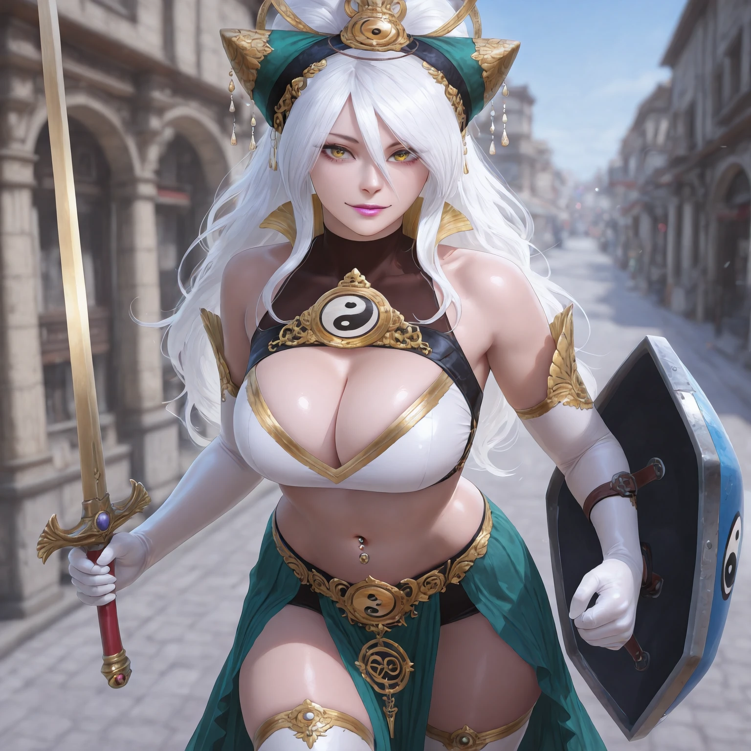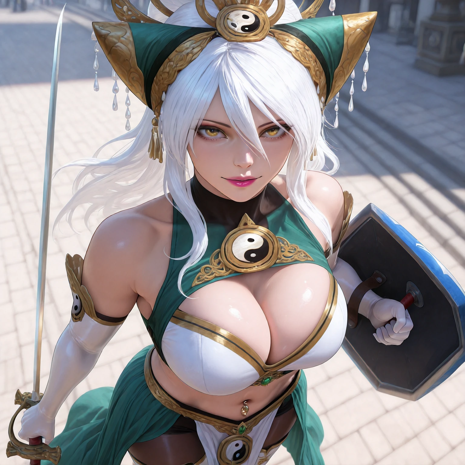 Nv wa,1girl,solo,weapon,sword,single_shield,white hair,navel piercing,midriff,thighhighs,navel,gloves,boots,elbow gloves,yin yang,headdress,bare shoulders,makeup,turtleneck,cleavage cutout,long hair,yellow eyes,hathair between eyes,clothing cutout,