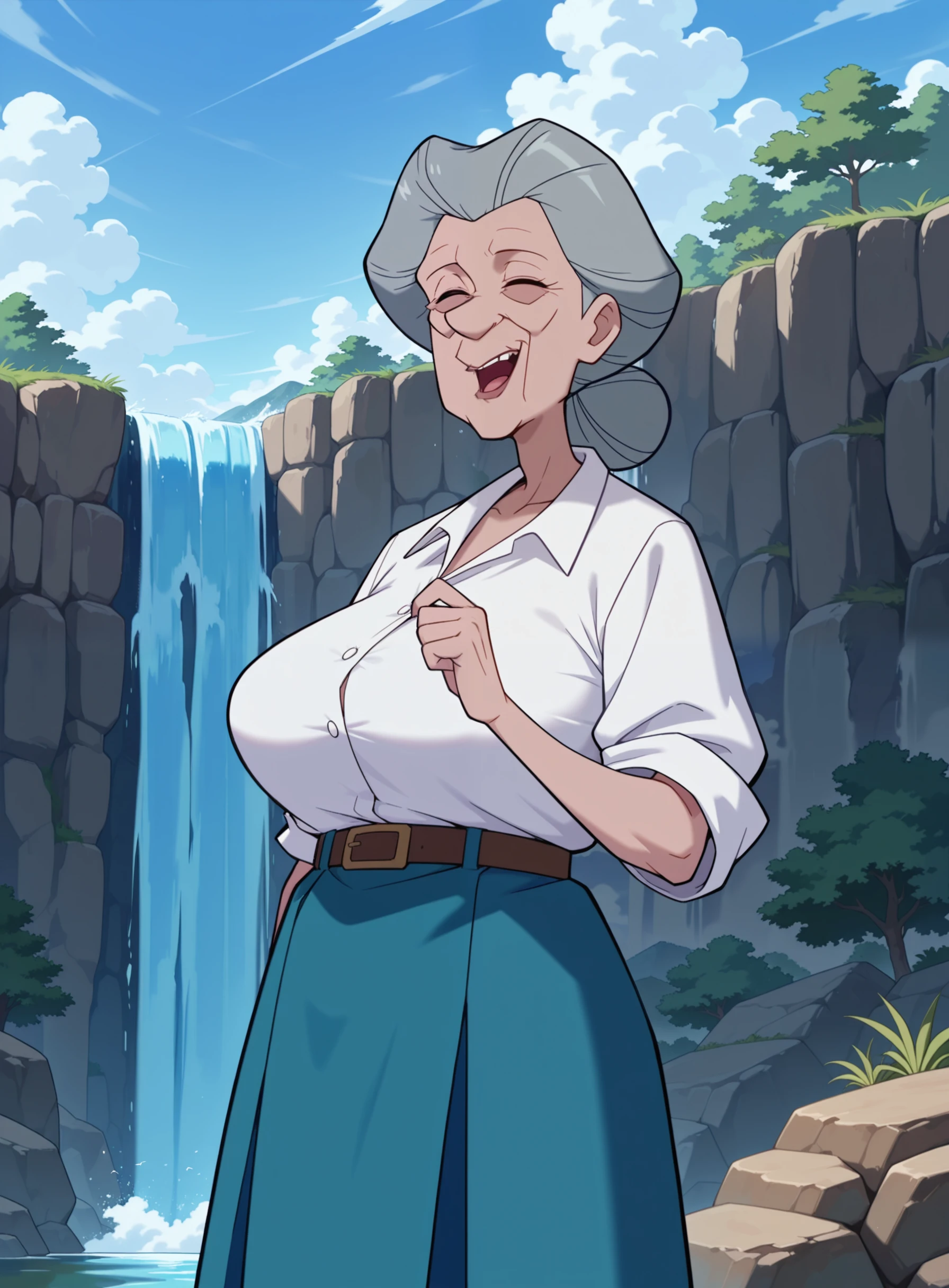 old woman, grey hair, low hair bun, black eyes