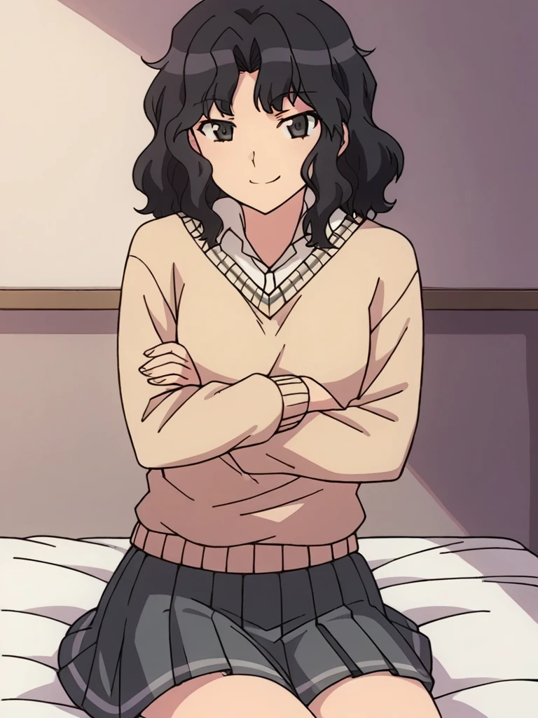 school uniform, grey skirt, beige sweater, long sleeves, collared shirt,