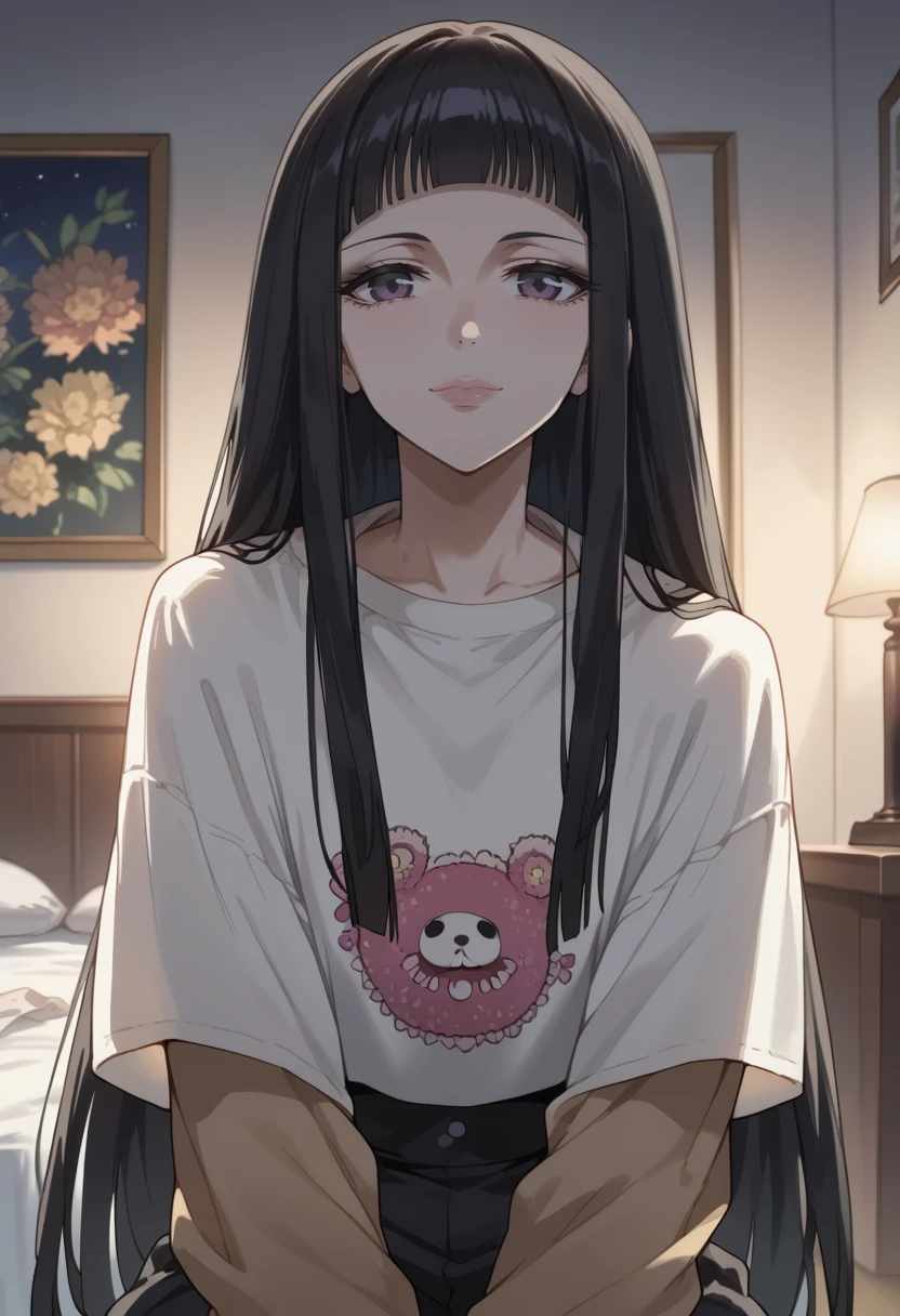 long hair, black hair, purple eyes, arched bangs, hime cut