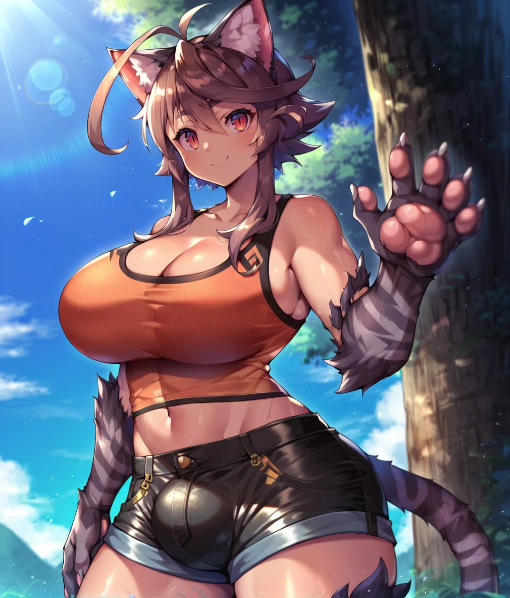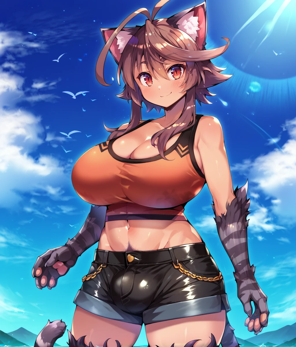 arashi yagatake,solo,futanari,brown hair,cat ears,short hair,long side hair,red eyes,large breasts,animal legs,leg hair,huge ahoge,cat tail,animal hands,