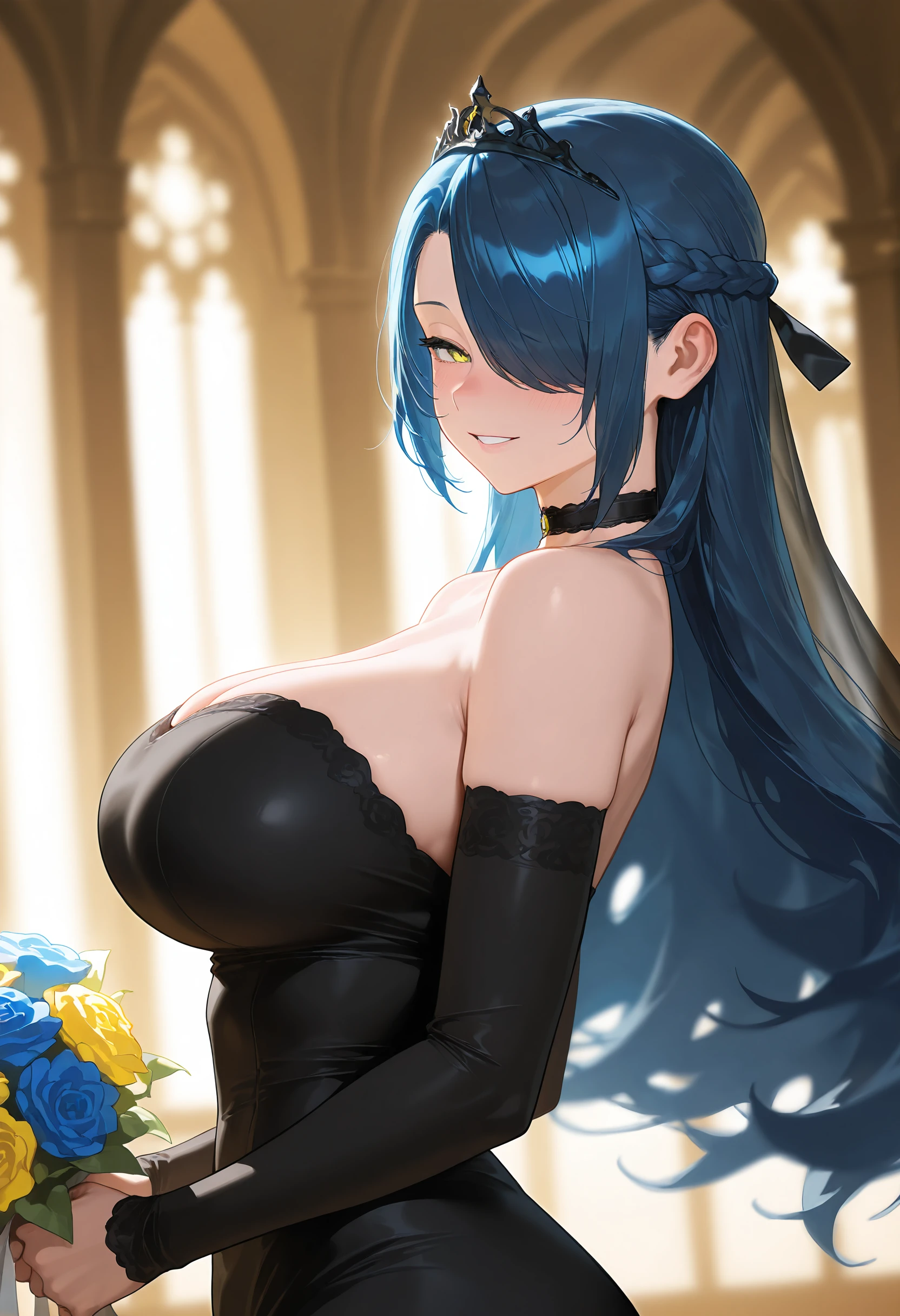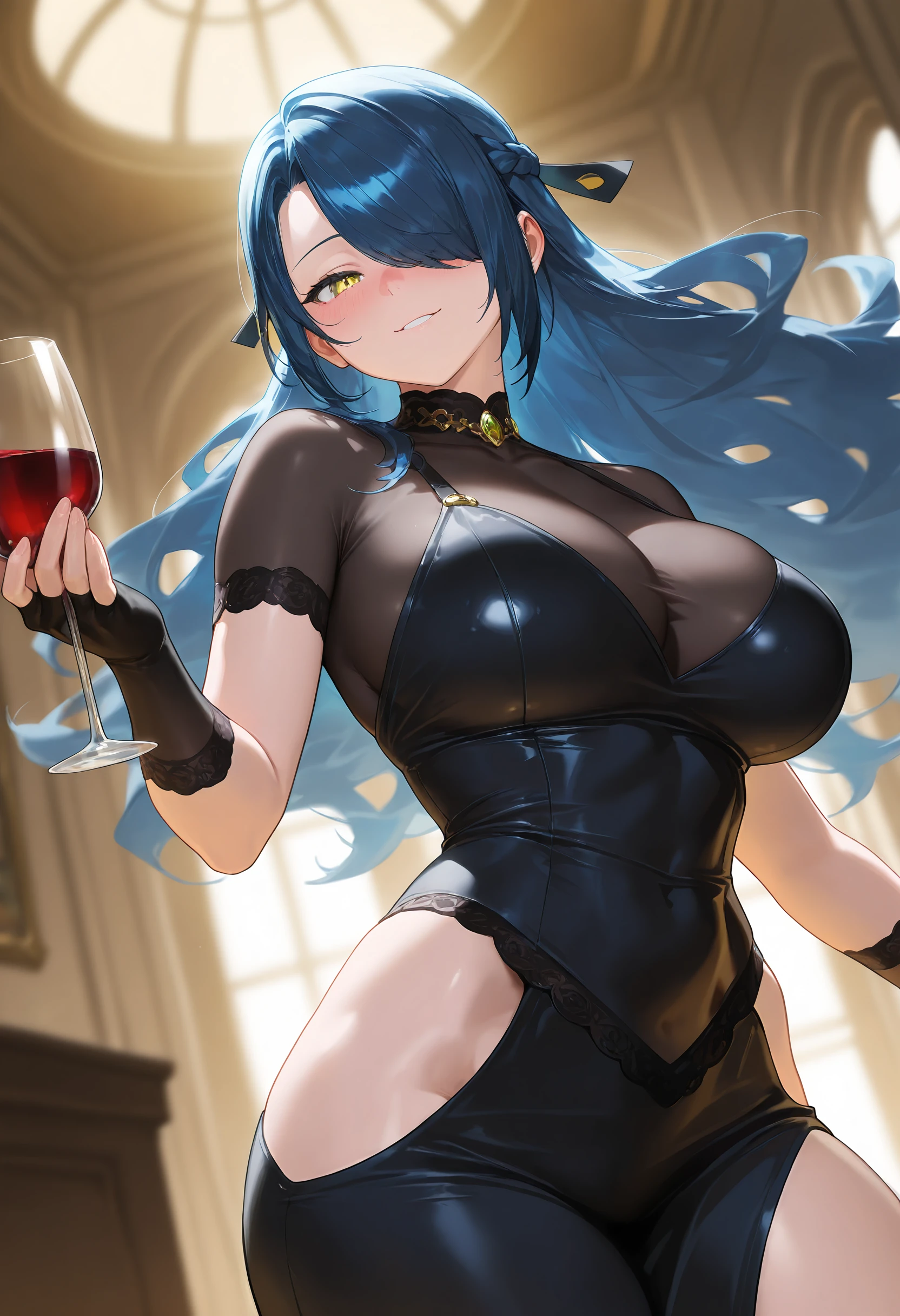 Tags for her look: 1girl, solo, large breasts, long hair, yellow eyes, hair ribbon, French braid, hair over one eye, one eye covered, mature female,