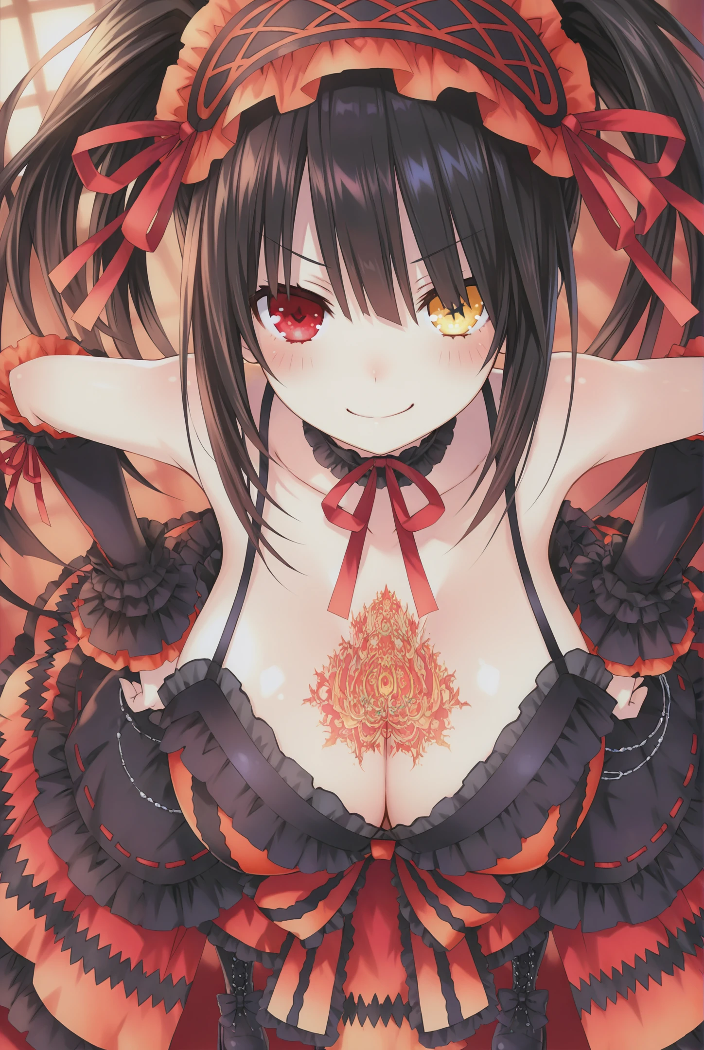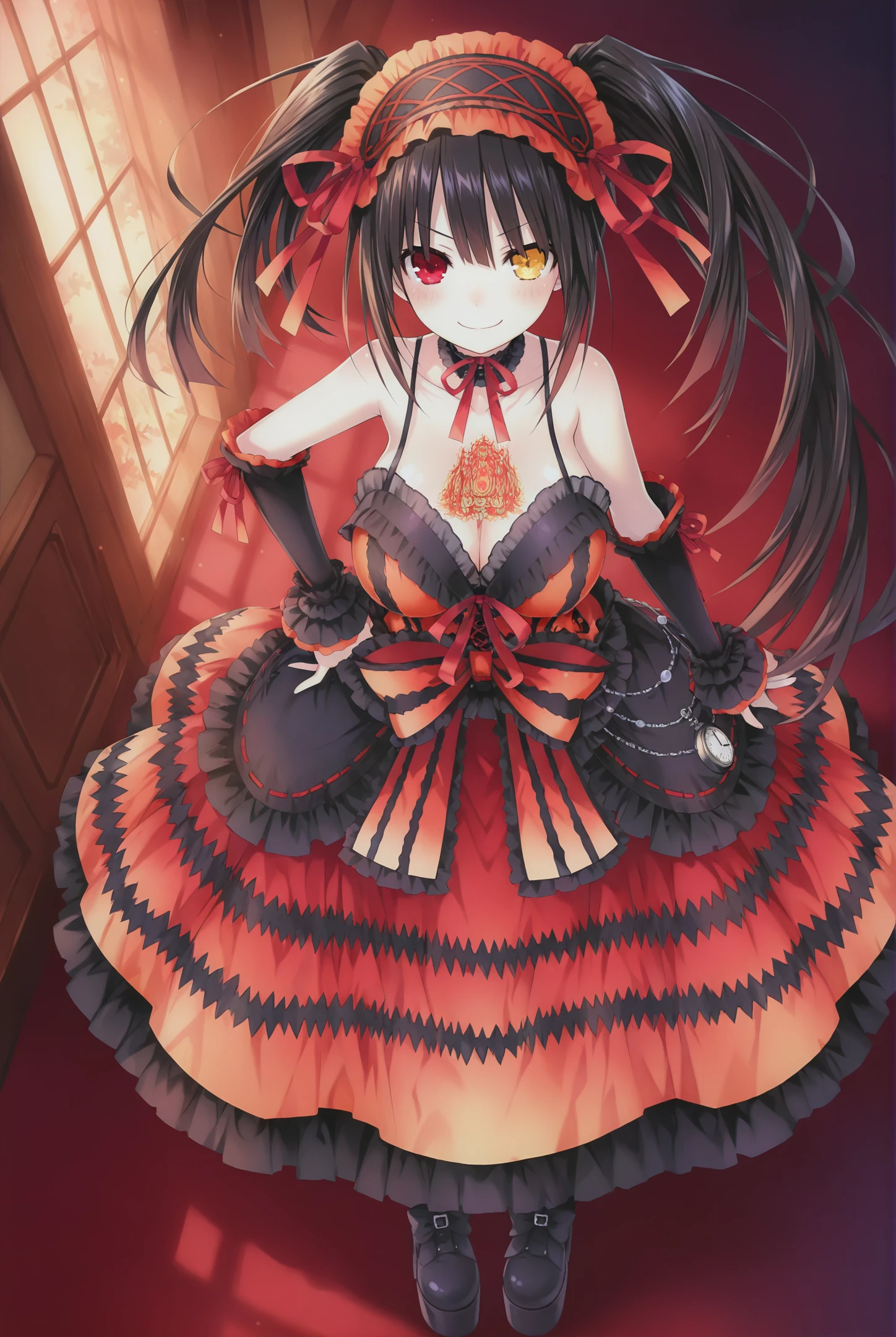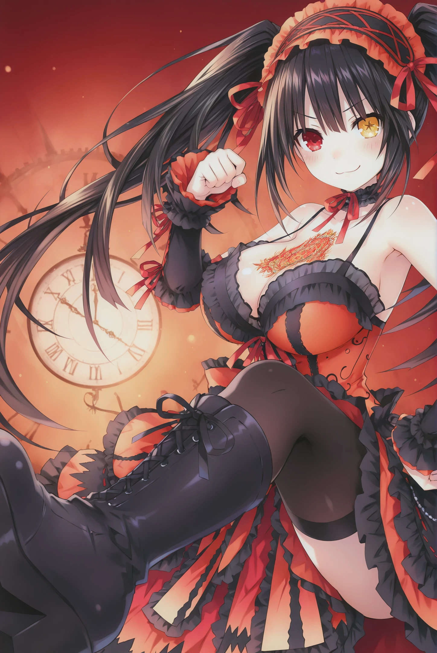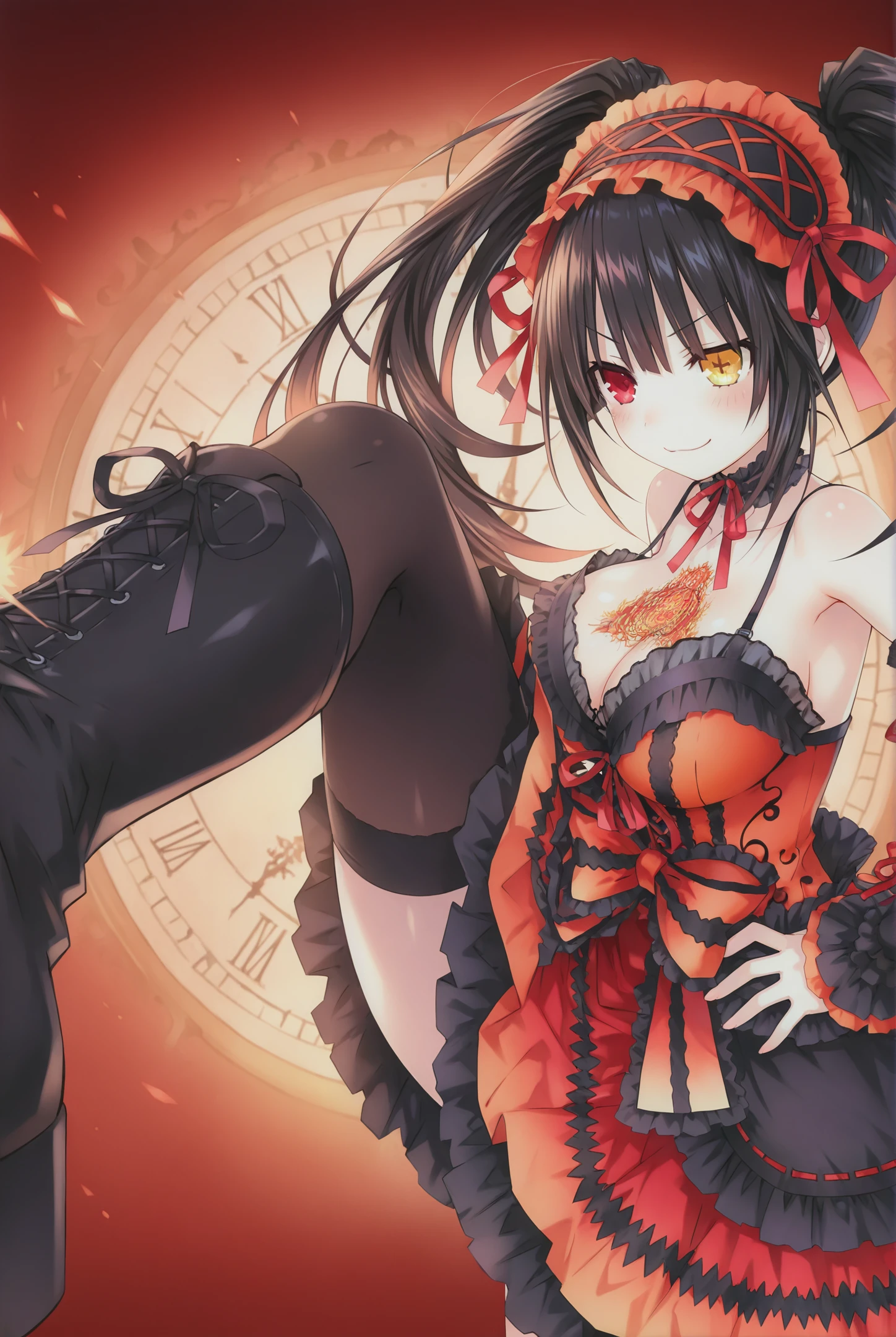 NightmareBlender,1girl,tokisaki kurumi,right_red_eye,left_clock_eye,heterochromia,solo,symbol-shaped pupils,twintails,black hair,dress,platform footwear,yellow eyes,sensitive,hairband,platform boots,uneven twintails,long hair,gothic,asymmetrical hair,black footwear,bare shoulders,detached sleeves,choker,ribbon,spaghetti_strap,bow,pale skin, huge breasts,chest tattoo,cleavage,