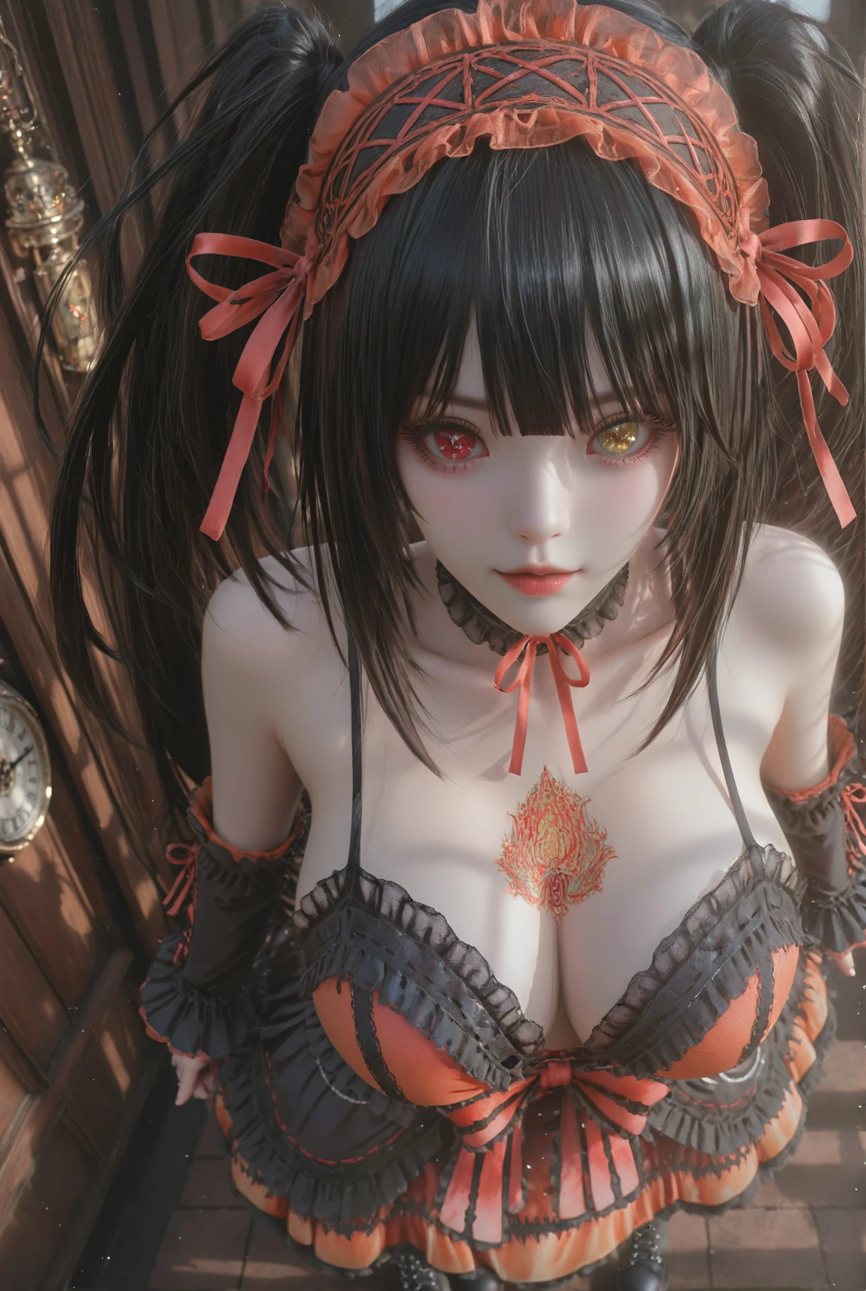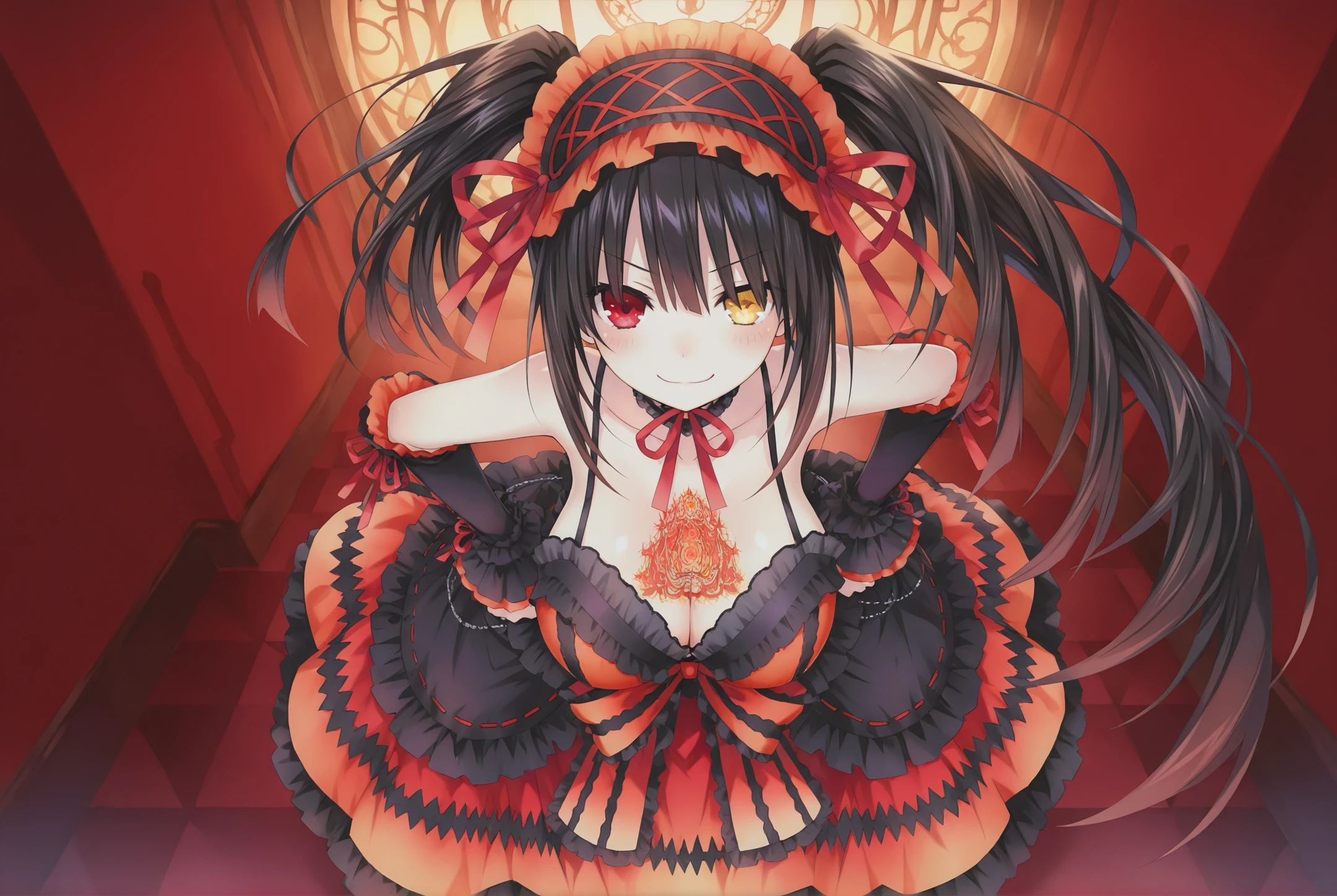 1girl,solo,Nightmare, tokisaki kurumi, clock eyes, black hair, heterochromia, twintails, red eyes, frilled hairband, yellow eyes, long hair, orange dress, choker, red ribbon, sleeveless dress, asymmetrical hair, uneven twintails, detached sleeves, black choker, black sleeves, hair between eyes, bare shoulders,collar, spaghetti strap, frilled hairband,