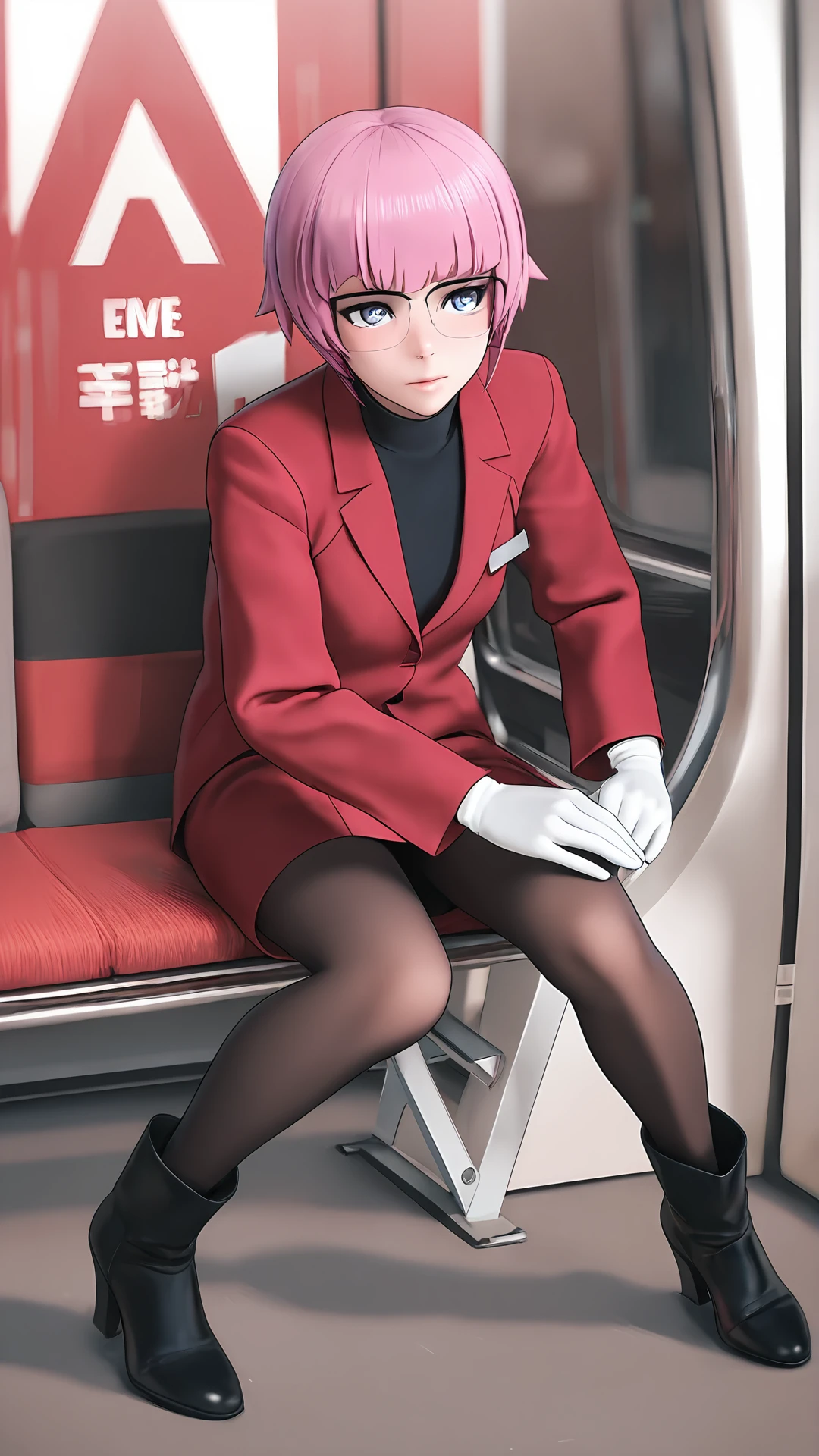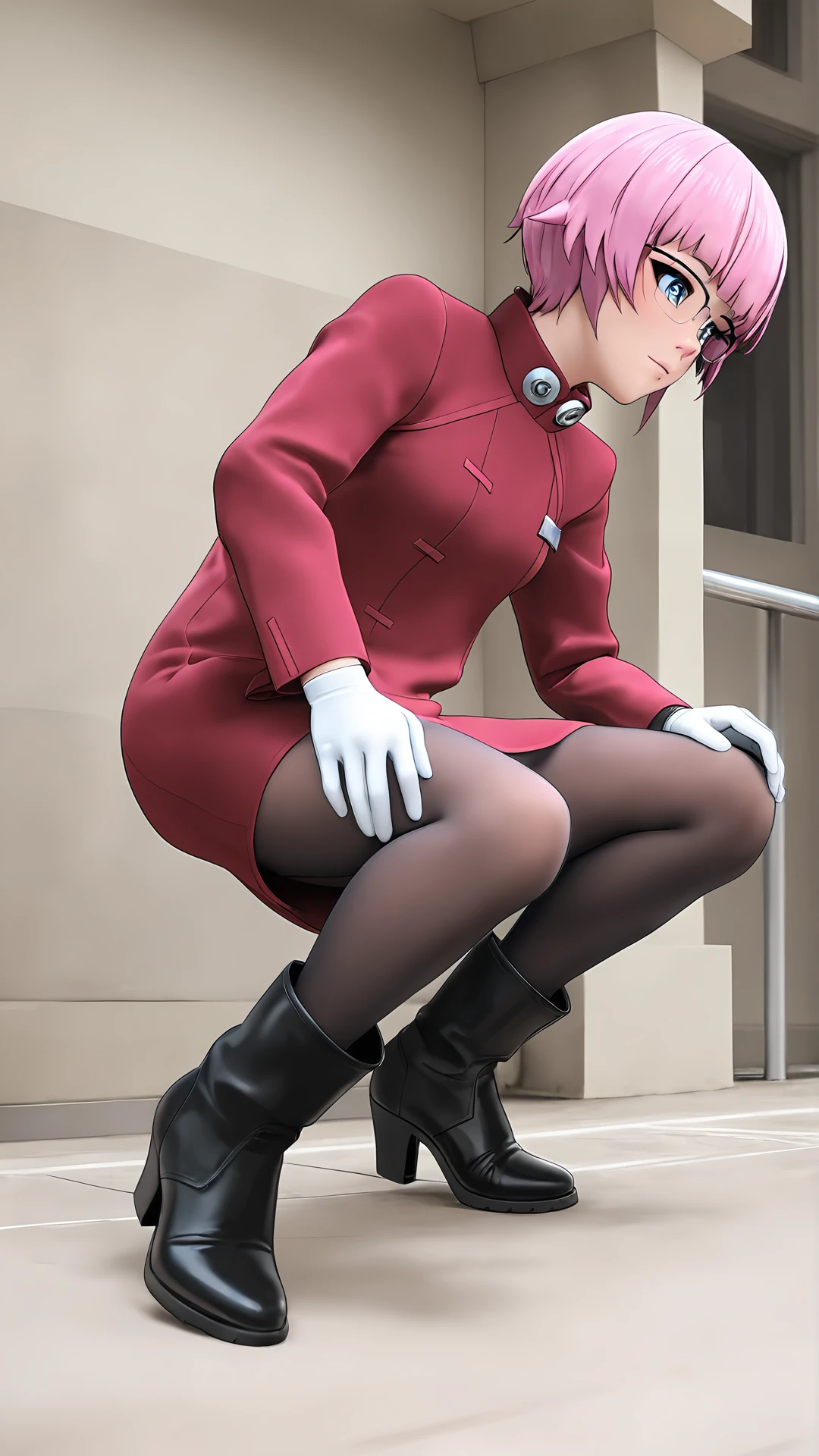 Ezaki Purin,1girl,solo,pantyhose,gloves,pink hair,white gloves,boots,short hair,red jacket,red coat,glasses,black footwear,black pantyhose,high heels,long sleeves,jacket,