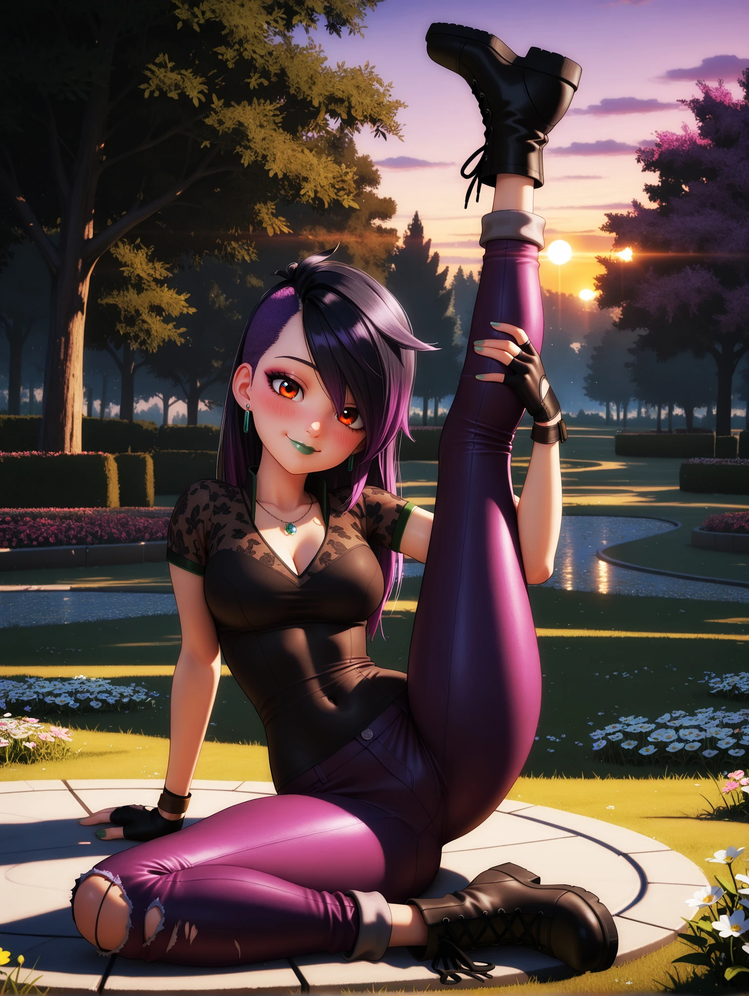 Juleka Prompts : 1girl, long hair, makeup, lipstick, multicolored hair, purple hair, black hair, two-tone hair, brown eyes, green lips, hair over one eye, green nails, medium breast