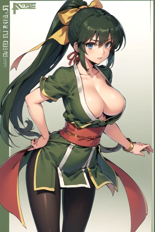 RumikoRaotome, 1girl, solo, long hair, blue eyes, large breasts, ribbon, cleavage, hair ribbon, ponytail, pantyhose, green hair, sash, pelvic curtain, ninja