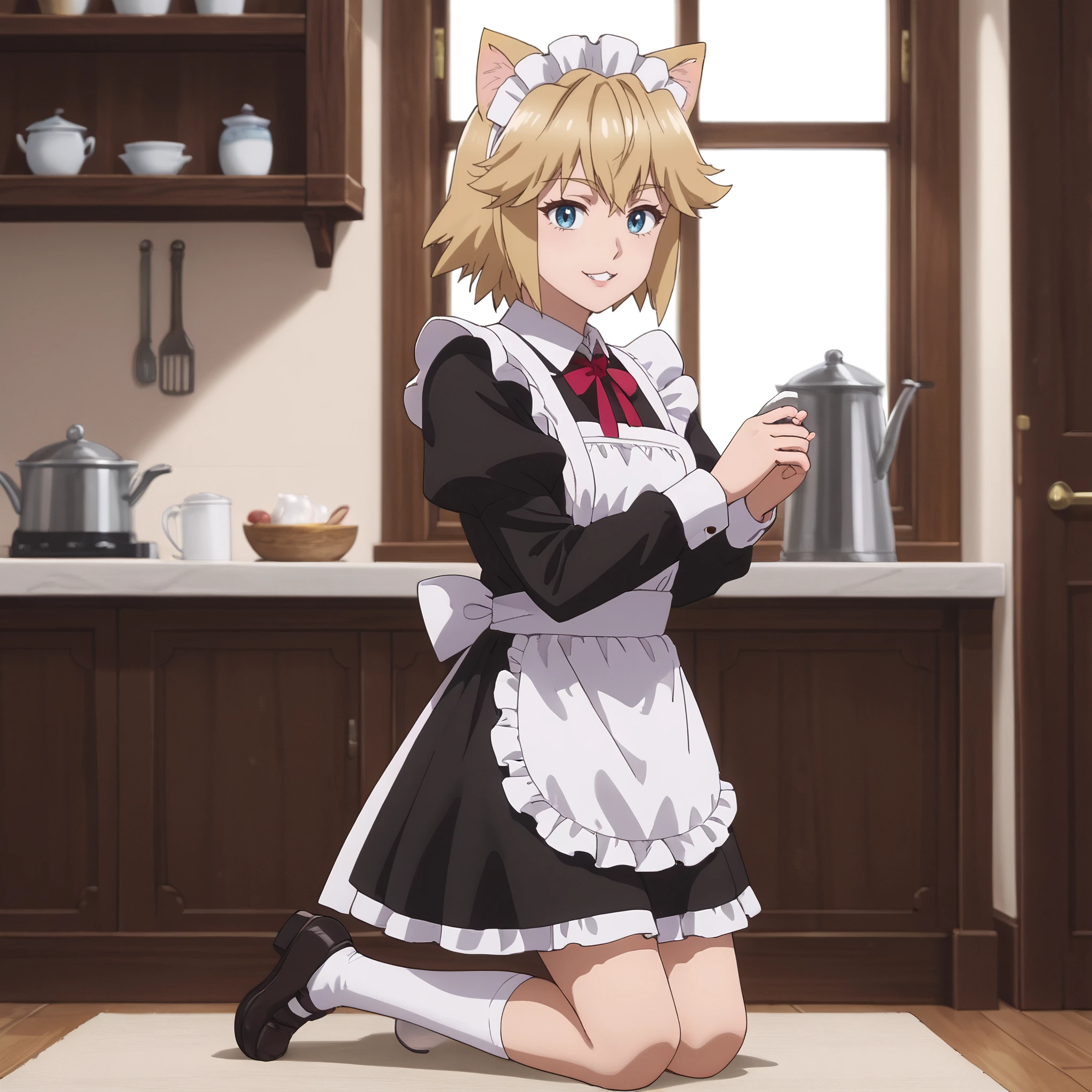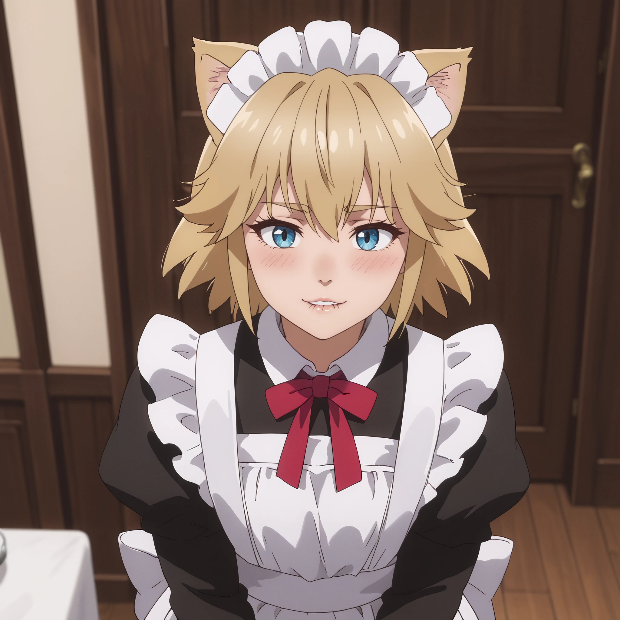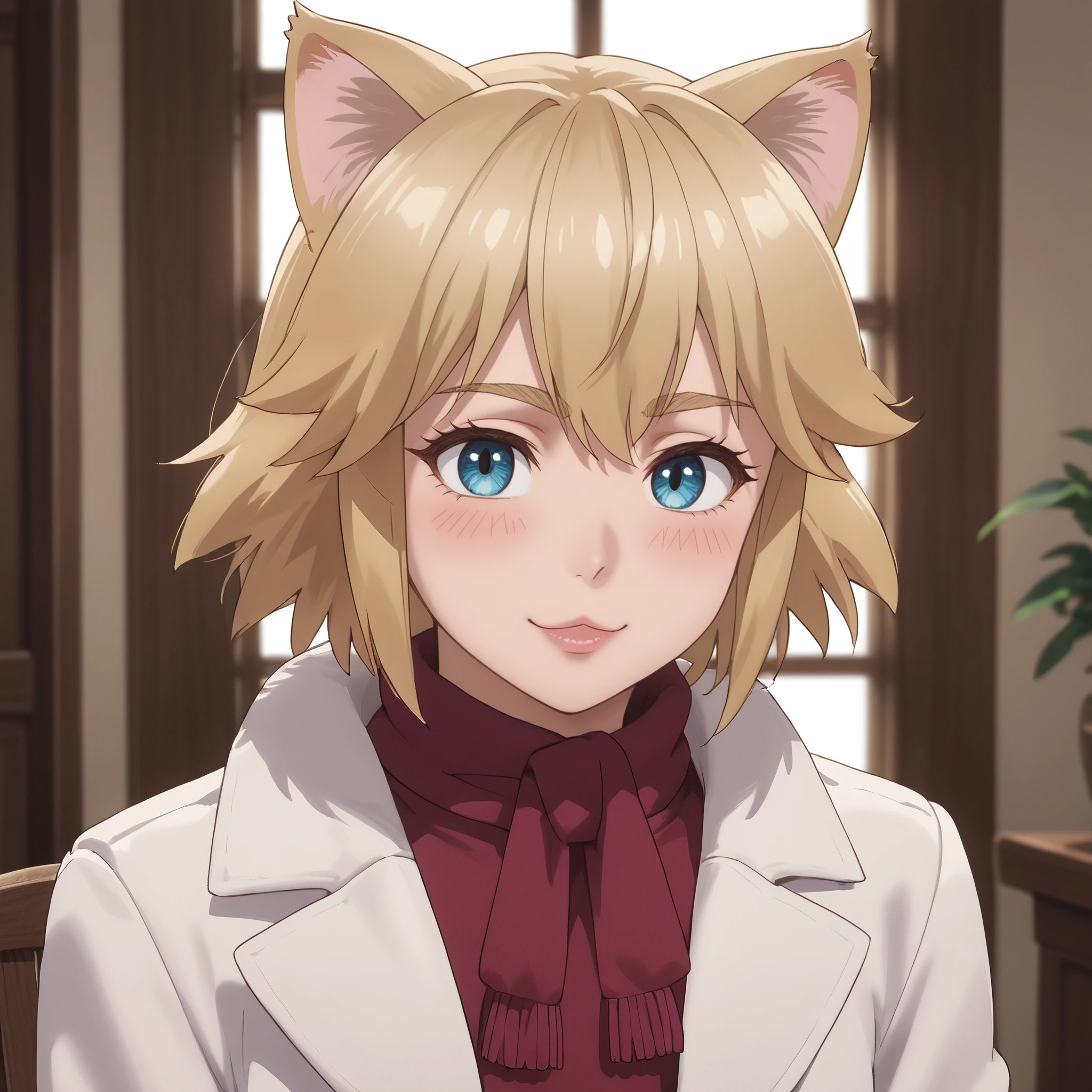 ARTMathilde, blonde hair, eyebrows visible through hair, short hair, blue eyes, bangs, animal ears, cat ears,