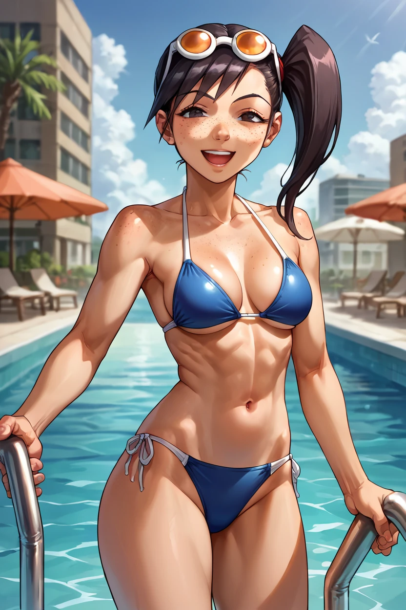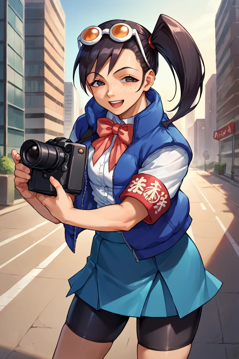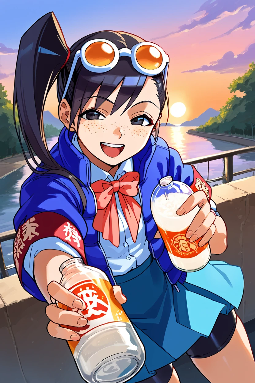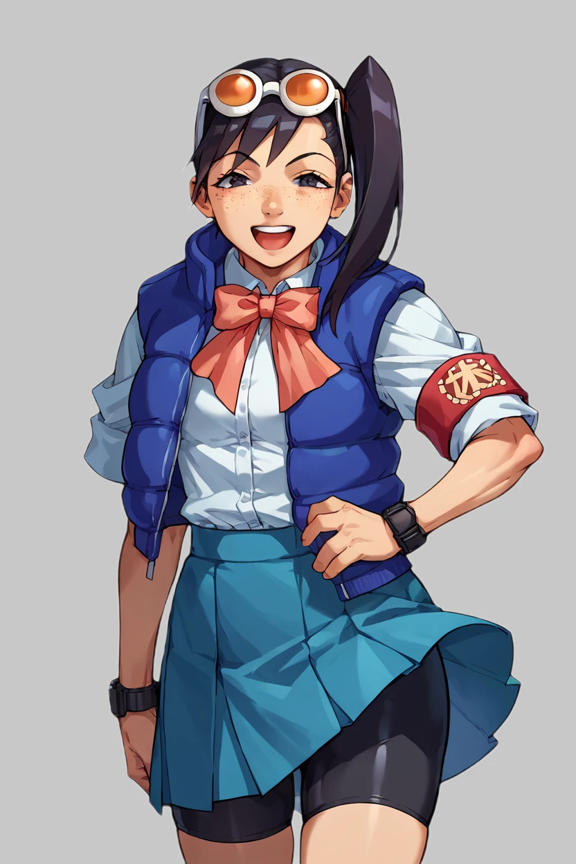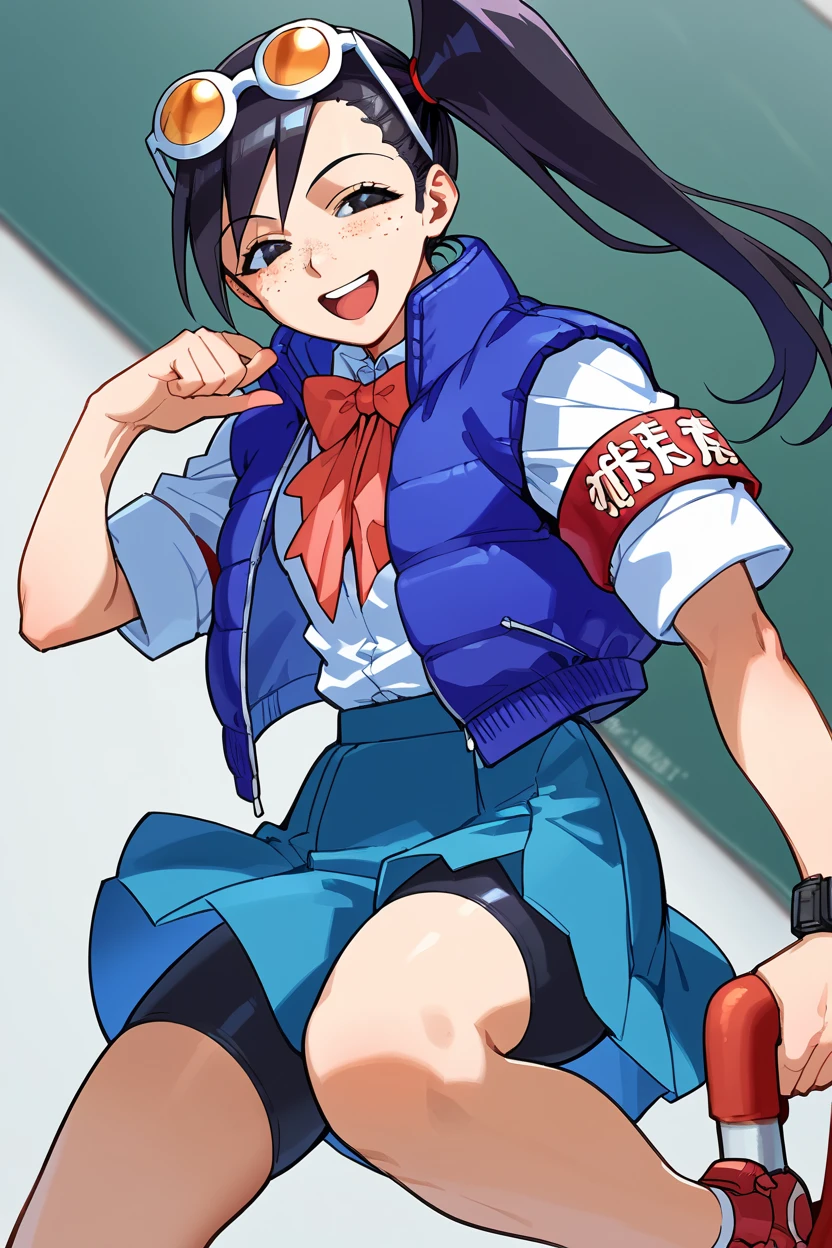 blue jacket, school uniform, bowtie, blue skirt, bike shorts, armband, eyewear on head, black hair, side ponytail, freckles